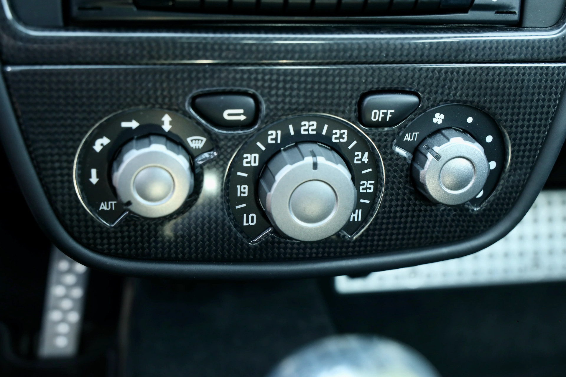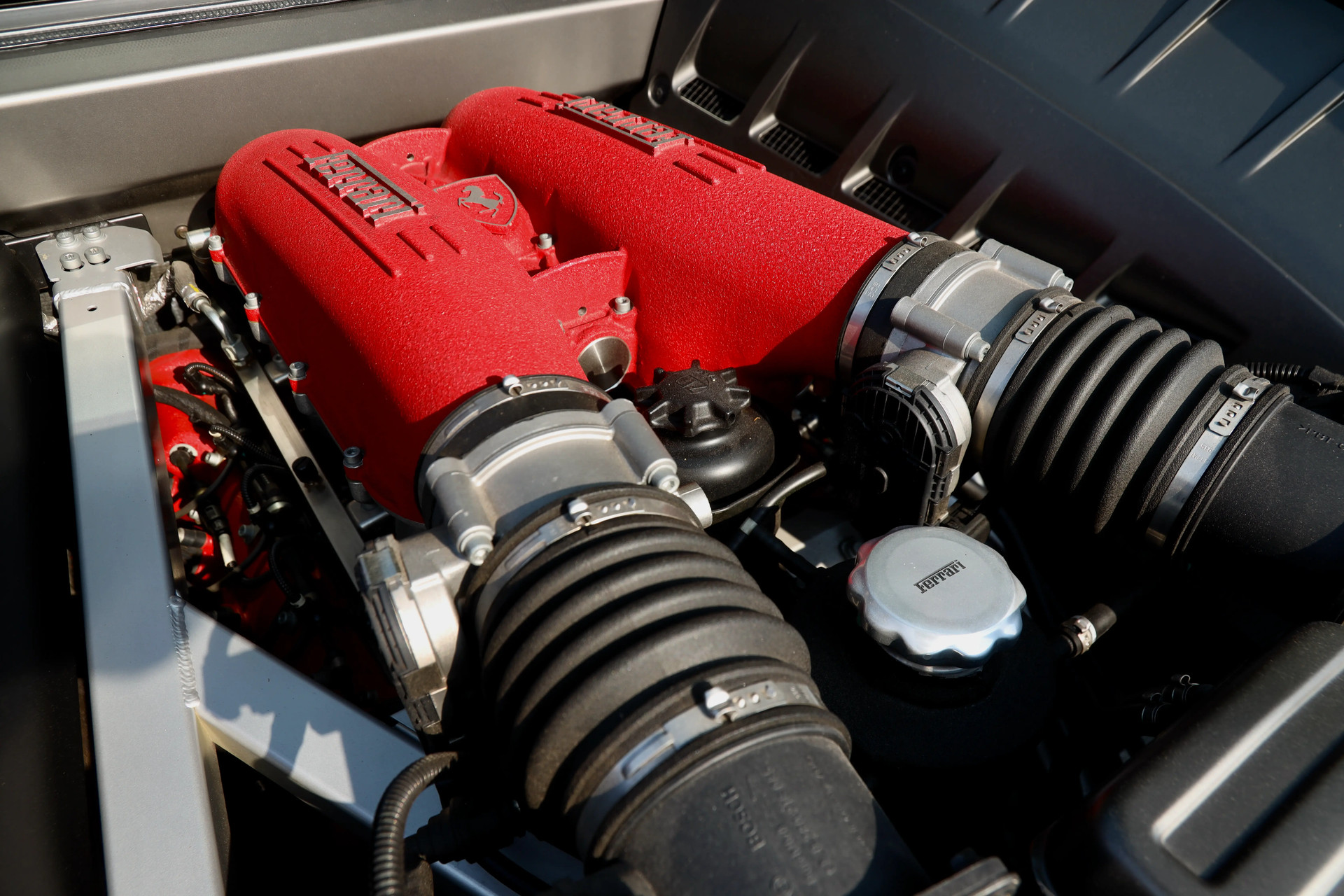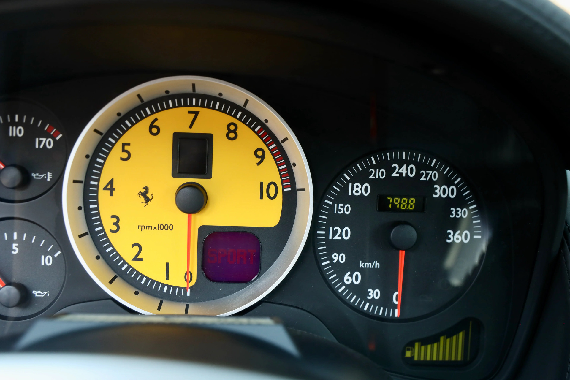 Avec seulement 36 000 kilomètres, cette F430 se présente dans un état que l’on peut qualifier sans exagération de quasi neuf. La peinture brille d’un éclat profond, les coutures des selleries sont impeccables et chaque matériau semble à peine avoir été touché. Les éléments en caoutchouc, les vitrages et les jantes sont irréprochables. Dès que l’on prend place à bord, on perçoit immédiatement la fraîcheur et la préservation de l’habitacle.