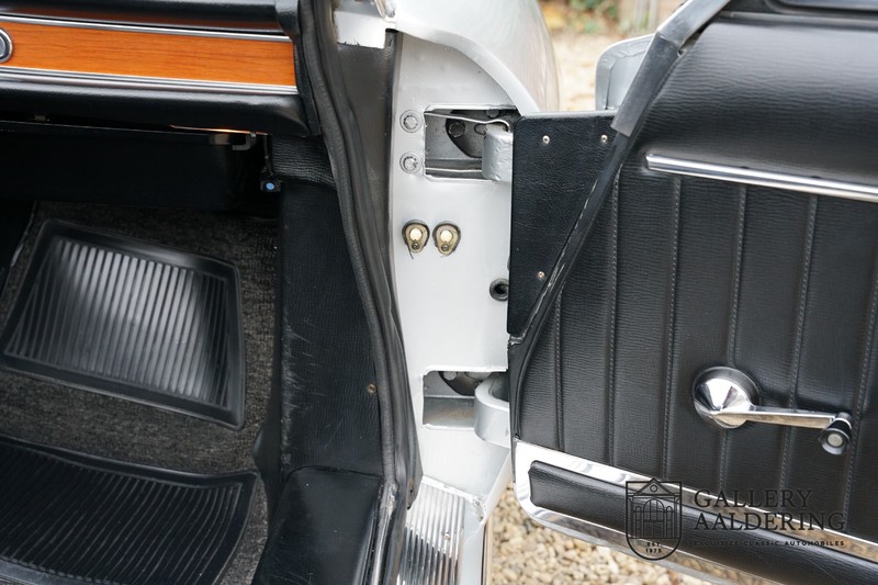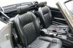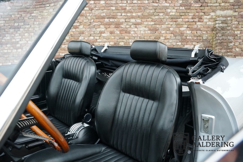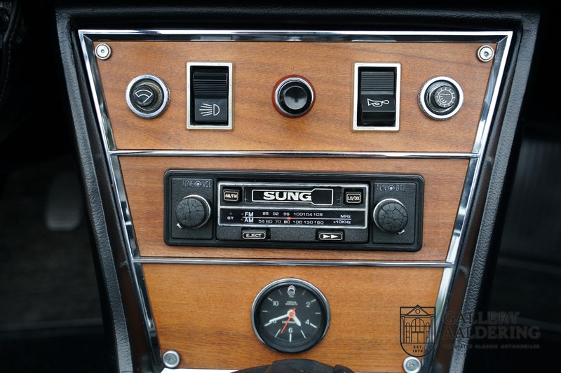 Het interieur verkeert eveneens in topstaat. Het hout op het dashboard ziet eruit als nieuw en ook het driespaaks houten stuurwiel ziet er prachtig verzorgd uit. Het interieur is bekleed met zwartkleurige tapijten en zwart vinyl op de stoelen. Zowel de tapijten als de bekleding op de stoelen zien er prachtig uit en verkeren in topstaat. Ook de bovenzijde van het dashboard ziet er prachtig uit en is vanzelfsprekend volledig vrij van scheuren.