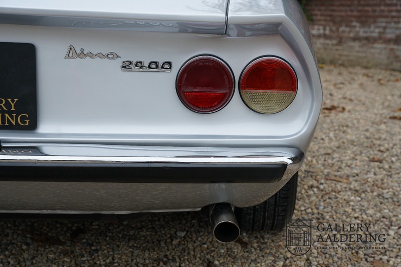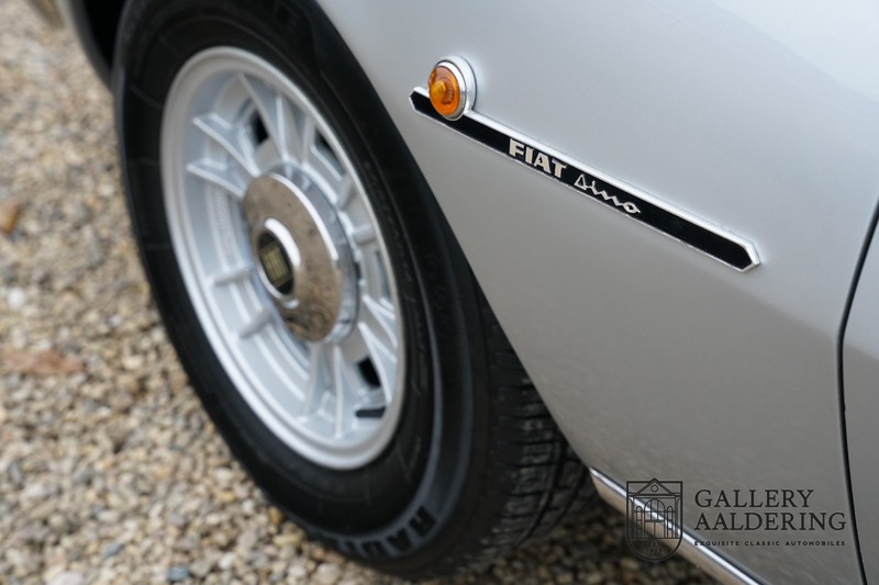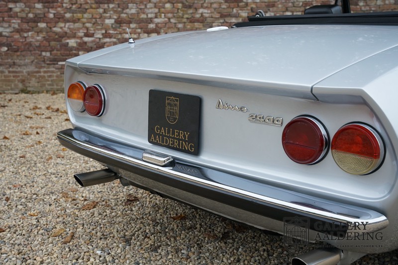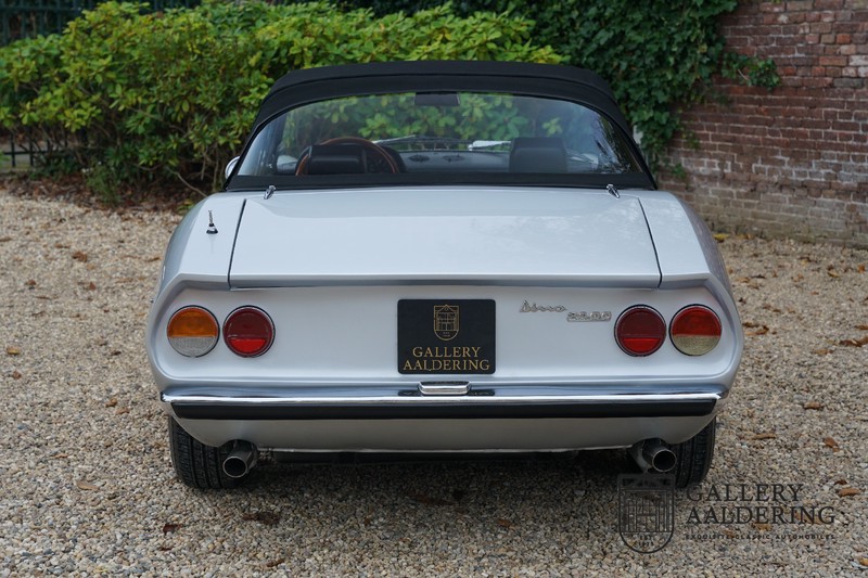 Het betreft hier een auto uit 1971. De 2400 is met slechts 420 gebouwde exemplaren veel zeldzamer dan de veel vaker voorkomende 2000 met haar oplage van 1.100 stuks. Op de teller van dit exemplaar staat nog maar 31.730 kilometer, als we kijken naar de conditie van de auto zou het heel goed mogelijk zijn dat het hier de originele kilometerstand betreft. De carrosserie ziet er prachtig uit met fraai dun plaatwerk en correcte passingen. De metallic zilver lak verkeert in zeer goede staat en staat de auto prachtig. De Dino Spider staat op correcte crommodora wielen met daaromheen goede banden in de juiste maten. Verder vallen de originele uitlaten op aan de achterzijde.