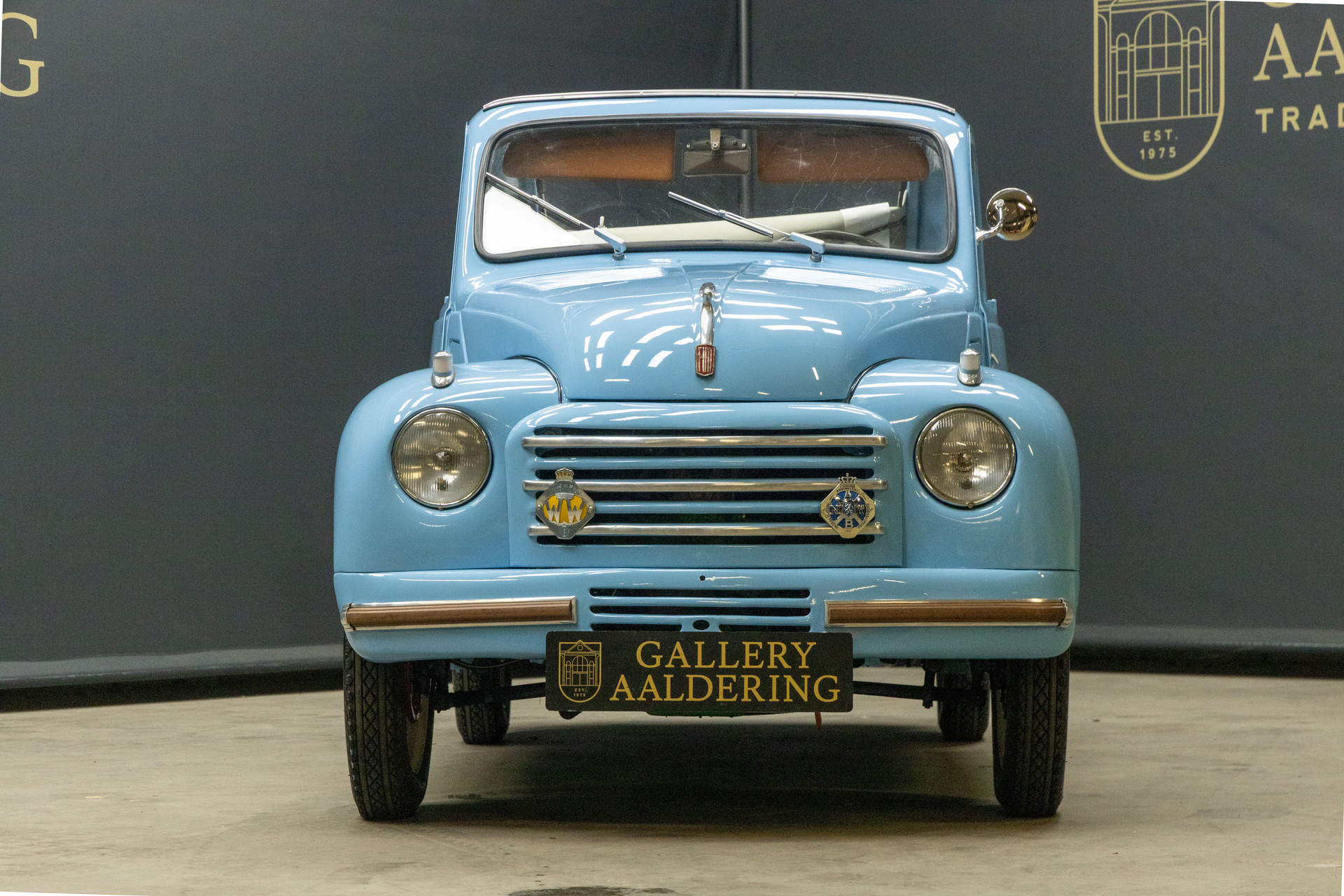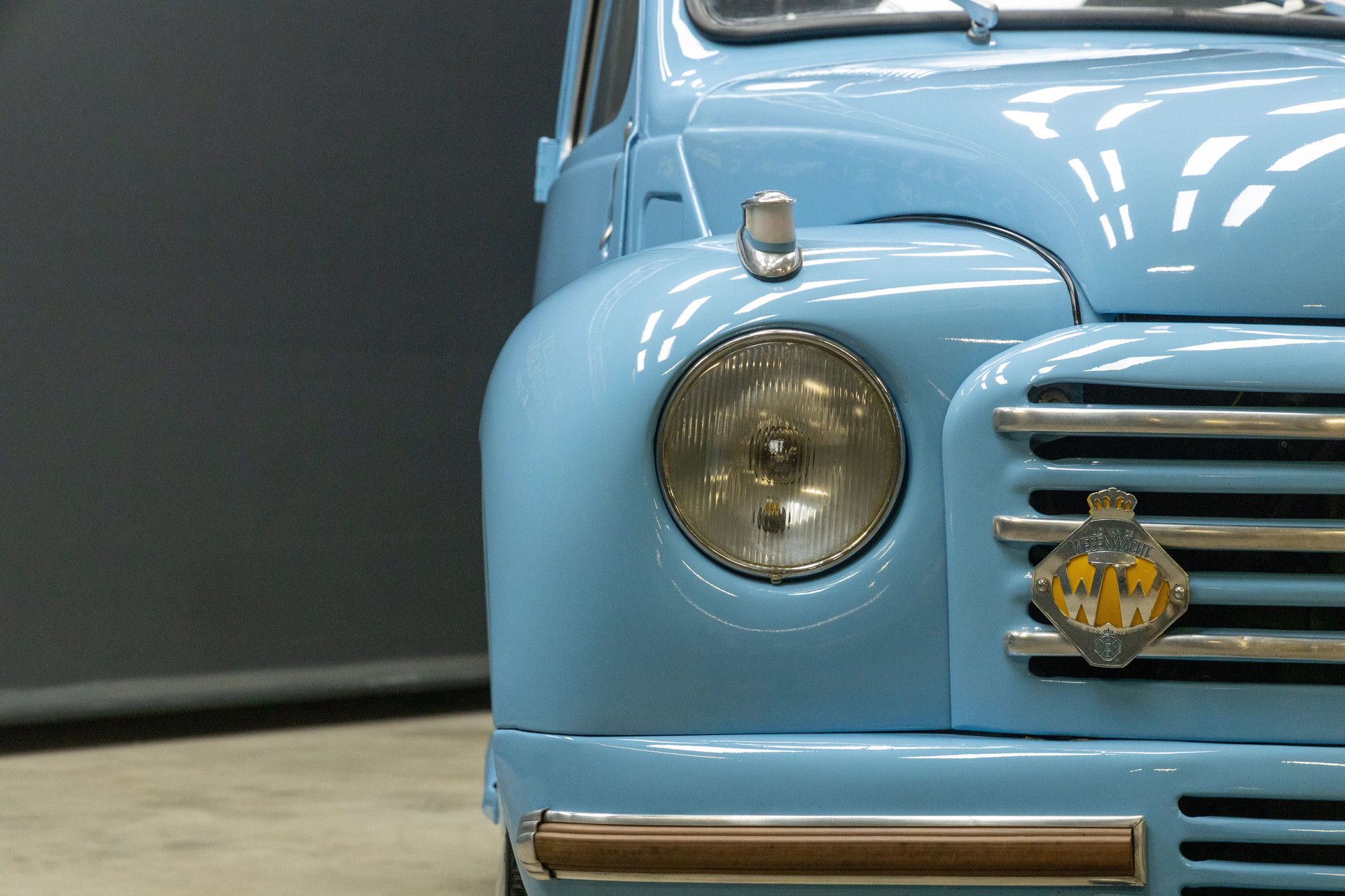 Dit exemplaar komt uit het eerste productiejaar van de 500C en is uitgevoerd in het verfijnde acqua blu, gecombineerd met een bruine stoffen vouwdak. Een kleurencombinatie die perfect past bij het karakter van de auto: licht, vriendelijk en tijdloos. De carrosserie werd in het verleden gerestaureerd en opnieuw gespoten, met een mooi en verzorgd resultaat. Geen over-gerestaureerd museumstuk, maar een eerlijke klassieker die uitnodigt om gebruikt en verder verfijnd te worden.