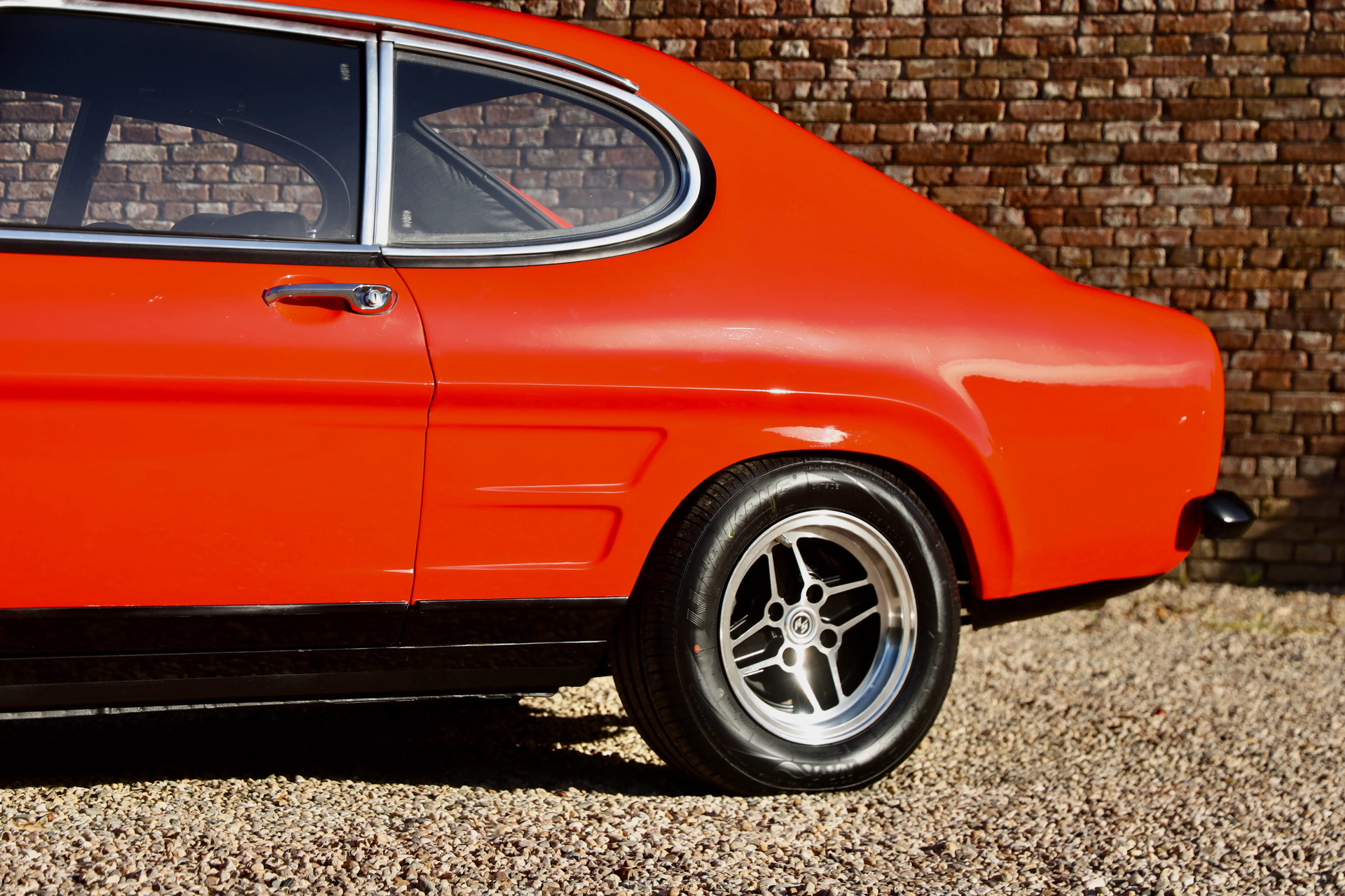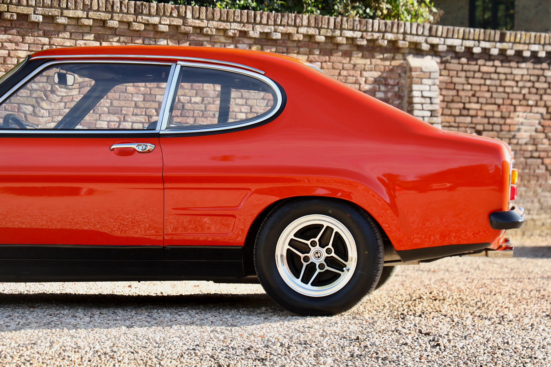 Deze Capri werd in 1973 nieuw geleverd in Frankrijk, in de regio van Clermont-Ferrand, en is sindsdien uitzonderlijk goed bewaard gebleven. De carrosserie werd volledig gerestaureerd en verkeert vandaag de dag in een bijzonder solide conditie met correcte passingen – precies zoals het hoort bij een zorgvuldig uitgevoerde restauratie.