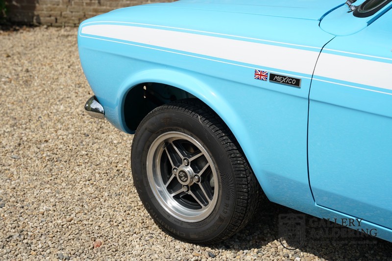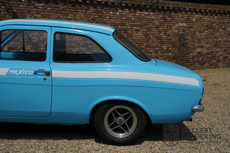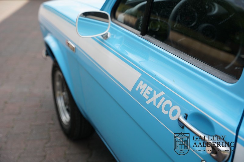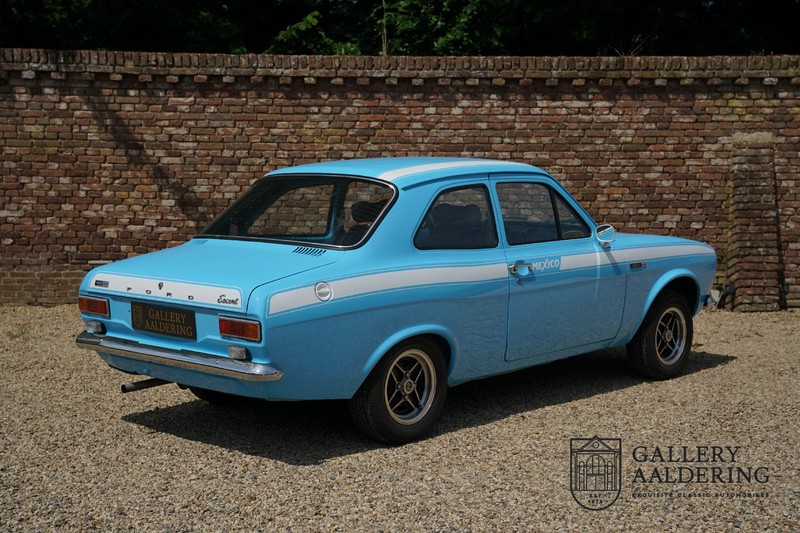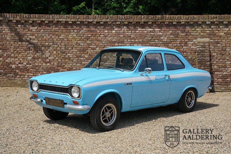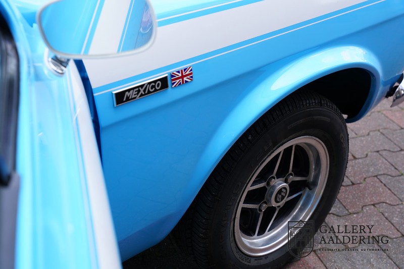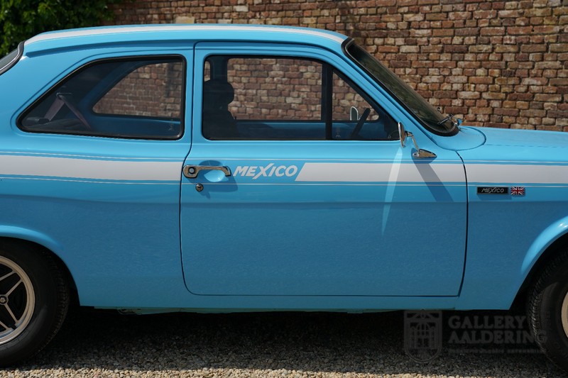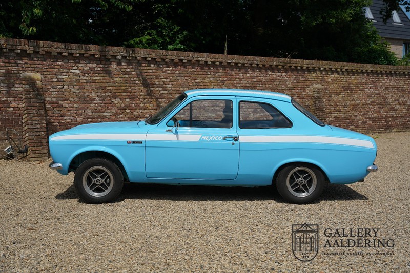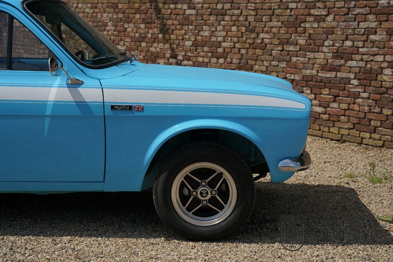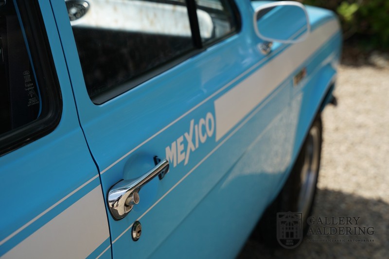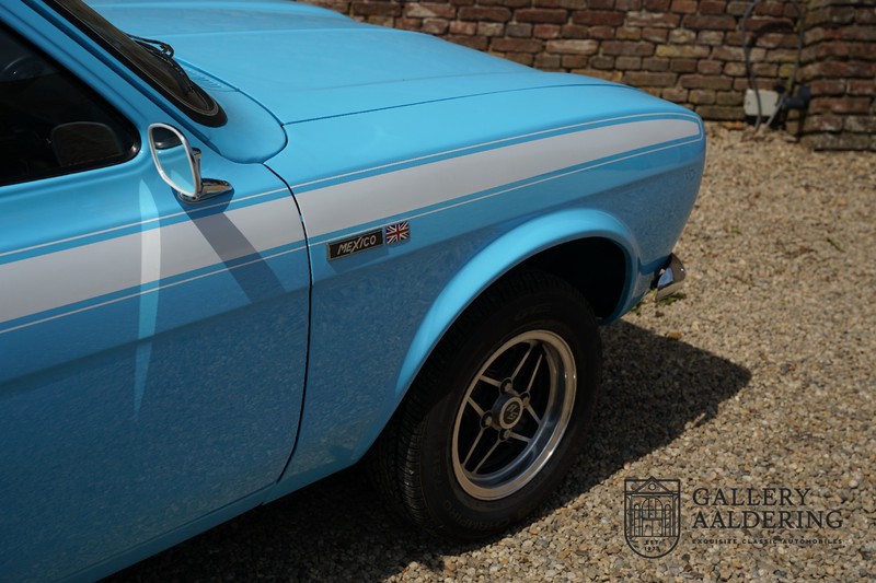 The Mexico was a special edition of the Ford Escort Mk1, celebrating Ford’s successes in the London to Mexico rally. In 1970 Hannu Mikkola and Gunnar Palm were the victorious champions of this extremely heavy rally. Ford’s marketing department saw a golden opportunity to turn this rallying triumph into folding money in the showroom. A special edition Ford Escort was commissioned to celebrate this success. Ford’s racing department was involved in the development of the Mexico and looking at the number of options available at the time it is no small wonder the Mexico became such an enormous sales winner. The Mexico was fitted with a 4-cylinder 1600cc with a single overhead camshaft good for 86 PS. In todays money that might not seem impressive, however with it short ratio manual gearbox and a curb weight of just 850 kg, the Mexico was able to achieve a very representable performance. The Mexico is still able to hit very acceptable heights, just imagine how that would have felt in the 70’s! Now let us just reflect on the number of available options then. Today it would be completely unthinkable a family car manufacturer would allow the buyer the option of dressing up the car in order to immediately be able to take to the rally tracks, and yet that is precisely what Ford did to the Mexico. It will come as no surprise that many bought the Mexico as a rally car. You only had to make a few finishing touches to enter into the fray. More than 10,000 Mexico’s were sold. You might think that does not make it into a rare classic beast. Nothing is further from the truth. Rally versions of the Mexico often did not survive the first year or at best a few years. Many Ford Mexico’s died in harness. They were literally driven to their deaths. If we were to compliment this specific example, then the biggest compliment would be that this level of restoration does not belong to this type of car. This ford Escort has been so beautifully restored in such a fashion only seen with cars costing a multitude of this Ford. This car was literally dismantled, right down to the very last screw before being most sympathetically reassembled. Clearly the work of people with absolute specialist knowledge which matches that of any top restorer. The bodywork is as expected absolutely pristine. It has nice and thin, correctly aligned panelwork. The doors close with a characteristic click of a showroom fresh car. The car had a high quality respray in “Olympic Blue” finish. The paintwork brilliantly jumps out at you the moment you set eyes on her. The Rs rims have been recently resprayed and look perfect Underneath the condition is at least as good as on top. The original stickers were reattached after the respray. The interior has been fully reupholstered. The bucket seats are comfortable as well as supportive. The spartan dashboard marvels in simple functionality. There is not a switch or control without an obvious use to be found. If only modern cars were so easy. The neat new carpets also have been perfectly fitted. The original steering wheel looks great. Another redeeming feature is you immediately get a great driving position, inviting you to sit right and drive to your hearts content. Driving to ones hearts content is this car’s claim to fame. 86 Ps does not sound much in todays money but considering the fact the Ford Escort Mexico on weights 850 kg it starts to become a more attractive proposition. The engineers did a marvellous job with the car’s road handling, which in our case is emphasized by the wholly new suspension fitted. Every bush, shock breaker and spring is new. The Escort handles beautifully tight, inviting to get the maximum out of the package. It has a 1.6 litre OHV couples to a manual 4-speed gearbox. The accurate transmission helps the engine run through the revs brilliantly. Both were completely rebuilt and just as the exterior are in peak shape. A Ford Escort Mexico is a rare sight these days and still enjoys enormous status under the devotees of fast Fords. No surprises there as in contrast to modern cars this one runs on pure charm as well as petrol. A disarmingly effective little street monster leaving its new owner with a brad grin with every mile. Let’s face it: if you are looking for a Ford Escort Mexico would you not want the best on the market?