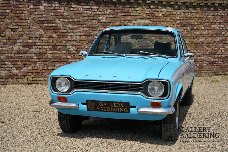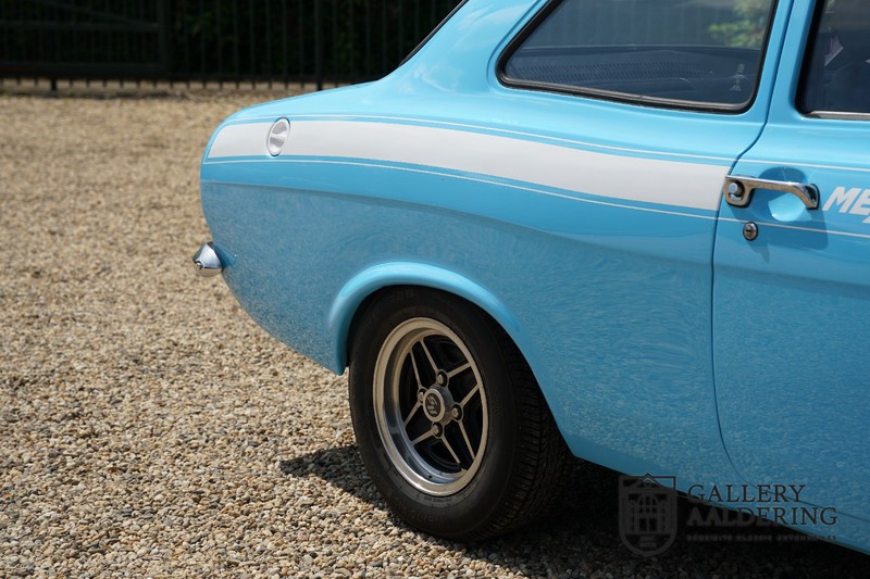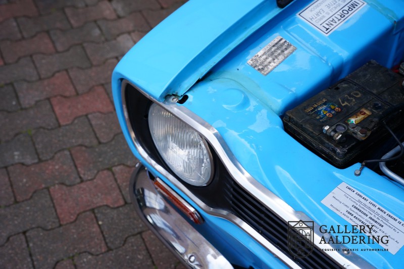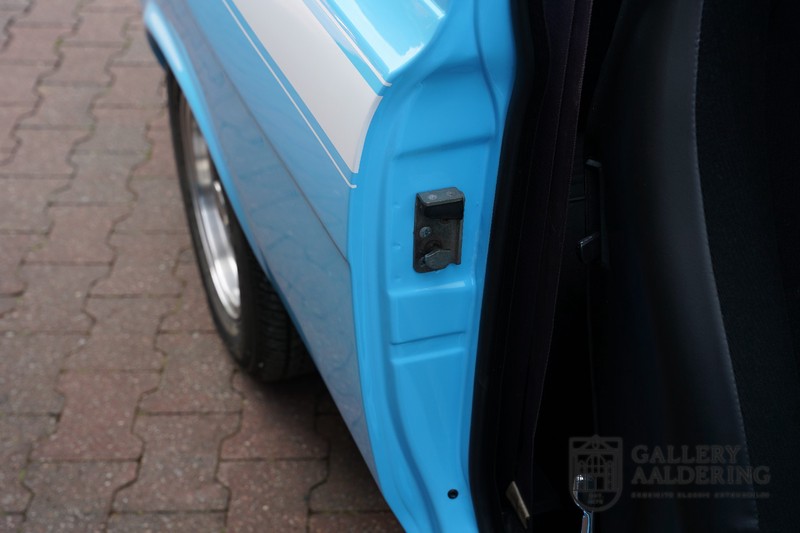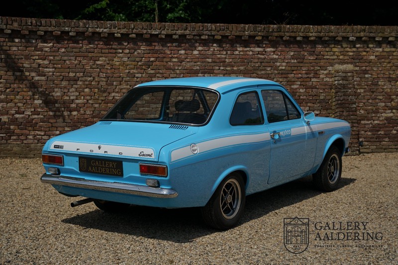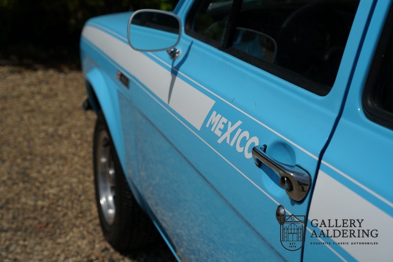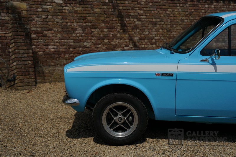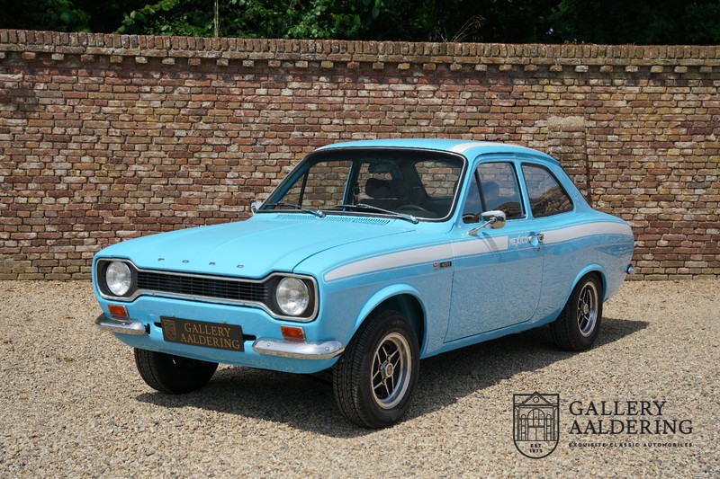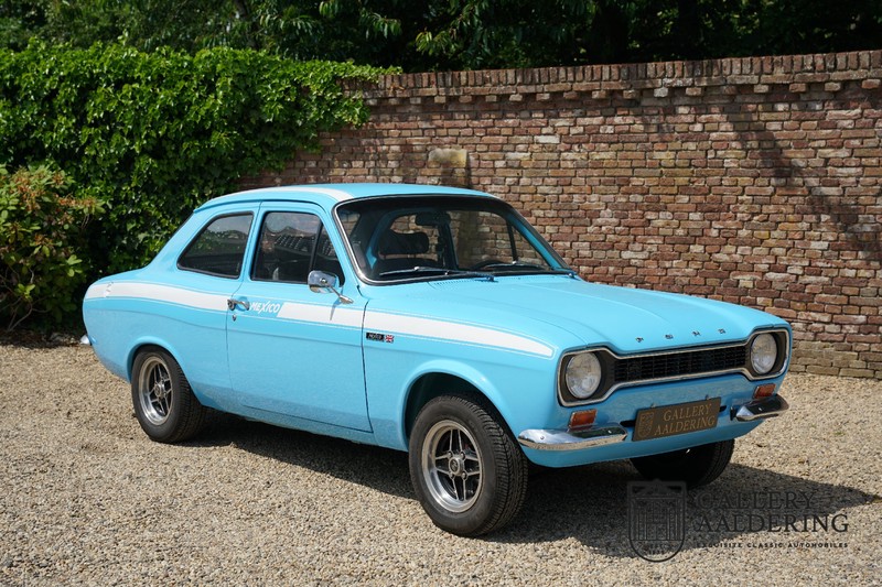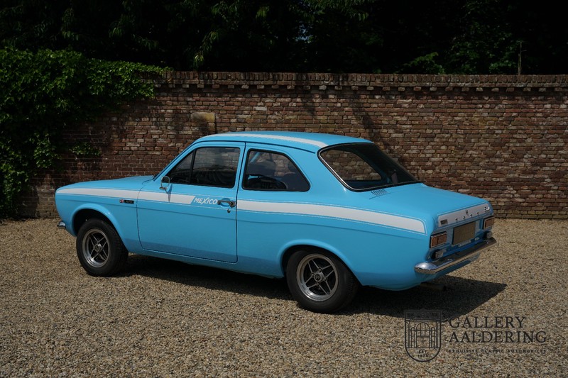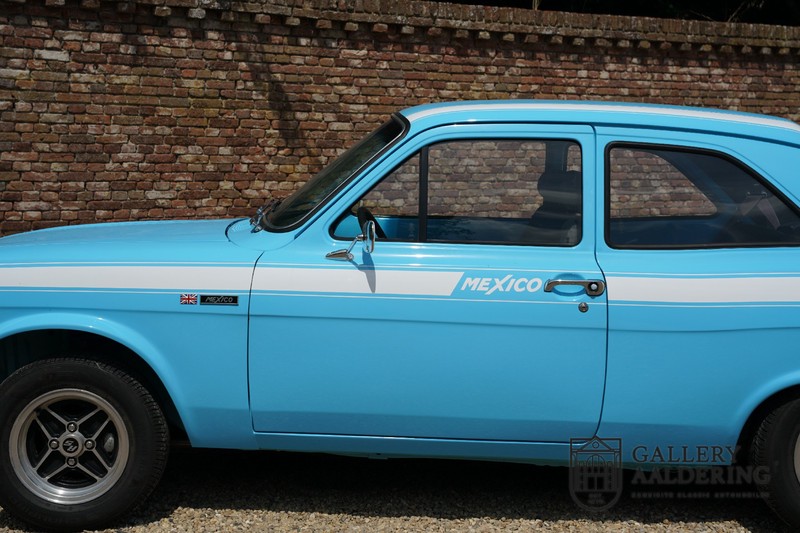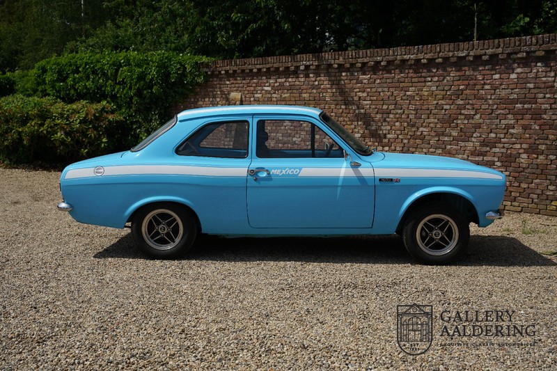 The Mexico was a special edition of the Ford Escort Mk1, celebrating Ford’s successes in the London to Mexico rally. In 1970 Hannu Mikkola and Gunnar Palm were the victorious champions of this extremely heavy rally. Ford’s marketing department saw a golden opportunity to turn this rallying triumph into folding money in the showroom. A special edition Ford Escort was commissioned to celebrate this success. Ford’s racing department was involved in the development of the Mexico and looking at the number of options available at the time it is no small wonder the Mexico became such an enormous sales winner. The Mexico was fitted with a 4-cylinder 1600cc with a single overhead camshaft good for 86 PS. In todays money that might not seem impressive, however with it short ratio manual gearbox and a curb weight of just 850 kg, the Mexico was able to achieve a very representable performance. The Mexico is still able to hit very acceptable heights, just imagine how that would have felt in the 70’s! Now let us just reflect on the number of available options then. Today it would be completely unthinkable a family car manufacturer would allow the buyer the option of dressing up the car in order to immediately be able to take to the rally tracks, and yet that is precisely what Ford did to the Mexico. It will come as no surprise that many bought the Mexico as a rally car. You only had to make a few finishing touches to enter into the fray. More than 10,000 Mexico’s were sold. You might think that does not make it into a rare classic beast. Nothing is further from the truth. Rally versions of the Mexico often did not survive the first year or at best a few years. Many Ford Mexico’s died in harness. They were literally driven to their deaths. If we were to compliment this specific example, then the biggest compliment would be that this level of restoration does not belong to this type of car. This ford Escort has been so beautifully restored in such a fashion only seen with cars costing a multitude of this Ford. This car was literally dismantled, right down to the very last screw before being most sympathetically reassembled. Clearly the work of people with absolute specialist knowledge which matches that of any top restorer. The bodywork is as expected absolutely pristine. It has nice and thin, correctly aligned panelwork. The doors close with a characteristic click of a showroom fresh car. The car had a high quality respray in “Olympic Blue” finish. The paintwork brilliantly jumps out at you the moment you set eyes on her. The Rs rims have been recently resprayed and look perfect Underneath the condition is at least as good as on top. The original stickers were reattached after the respray. The interior has been fully reupholstered. The bucket seats are comfortable as well as supportive. The spartan dashboard marvels in simple functionality. There is not a switch or control without an obvious use to be found. If only modern cars were so easy. The neat new carpets also have been perfectly fitted. The original steering wheel looks great. Another redeeming feature is you immediately get a great driving position, inviting you to sit right and drive to your hearts content. Driving to ones hearts content is this car’s claim to fame. 86 Ps does not sound much in todays money but considering the fact the Ford Escort Mexico on weights 850 kg it starts to become a more attractive proposition. The engineers did a marvellous job with the car’s road handling, which in our case is emphasized by the wholly new suspension fitted. Every bush, shock breaker and spring is new. The Escort handles beautifully tight, inviting to get the maximum out of the package. It has a 1.6 litre OHV couples to a manual 4-speed gearbox. The accurate transmission helps the engine run through the revs brilliantly. Both were completely rebuilt and just as the exterior are in peak shape. A Ford Escort Mexico is a rare sight these days and still enjoys enormous status under the devotees of fast Fords. No surprises there as in contrast to modern cars this one runs on pure charm as well as petrol. A disarmingly effective little street monster leaving its new owner with a brad grin with every mile. Let’s face it: if you are looking for a Ford Escort Mexico would you not want the best on the market?