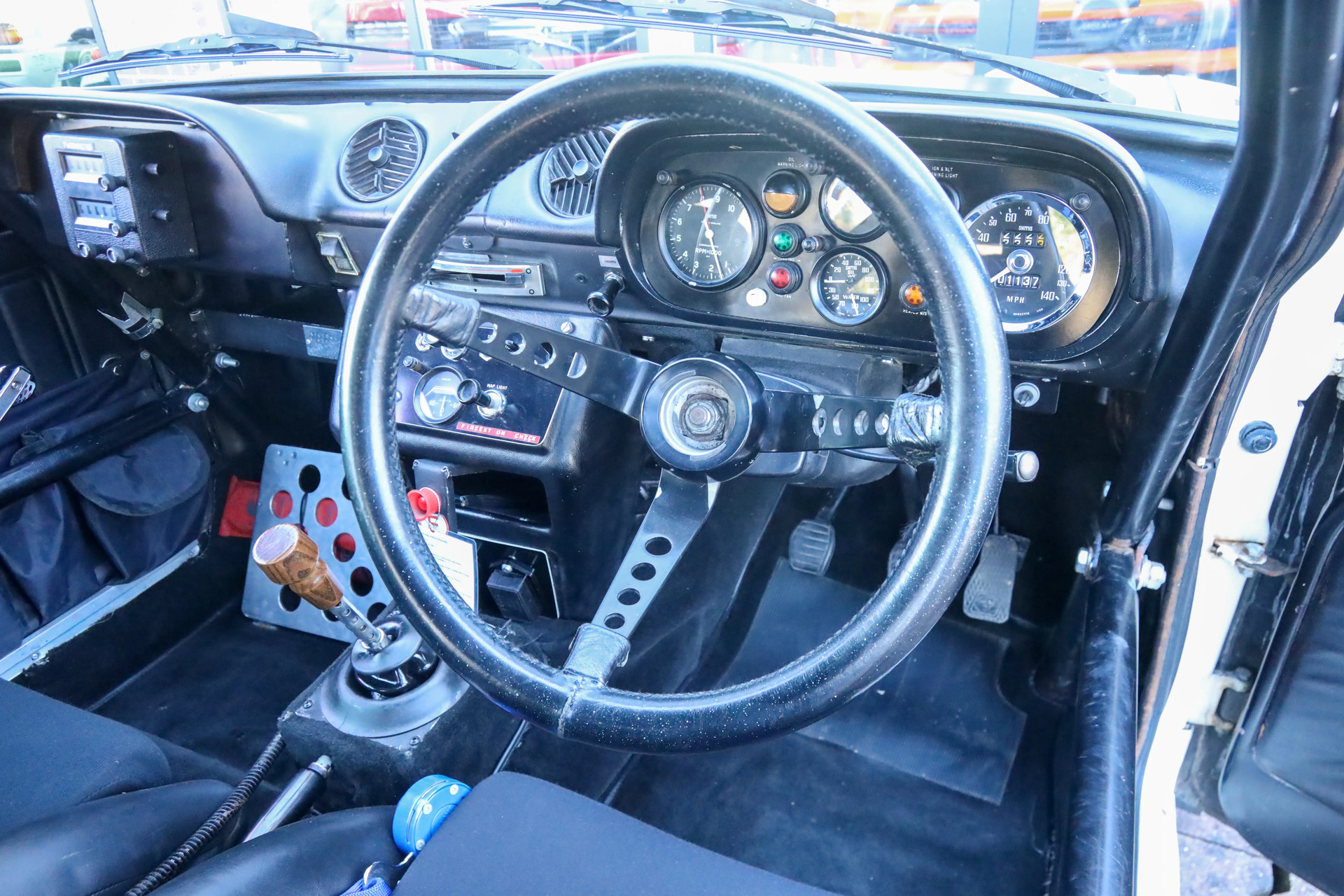 Auch der Innenraum spiegelt die Rallyegeschichte des Fahrzeugs wider. Das Armaturenbrett mit chronometrischen Instrumenten, die Kartenleselampe sowie die zusätzliche Rallyebeleuchtung sind weiterhin vorhanden, genau wie der Wagen damals im Wettbewerb eingesetzt wurde.