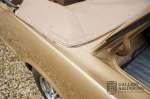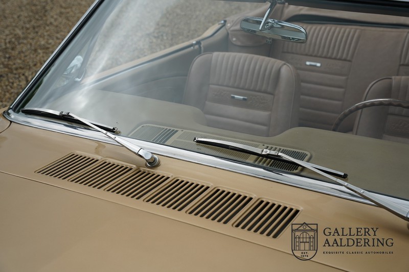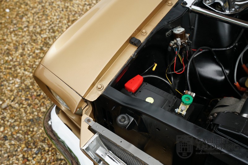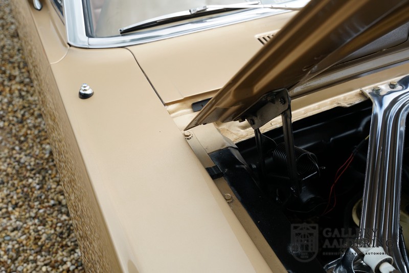 Die Karosserie ist größtenteils original und befindet sich in einem guten Zustand, sie hat dünnes Blech und gute Passungen. Die goldfarbige Lackierung wurde gut verarbeitet und passt sehr gut zu den 60er Jahren. Das weiße Verdeck befindet sich ebenso in einem guten Zustand und harmonisiert sehr gut mit der goldfarbigen Karosserie.