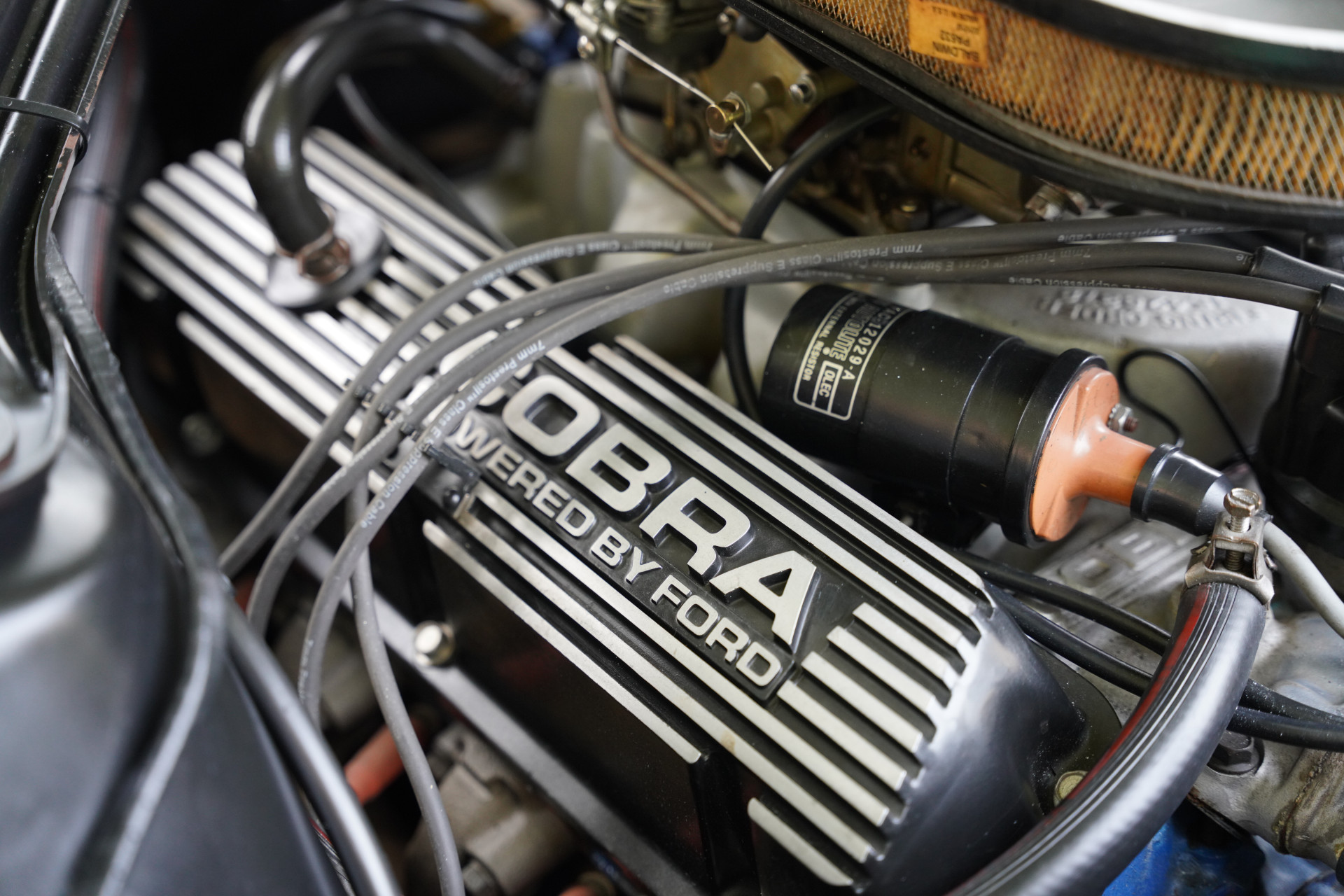 This observation can surely be extended to the interior because it is at least as beautiful as the exterior. The upholstery is exquisite, and the seats are fantastic. Once in place, the typically Shelby seatbelts hang, and the roll bar is, of course, present. The carpets and other general items are also in more than impeccable condition. The dashboard with wood veneer and beautiful gauges looks in top condition, and everything you see or touch is fully functional.