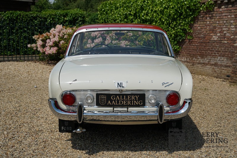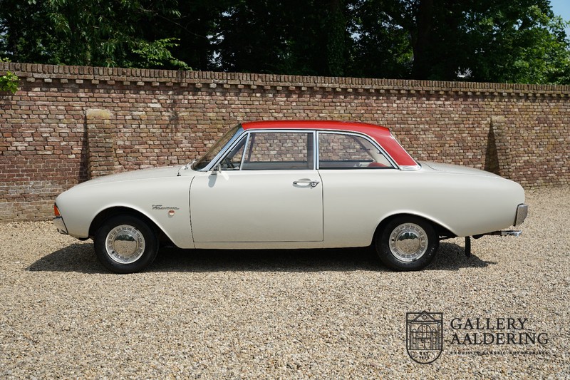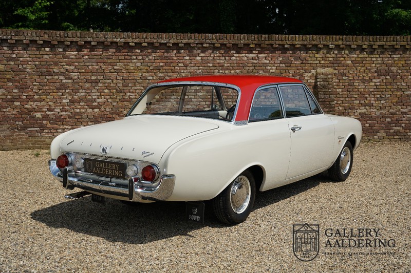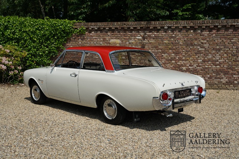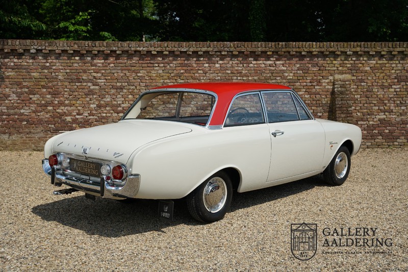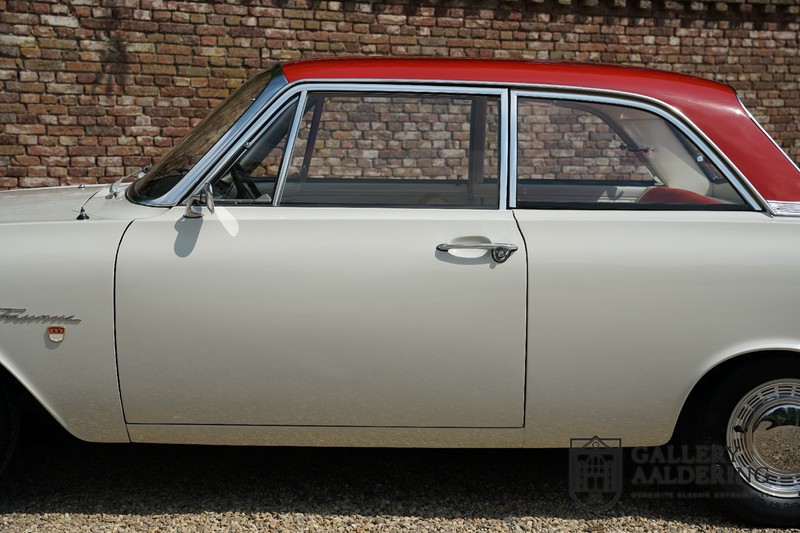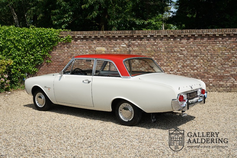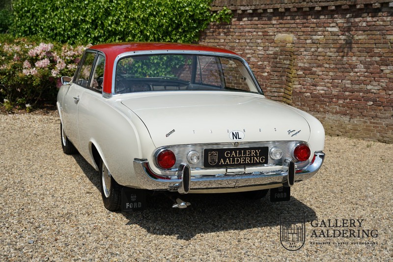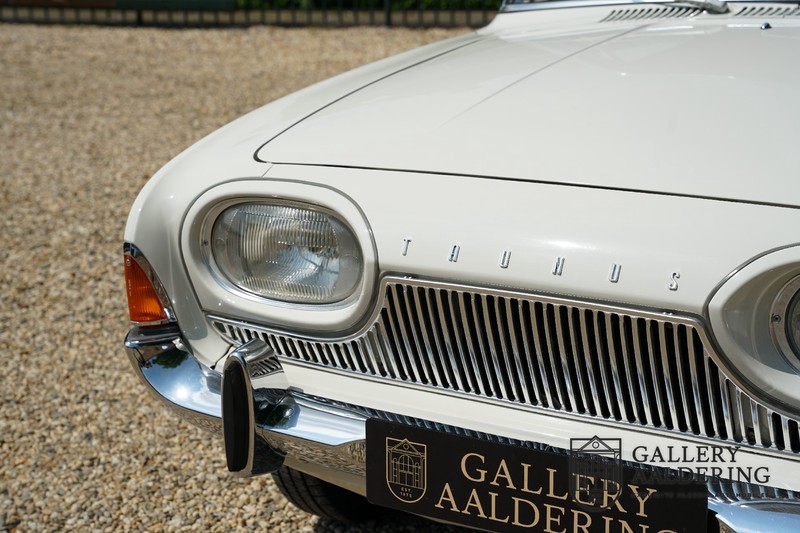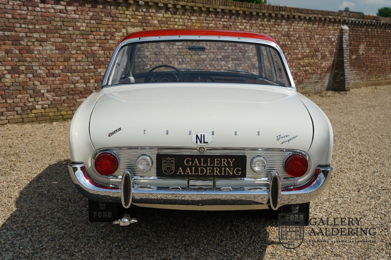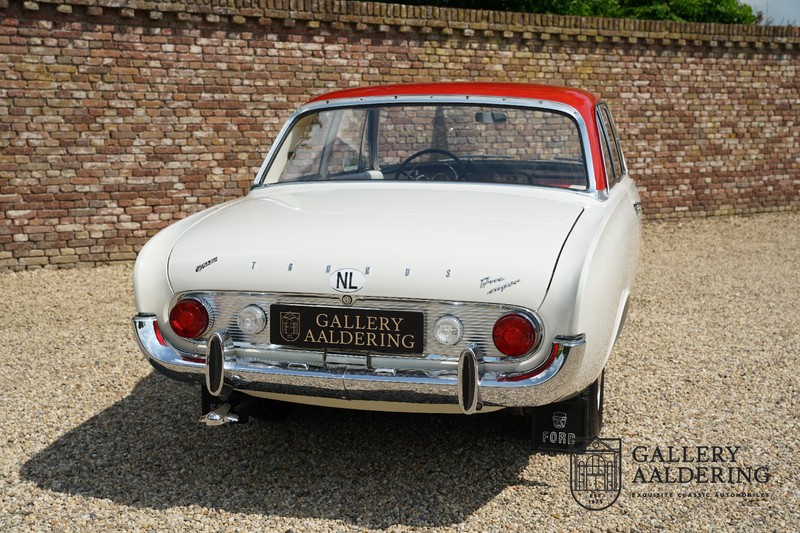 Het betreft hier een origineel Nederlands geleverde Ford Taunus 17M Super uit 1963. Laten we maar met de deur in huis vallen: de auto staat volledig in de eerste lak! De auto is zowel van binnen als van buiten prachtig origineel en verkeert in ongelooflijk toestand. De kilomeerstand van 44.200 is aan zekerheid grenzende waarschijnlijkheid de originele kilometerstand. De “coach” carrosserie is prachtig origineel met mooi dun plaatwerk en correcte passingen. De lak verkeert in schitterende originele conditie en is uitgevoerd in een typische kleurstelling voor de jaren ’60. De auto staat op de originele wielen met daaromheen banden in de correcte maten. Het interieur is eveneens volledig origineel en verkeer in prachtige staat. Zodra u het portier opent ziet u direct dat het hier een prachtig geconserveerde originele auto betreft. De instrumenten en bedieningselementen verkeren eveneens allen in prachtige originele conditie evenals de aanwezig en vanaf de fabriek geleverde Blaupunkt radio. De twee-kleurige Skai bekleding past perfect bij het exterieur en verkeert in onberispelijke staat. Datzelfde gaat op voor de tapijten en de hemel.