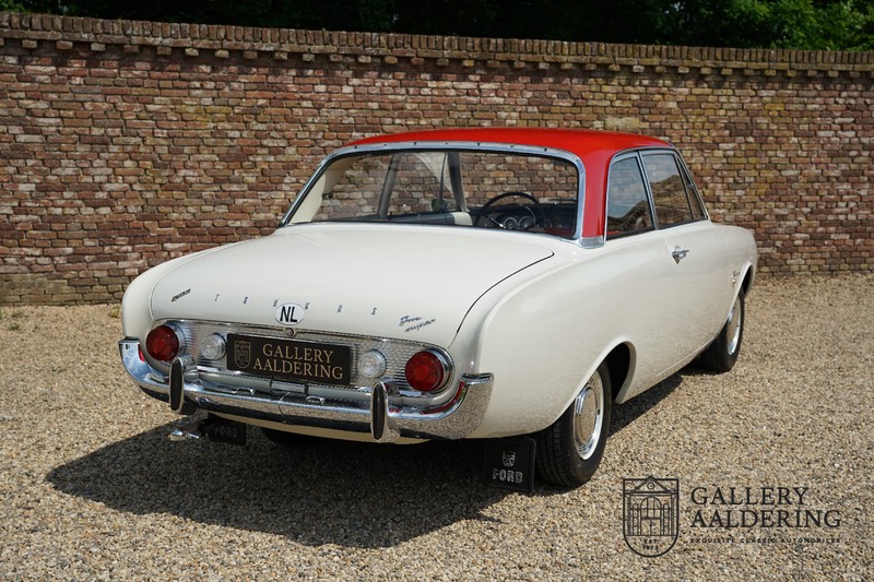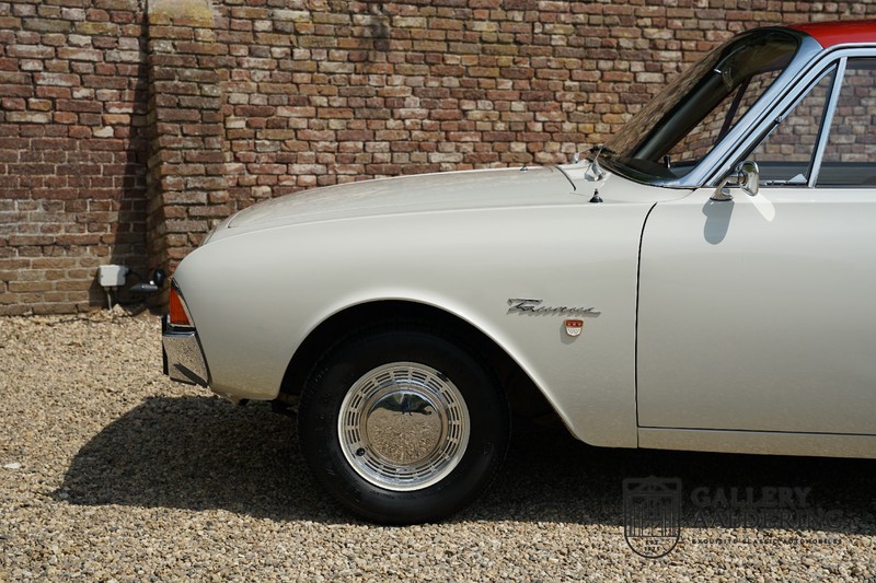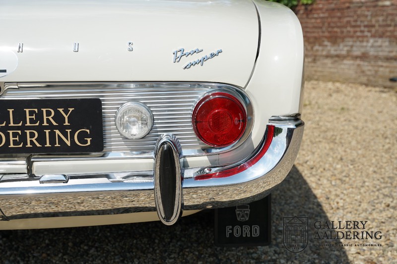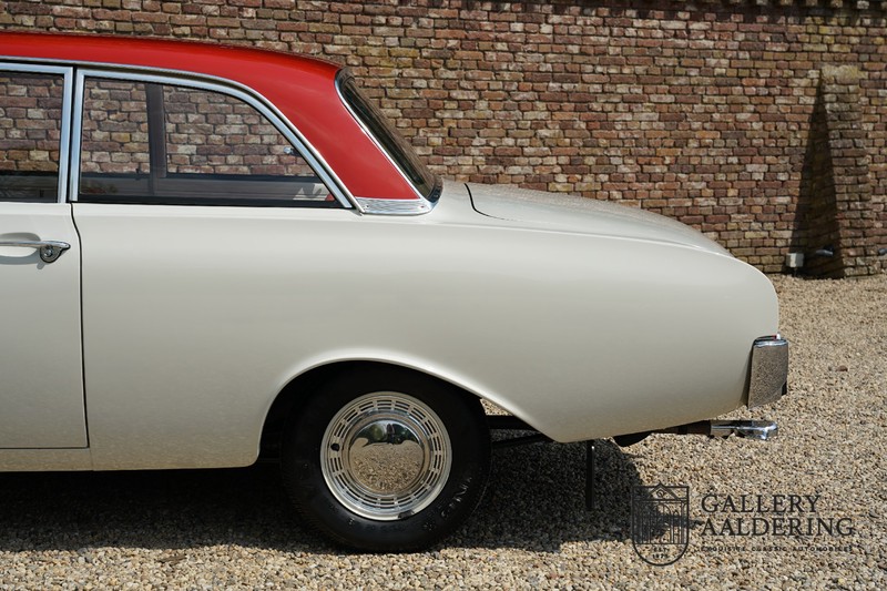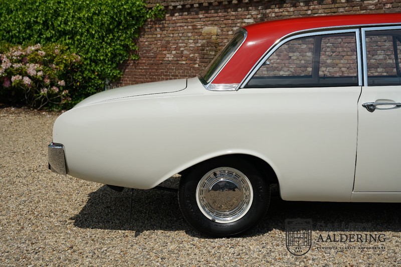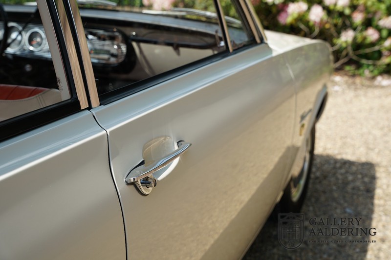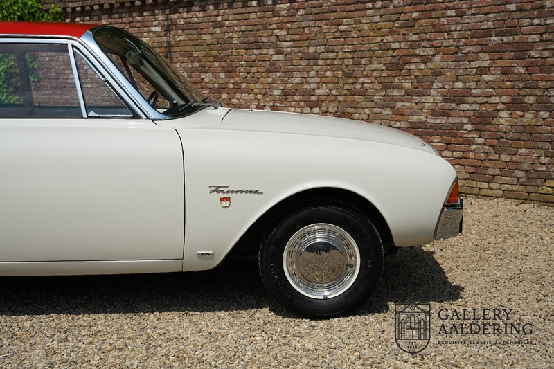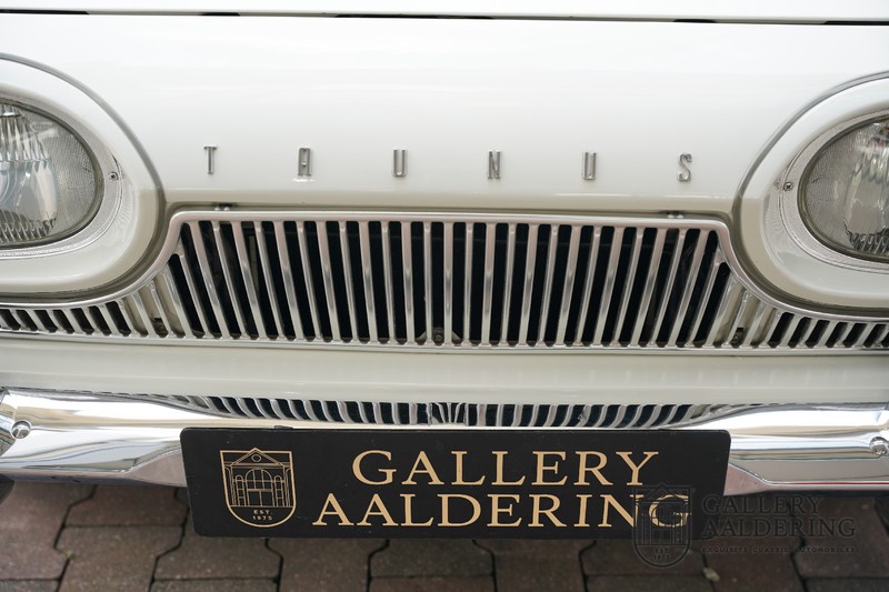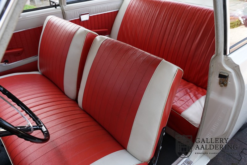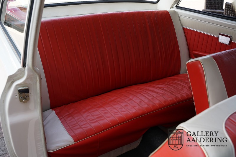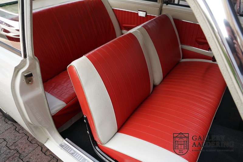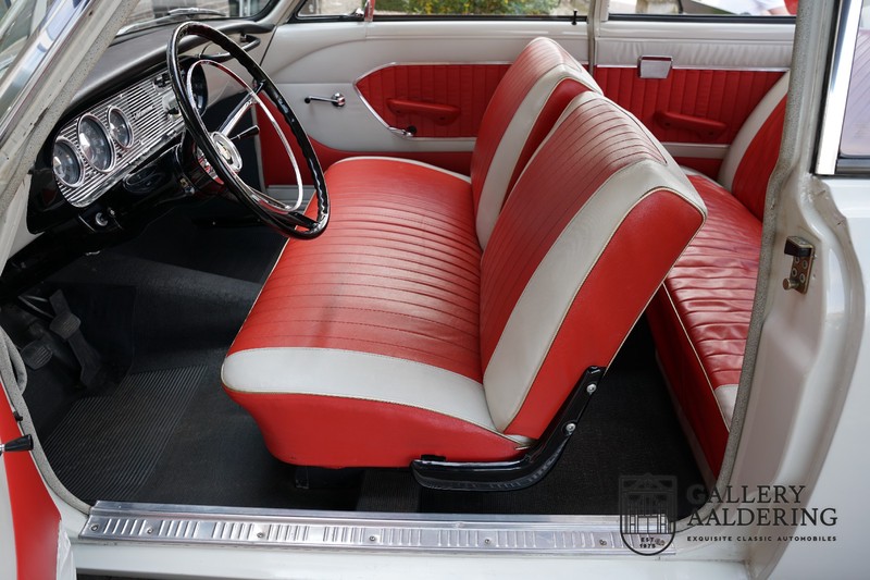 Dieser sehr originale Ford Taunus 17M Super wurde in dem Jahr 1963 neu geliefert in den Niederlanden. Das Interessante ist, dass das Fahrzeug noch vollkommen seinen Erstlack hat, es befindet sich noch komplett in einem sehr originalen Zustand. Wir sind uns ziemlich sicher, dass die Laufleistung von nur 44.200 Km original ist. Die originale Karosserie hat dünnes Blech und korrekte Passungen. Das Auto hat eine typische zweifarbige Farbkombination aus den 60er Jahren, der originale Lack sieht übrigens noch immer wunderschön aus. Der Taunus hat seine originale Räder mit korrekten Reifen, auch das Interieur ist noch vollkommen original und befindet sich in einem sehr schönen Zustand. Beim Öffnen der Türen fällt sofort das sehr gut konservierte Interieur auf, die Instrumente und Bedienelemente sind ebenfalls original und funktionieren einwandfrei und das originale Blaupunkt Radio wurde ab Werk geliefert. Das zweifarbige Kunstleder passt gut zu der Außenseite des Fahrzeugs und befindet sich in einem makellosen Zustand. Das Gleiche gilt für den Teppich und den Dachhimmel.
