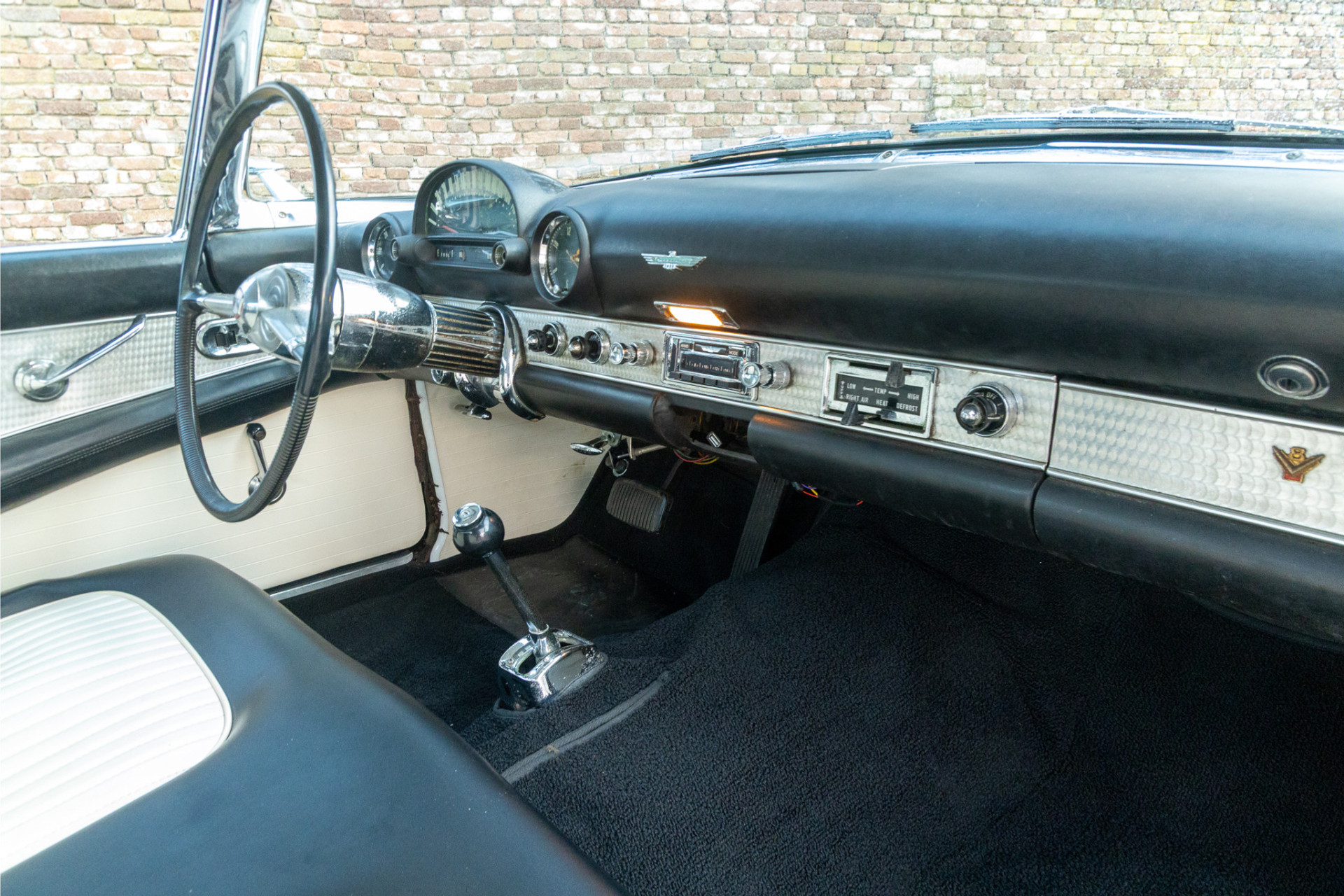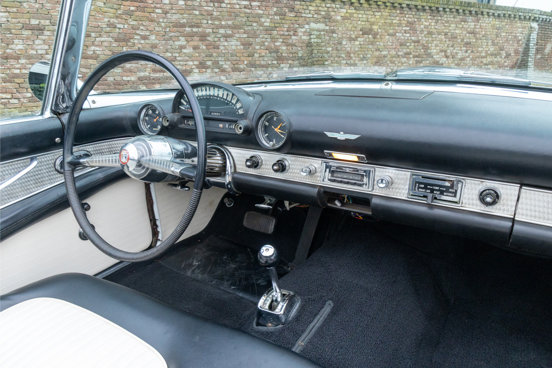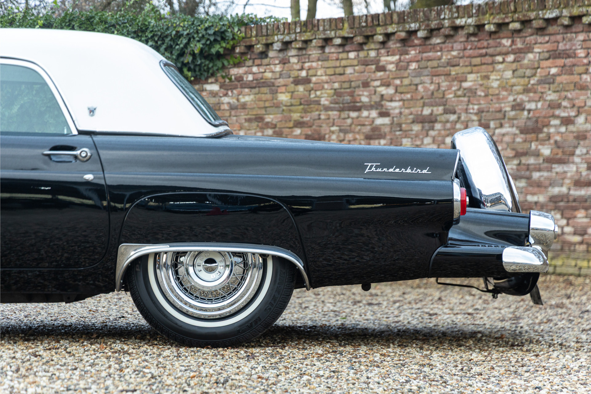 Afgewerkt in het elegante Raven Black, met een tweekleurig zwart-wit interieur dat precies de juiste balans treft tussen Amerikaanse glamour en ingetogen stijl. Deze “Baby Bird” ziet er prachtig uit in zijn originele kleurstelling. Het is een vroege productieauto en dit exemplaar reflecteert de jaren 50 op perfecte wijze: het optimisme, het vertrouwen, de overtuiging dat schoonheid en techniek elkaar kunnen versterken zonder compromissen. Dit was simpelweg een andere tijd.