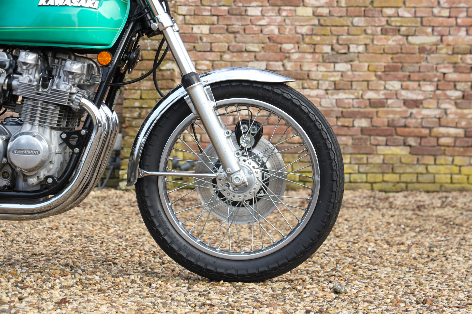 Dit is een echte klassieker. En niet zomaar eentje, dit is een Kawasaki KZ650 uit 1978, in de kleur Candy Emerald Green. En let op: dit is nummer 10 dat ooit uit de fabriek rolde! Hoe bijzonder is dat?