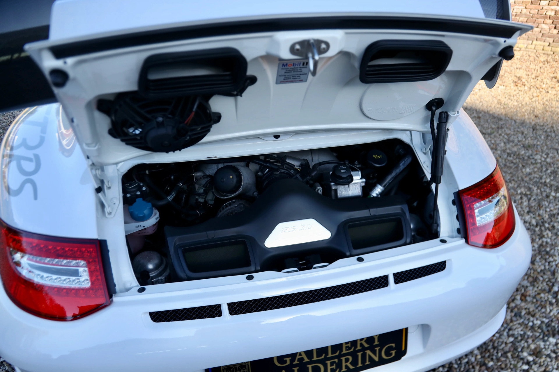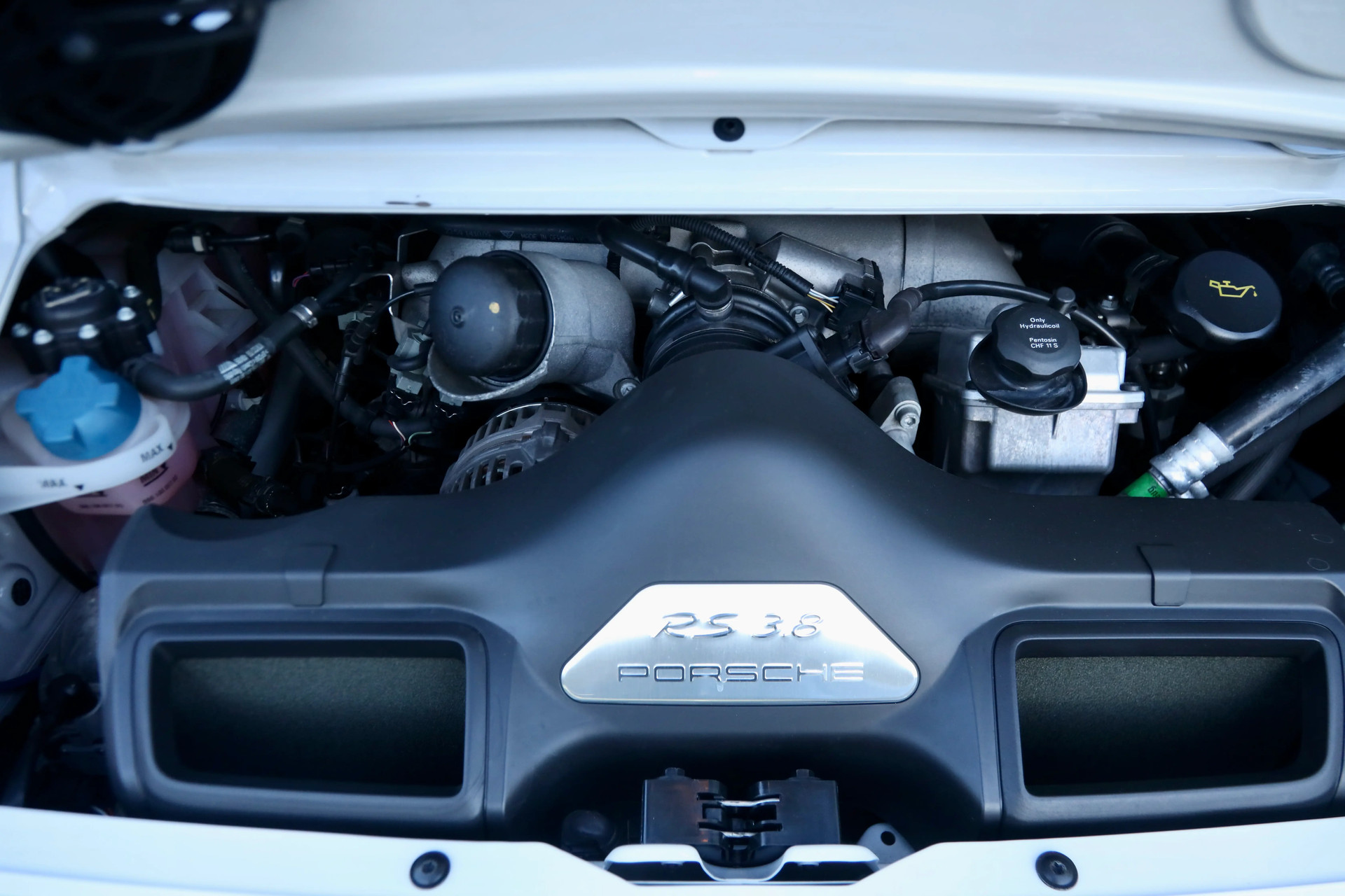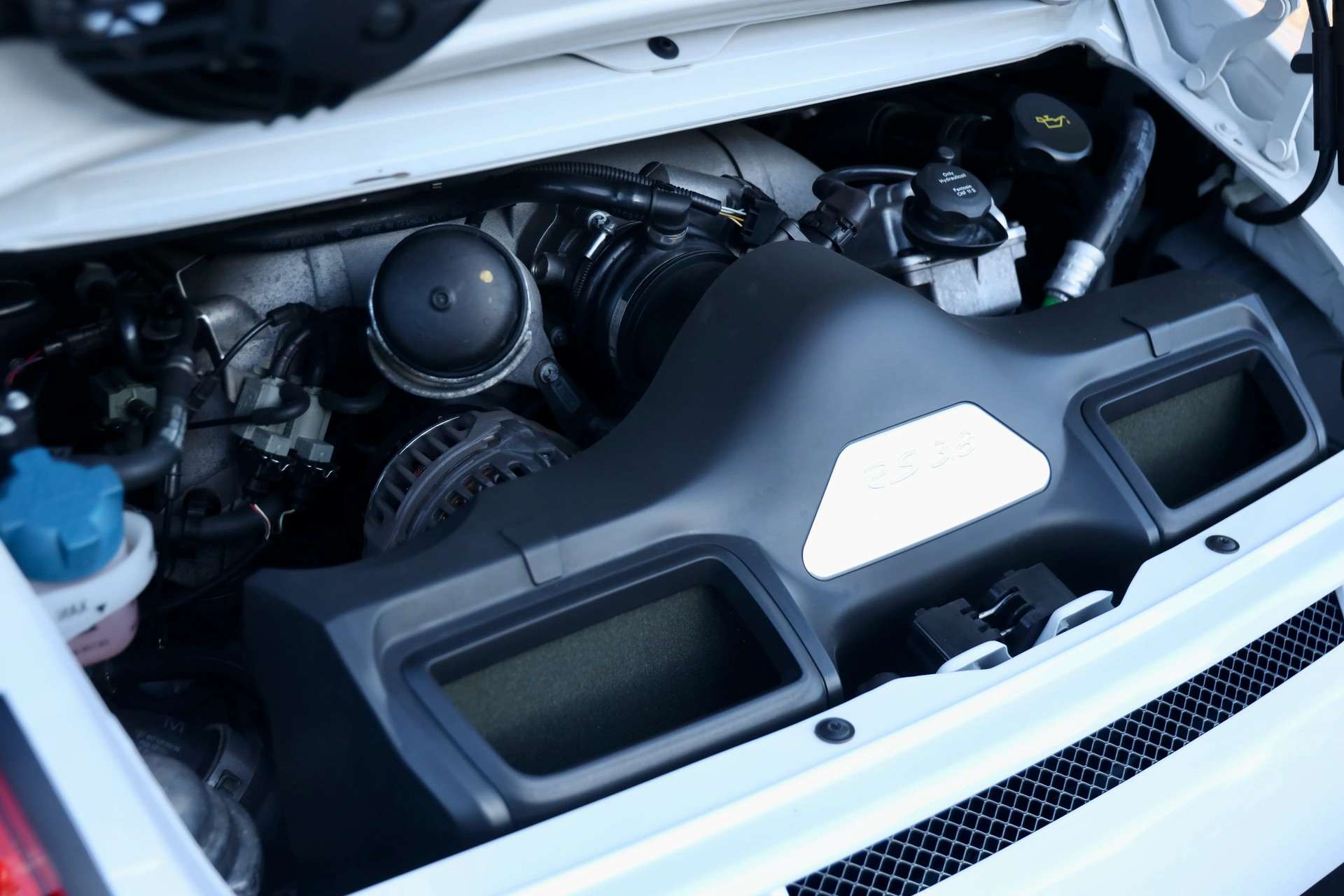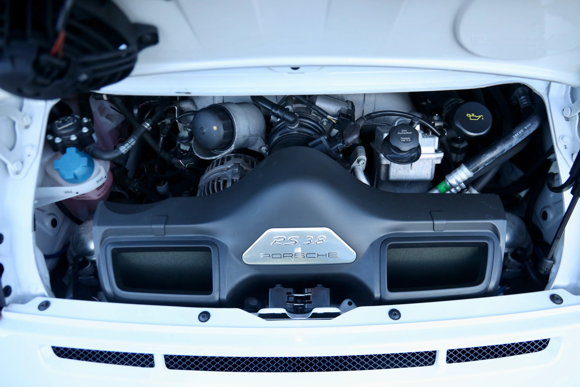 Besonders hervorzuheben ist auch der Einsatz modernster Technologien zur Gewichtsreduzierung. Ein Einmassenschwungrad, leichter als das des regulären GT3, macht den Motor noch agiler. Die Titan-Abgasanlage reduziert nicht nur das Gewicht, sondern sorgt auch für den unverwechselbaren, rohen Klang, den jeder Liebhaber sofort erkennt. Die Heckscheibe besteht aus Kunststoff, während Motorhaube und Türen aus Aluminium gefertigt sind. Trotz der breiteren Karosserie ist der RS somit 25 Kilogramm leichter als der GT3.