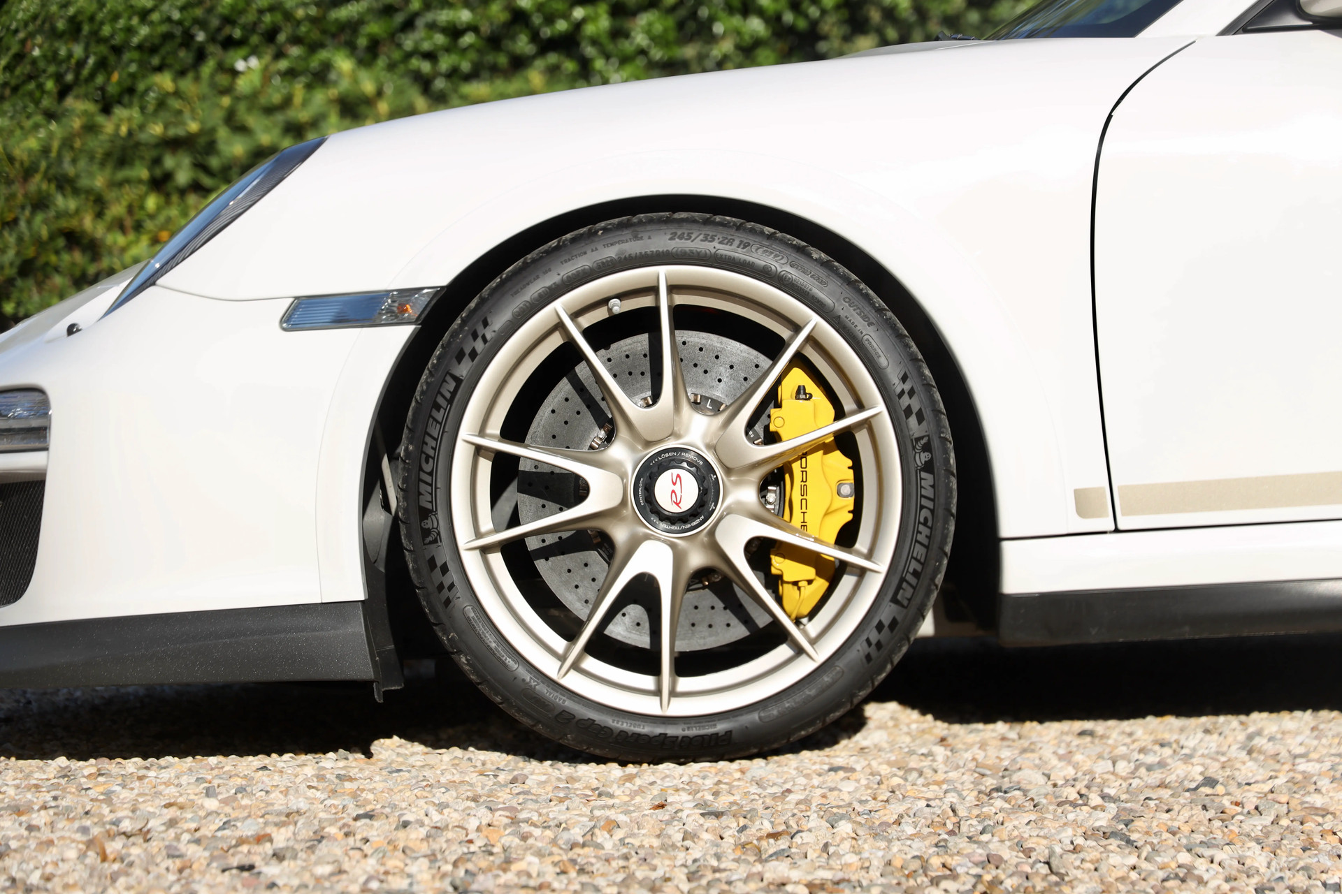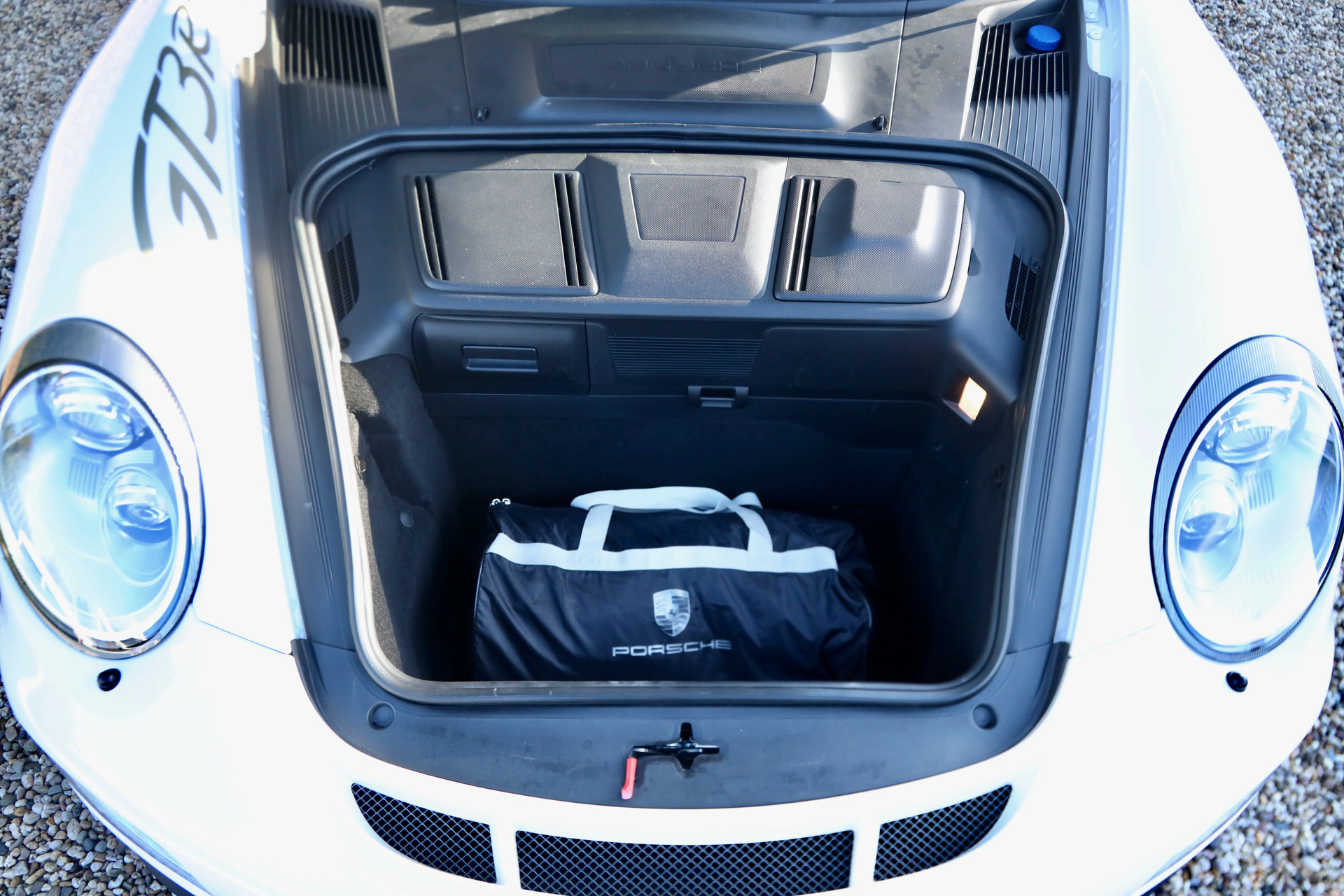 Questa RS è stata accuratamente specificata e dotata di optional pratici e orientati alle prestazioni. Tra questi, i freni Porsche Ceramic Composite Brakes (PCCB), un serbatoio da 90 litri per l'uso sulle lunghe distanze, un sistema di sollevamento anteriore che solleva il muso di circa 30 millimetri e una gabbia di sicurezza nera. Gli interni sono funzionali e puristi: dotati di sedili da corsa in carbonio, inserti in Alcantara e pannelli porta leggeri con cinghie di trazione al posto delle maniglie convenzionali. Lussi come i portabicchieri o un infotainment completo sono stati deliberatamente omessi, perché nella ricerca delle prestazioni, ogni grammo conta.