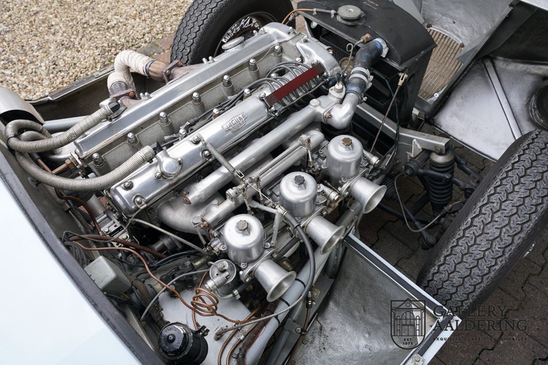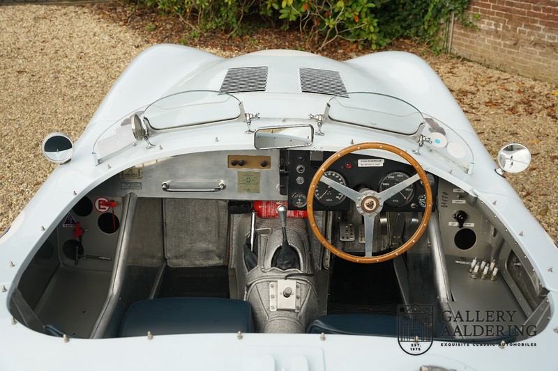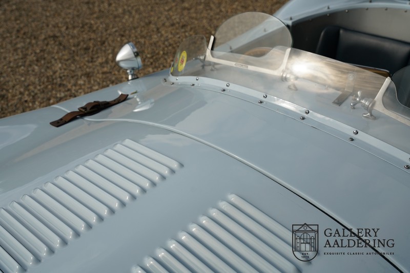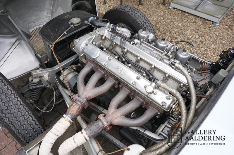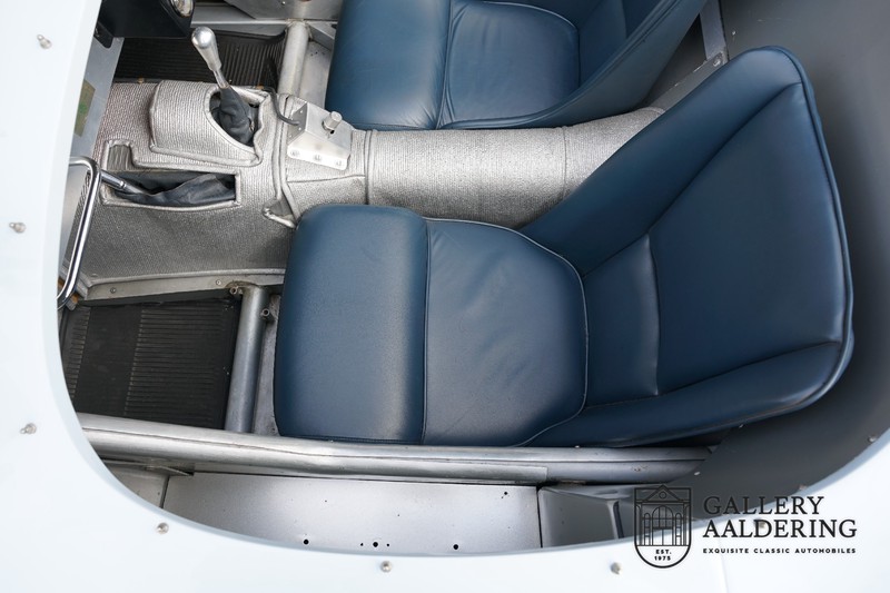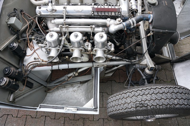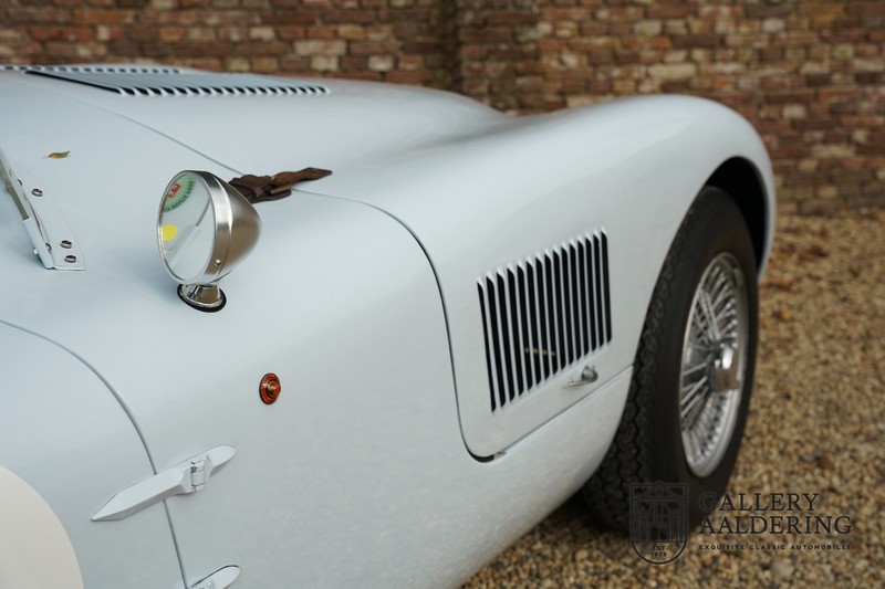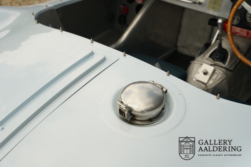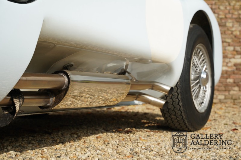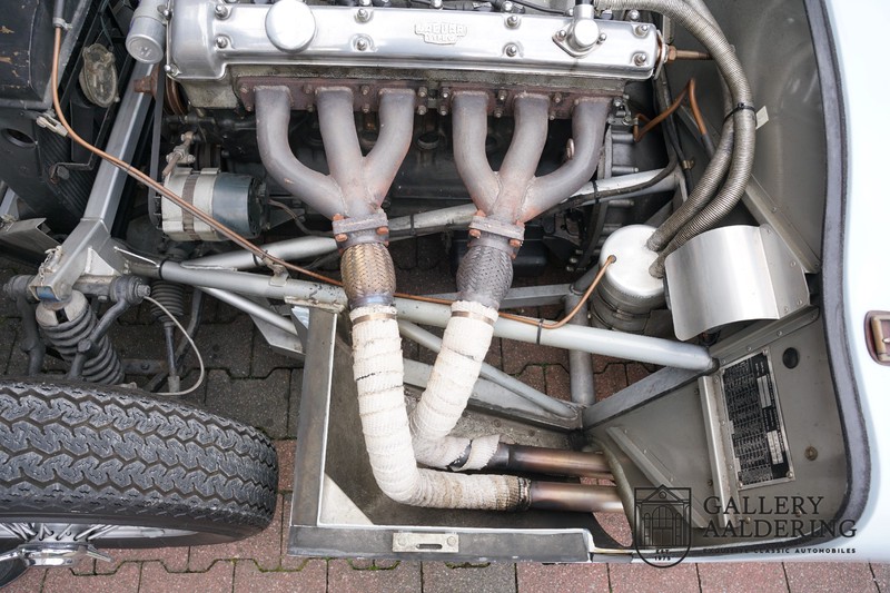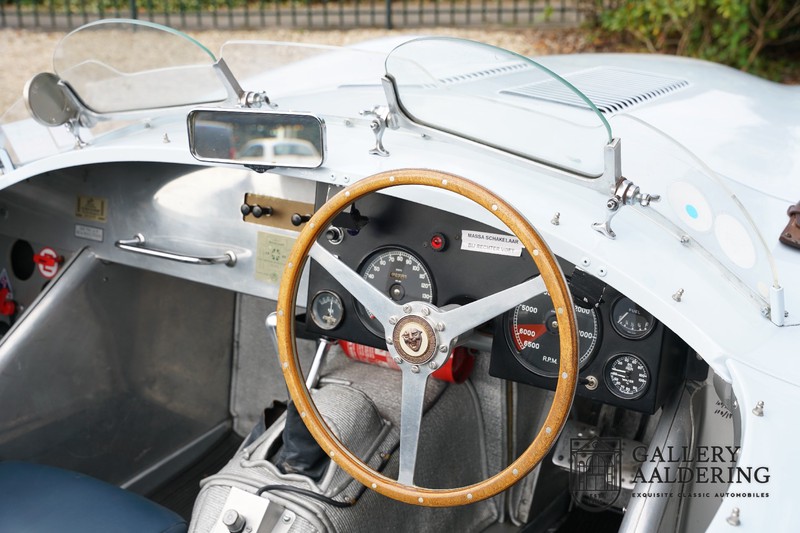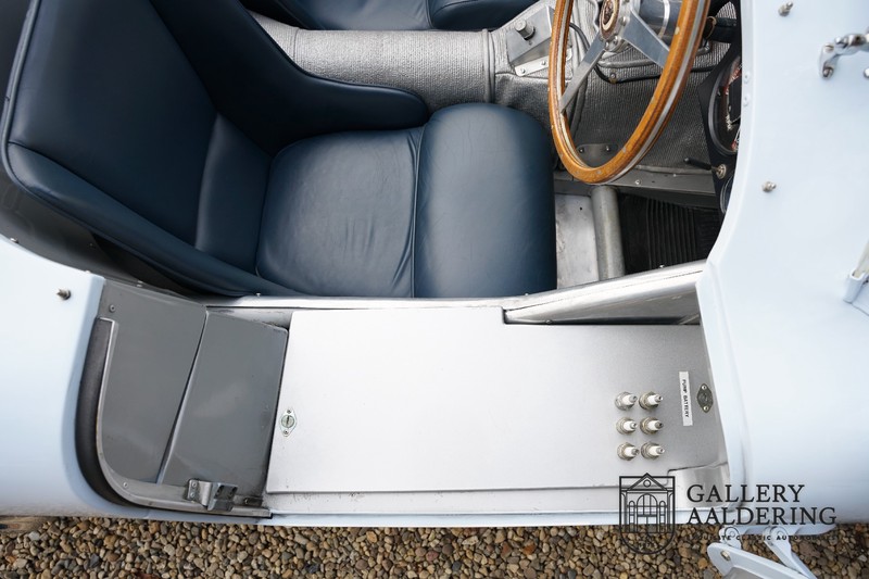 This is a beautifully built Jaguar C-type replica. The car is equipped with many common Jaguar E-type technology and has a plastic body. The car is very light and very fast. It is not only a feast for the eyes but also certainly for the ear. The inline six engine inhales through open chalices on the three carburettors and exhales through the signature exhaust on the left side of the car. The engine is of course coupled to a manual transmission that shifts perfectly and matches the character of the engine sublimely. The Jaguar C-Type is an icon of design and everything is focused on performance. The car is painted in the beautiful light blue color with a beautiful dark blue leather-covered interior. Where the E-type mainly breathes the atmosphere of a library where gentlemen smoke cigars and drink cognac, the C-type is a lot more spartan, here no deep-pile carpet or insulation material, but only things on board that make the driver drive faster.