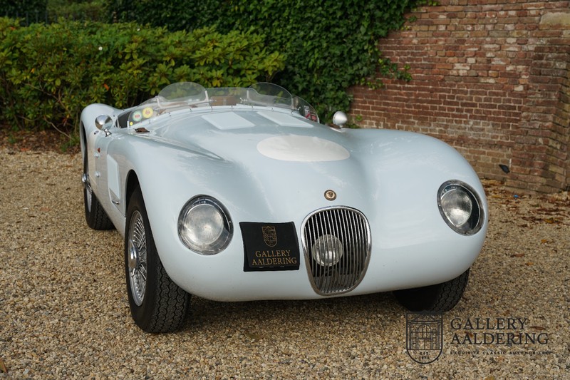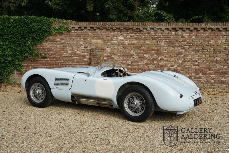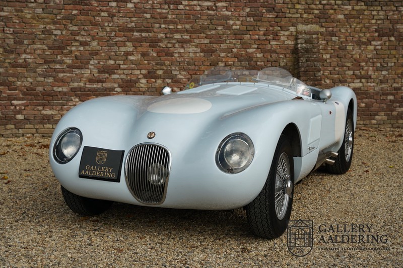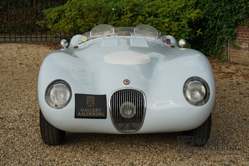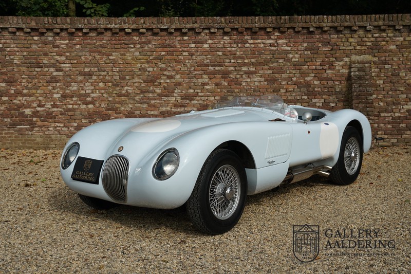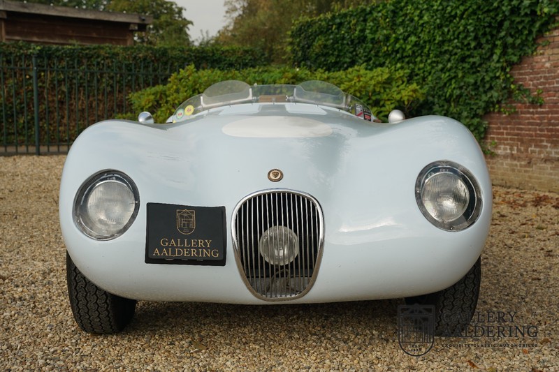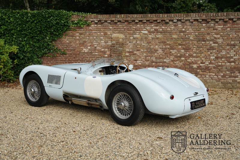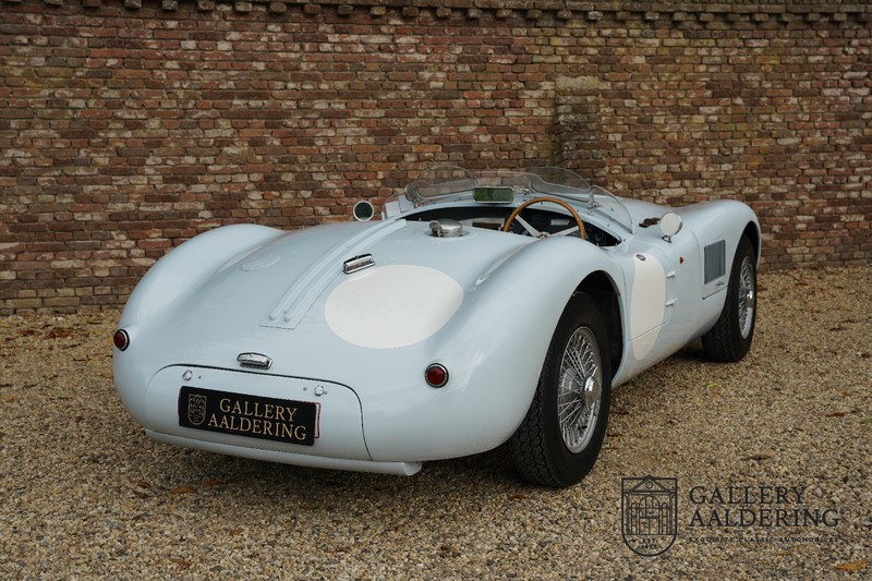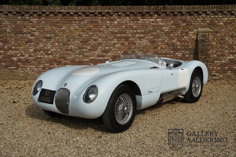 Het betreft hier een prachtig opgebouwde Jaguar C-type replica. De auto is voorzien van veel gangbare Jaguar E-type techniek en heeft een kunststof body. De auto is heel licht en bijzonder snel. Het is niet alleen een lust voor het oog maar ook zeker voor het oor. De zes-in-lijn motor ademt in door open kelken op de drie carburateurs en ademt uit door de typerende uitlaat aan de linkerzijkant van de auto. De motor is vanzelfsprekend gekoppeld aan een handgeschakelde transmissie die perfect schakelt en subliem past bij het karakter van de motor. De Jaguar C-type is een icoon van een ontwerp en alles is gericht op performance. De De auto is gespoten in de prachtige lichtblauwe kleur met een schitterend donkerblauw met leder bekleed interieur. Daar waar de E-type vooral de sfeer ademt van een bibliotheek waar heren sigaren roken en cognac drinken is de C-type een stuk spartaanser, hier geen hoogpolig tapijt of isolatiemateriaal maar alleen zaken aan boord die de coureur sneller laten rijden.