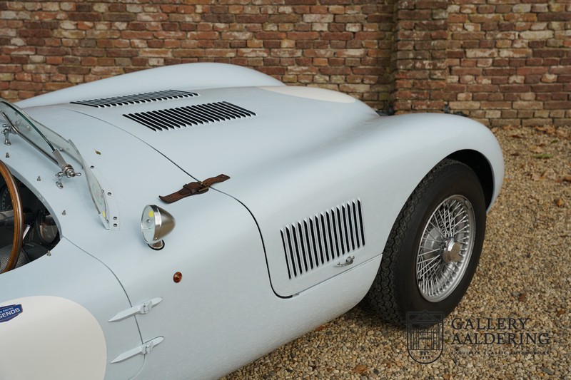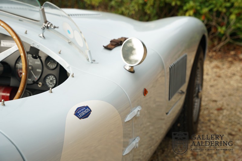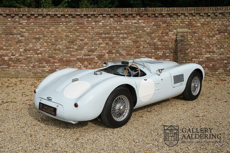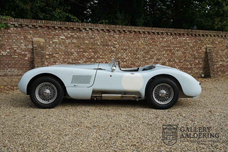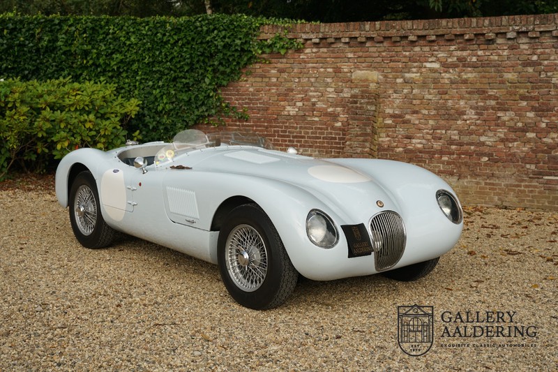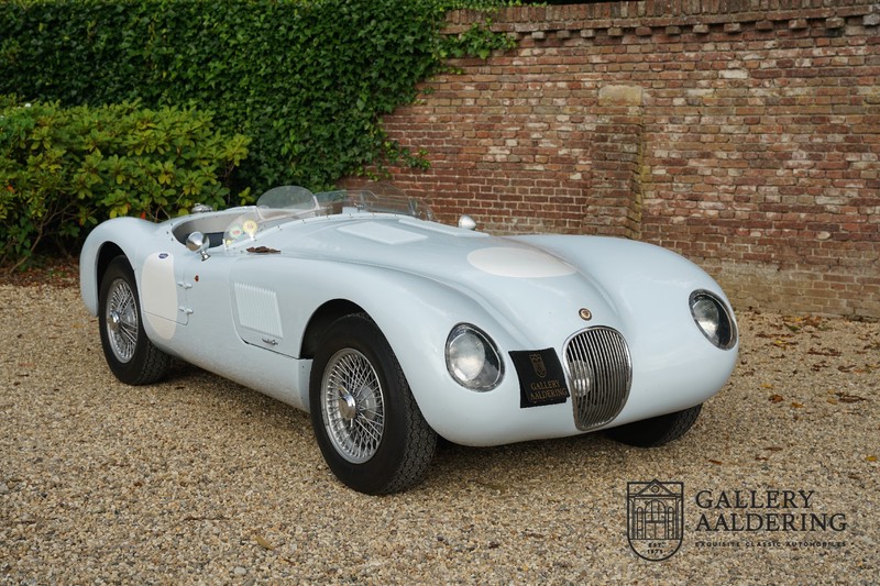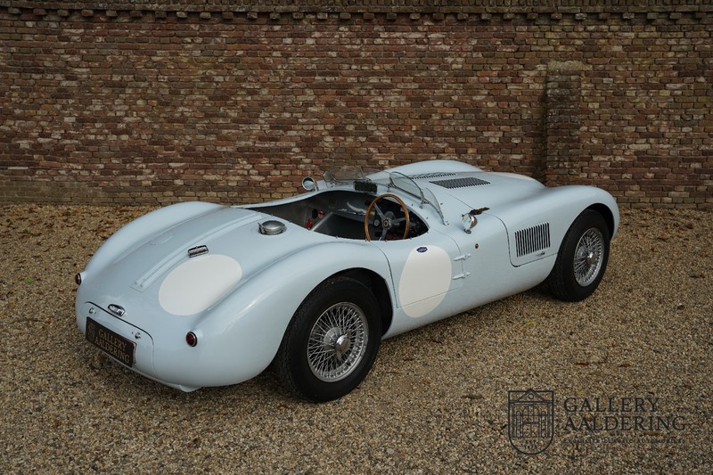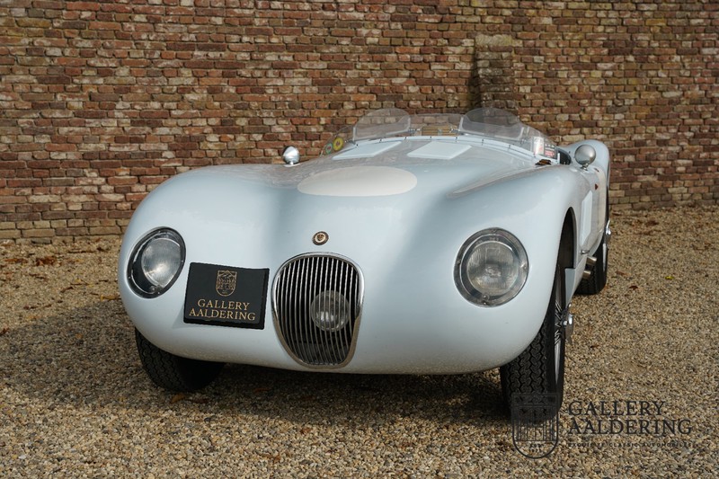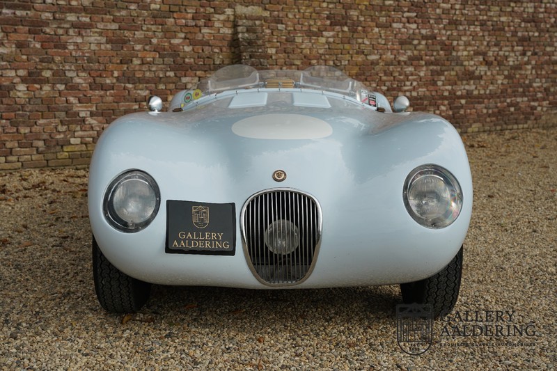 Het betreft hier een prachtig opgebouwde Jaguar C-type replica. De auto is voorzien van veel gangbare Jaguar E-type techniek en heeft een kunststof body. De auto is heel licht en bijzonder snel. Het is niet alleen een lust voor het oog maar ook zeker voor het oor. De zes-in-lijn motor ademt in door open kelken op de drie carburateurs en ademt uit door de typerende uitlaat aan de linkerzijkant van de auto. De motor is vanzelfsprekend gekoppeld aan een handgeschakelde transmissie die perfect schakelt en subliem past bij het karakter van de motor. De Jaguar C-type is een icoon van een ontwerp en alles is gericht op performance. De De auto is gespoten in de prachtige lichtblauwe kleur met een schitterend donkerblauw met leder bekleed interieur. Daar waar de E-type vooral de sfeer ademt van een bibliotheek waar heren sigaren roken en cognac drinken is de C-type een stuk spartaanser, hier geen hoogpolig tapijt of isolatiemateriaal maar alleen zaken aan boord die de coureur sneller laten rijden.