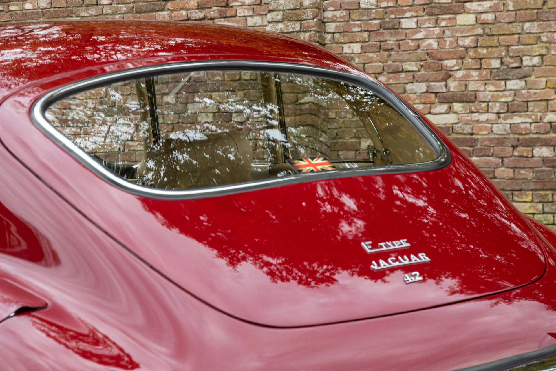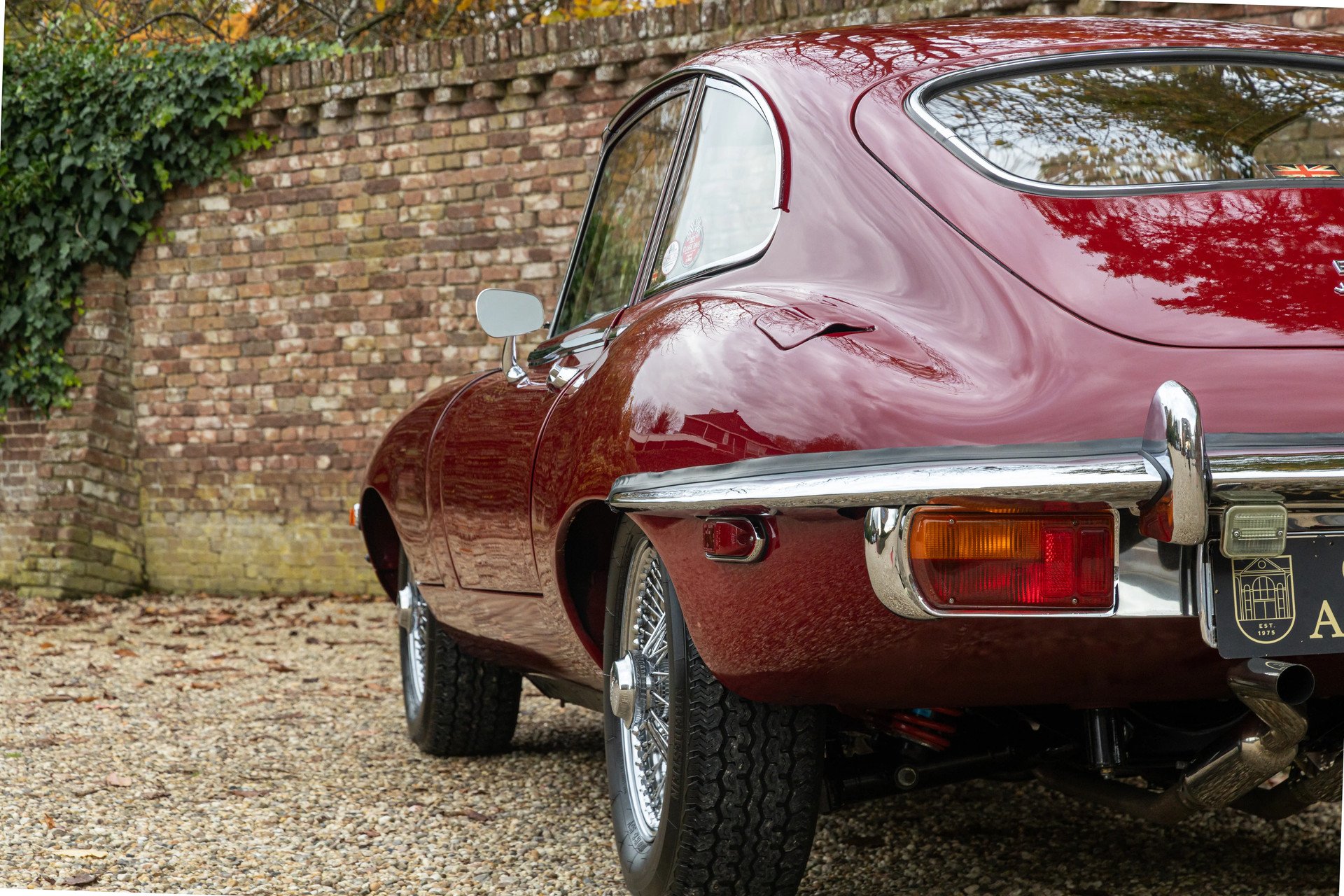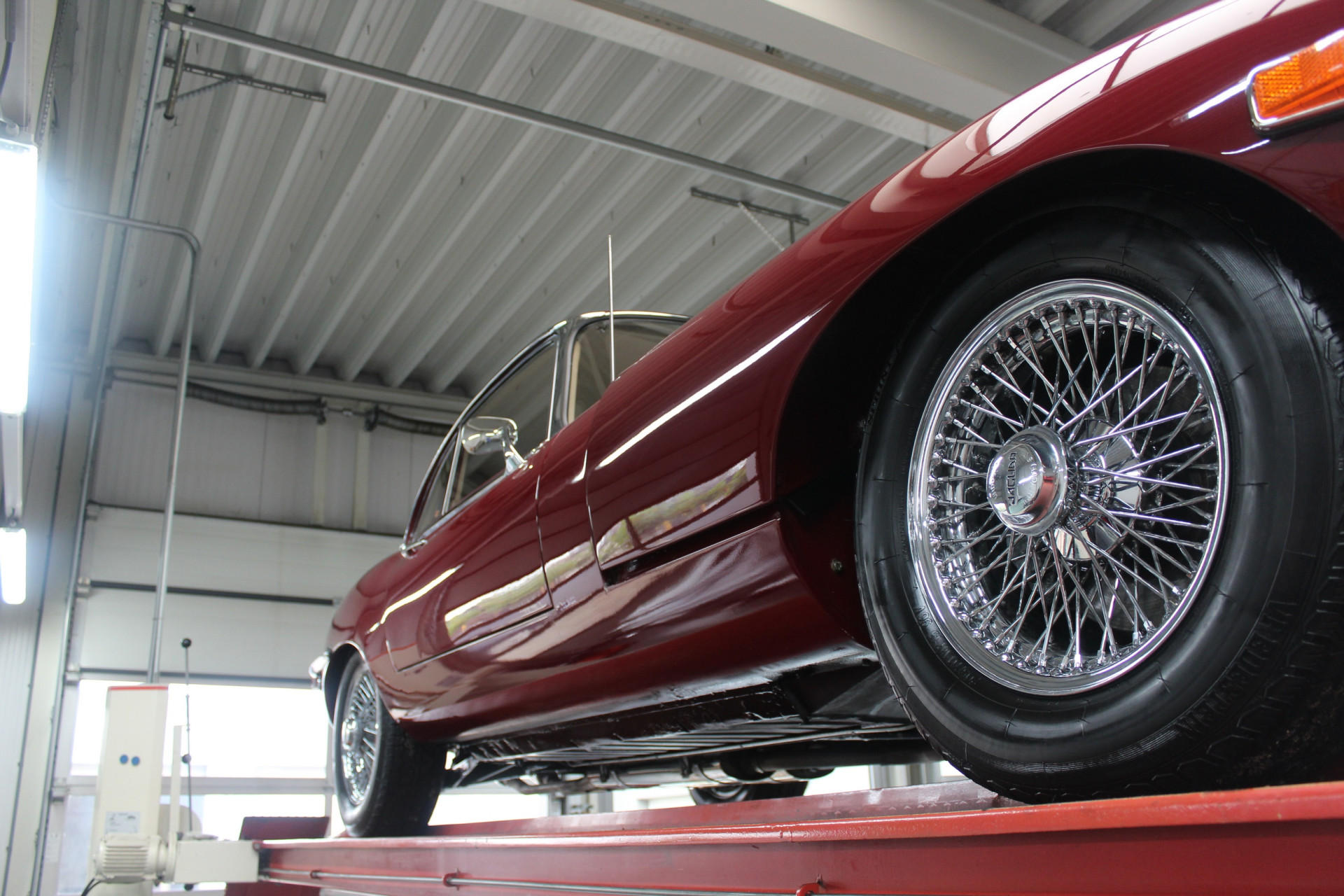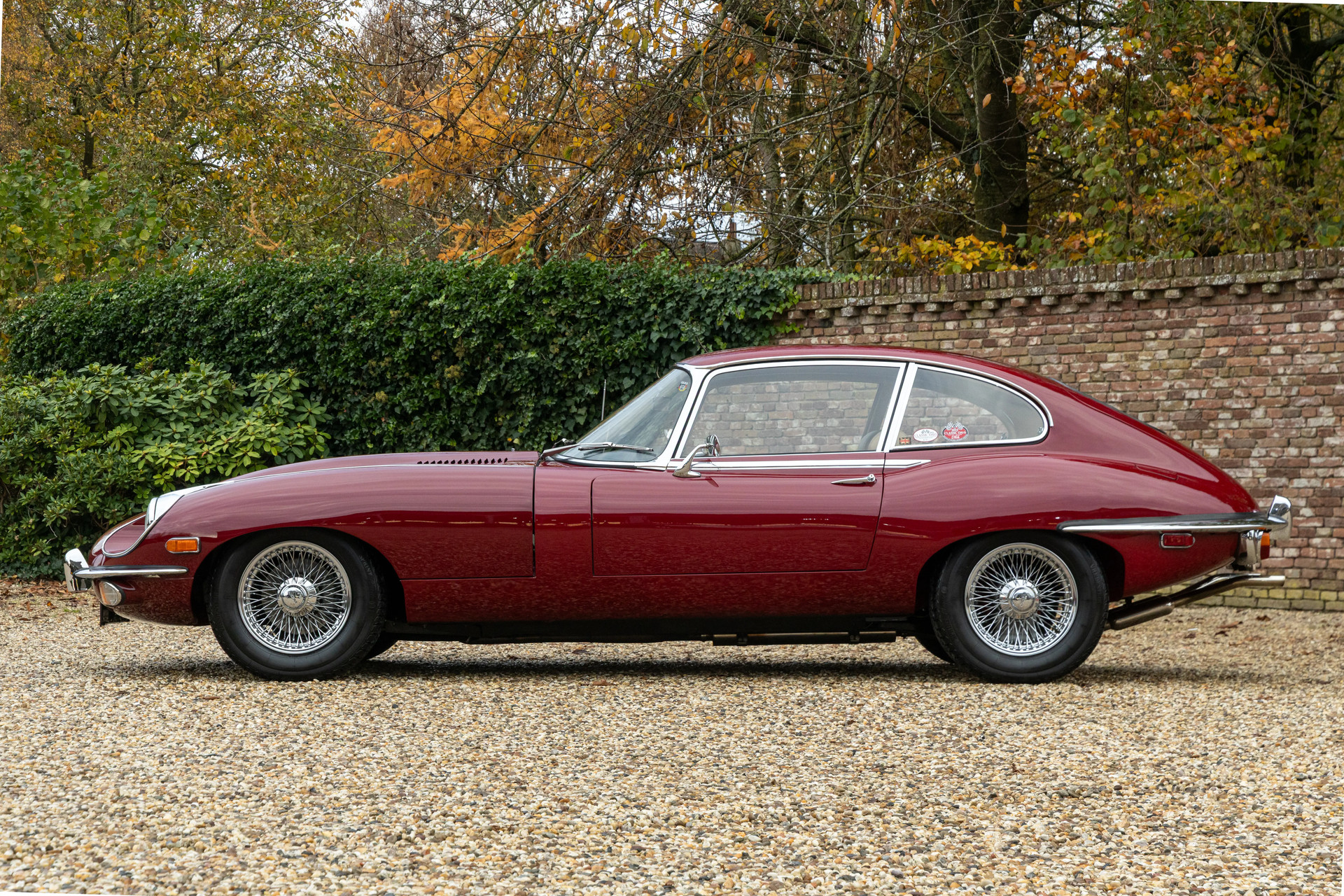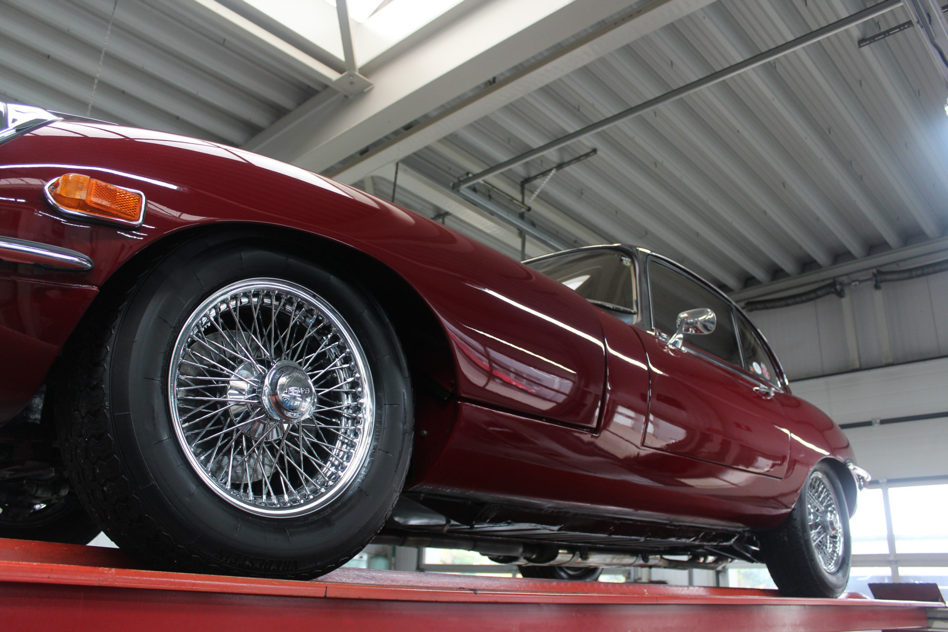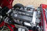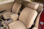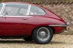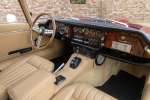 Die Farbkombination ist besonders ansprechend: Regency Red außen, kombiniert mit einem Tan-Lederinterieur – eine elegante und zeitlose Abstimmung, die perfekt zu den Linien des 2+2-Coupés passt. Im Innenraum erwarten Sie das klassische Armaturenbrett, die ikonischen Rundinstrumente, die charakteristische Mittelkonsole und die tief sitzende Fahrposition mit Blick über die beeindruckend lange Motorhaube – genau das Detail, das den Reiz des E-Type so unverwechselbar macht.