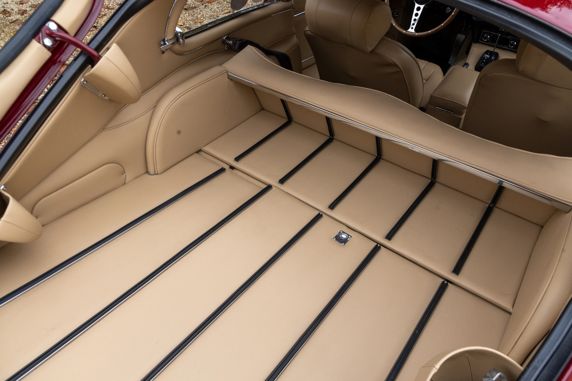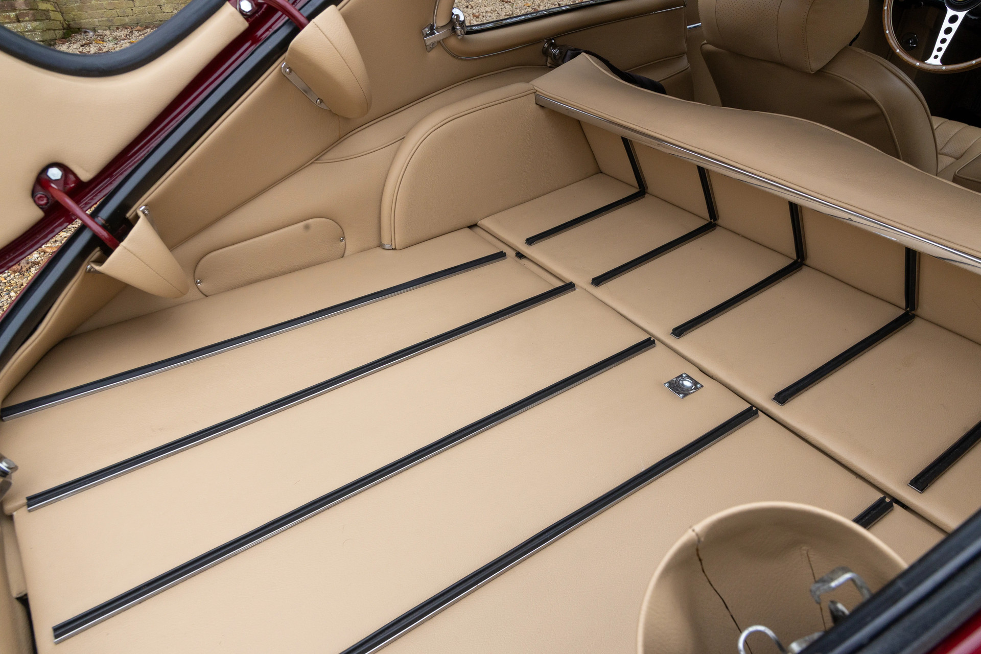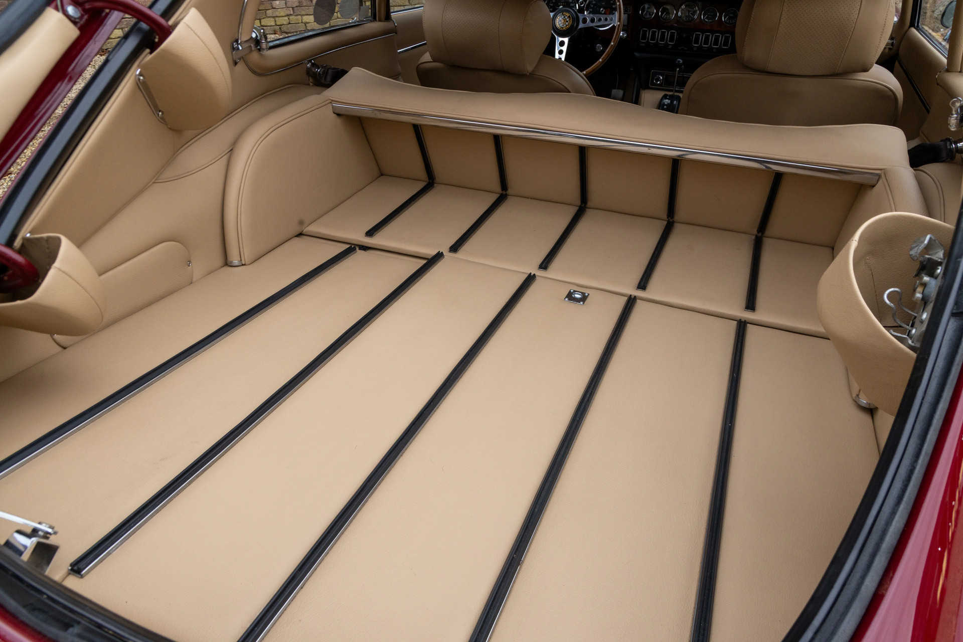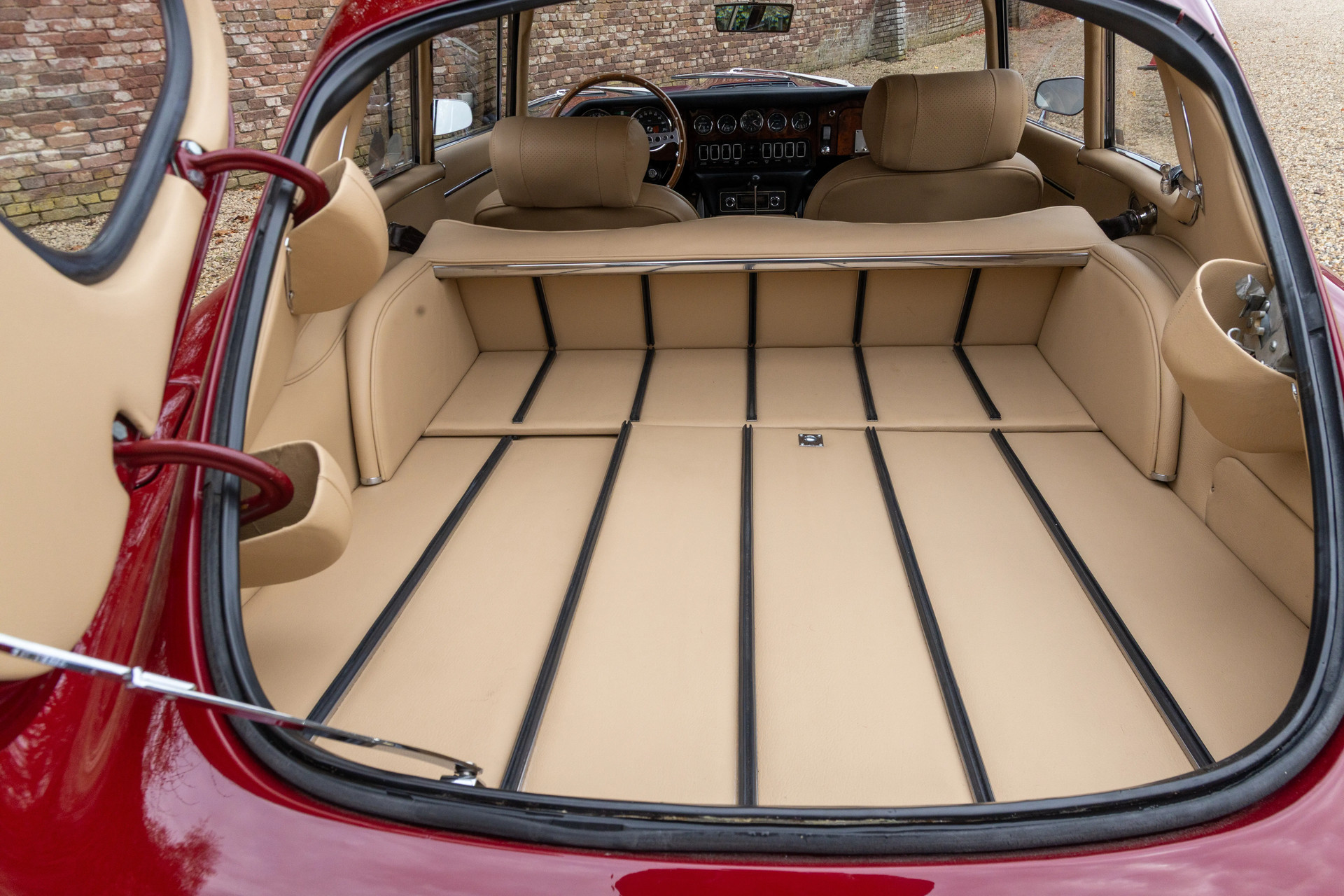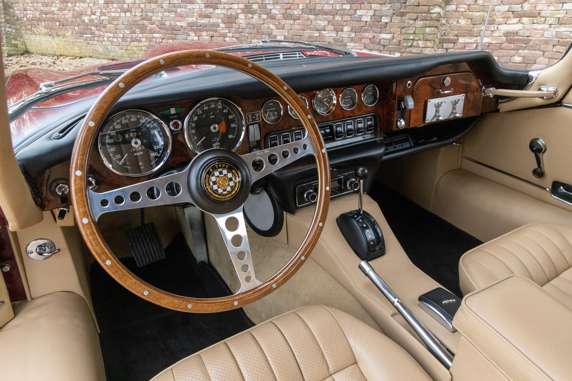 The color combination is particularly striking: Regency Red on the exterior paired with a Tan leather interior—a timeless match that suits the lines of the 2+2 Coupé perfectly. Inside, you’ll find the classic dashboard layout, the iconic gauges, the signature center console, and that wonderful seating position with a view over the impossibly long bonnet. It’s this very sightline that defines so much of what makes the E-Type driving experience unforgettable.