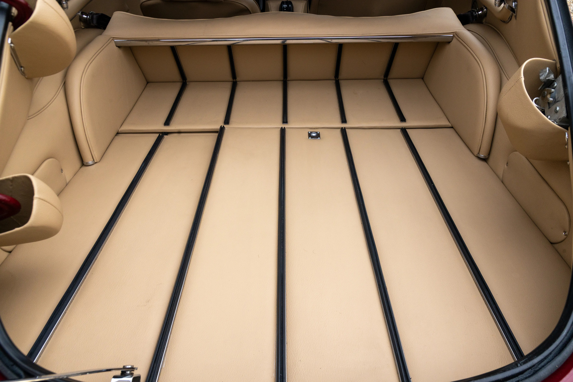 De kleurstelling vormt een fraaie combinatie: Regency Red aan de buitenzijde, gecombineerd met een Tan leren interieur. Het geheel sluit prachtig aan bij de lijnen van de 2+2-Coupé. Binnenin vindt u het klassieke dashboard, de tijdloze meters, de karakteristieke middenconsole en de fijne zitpositie met uitzicht over die indrukwekkend lange motorkap. En precies dat laatste detail maakt de beleving van de E-Type zo bijzonder.