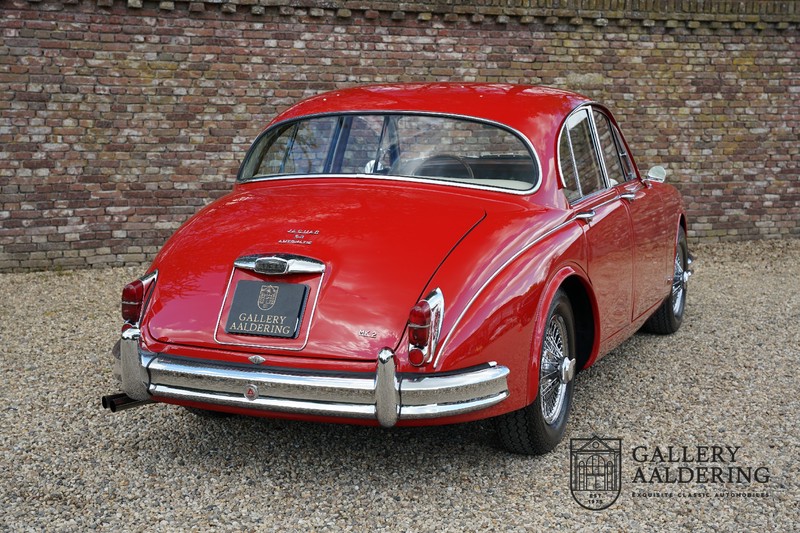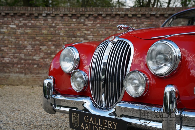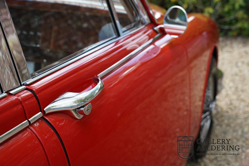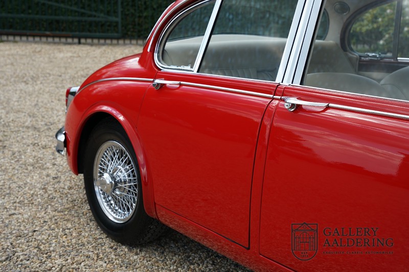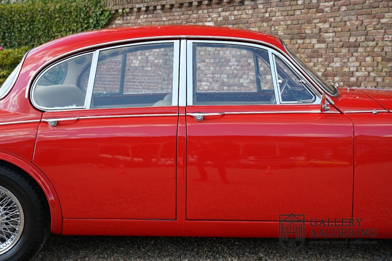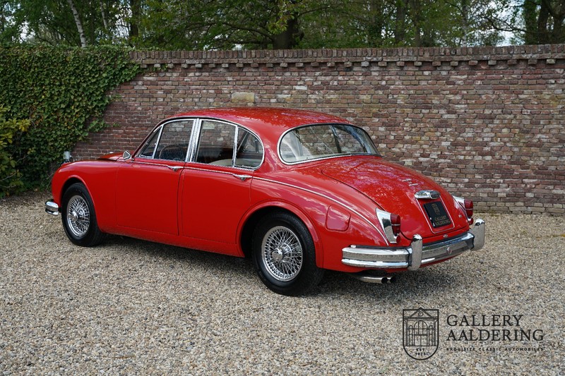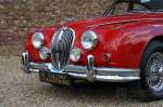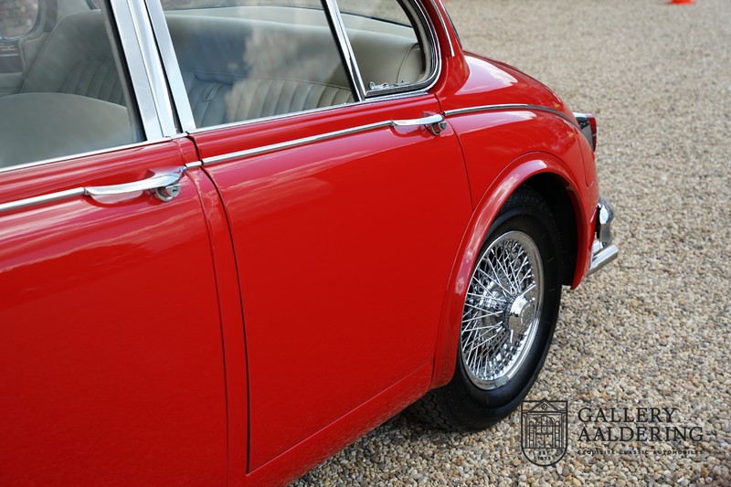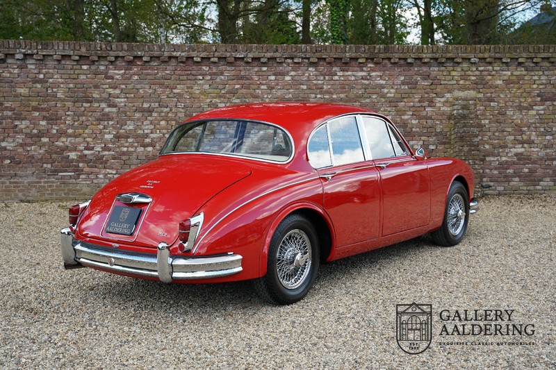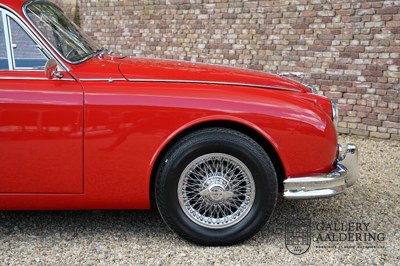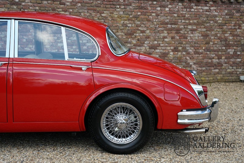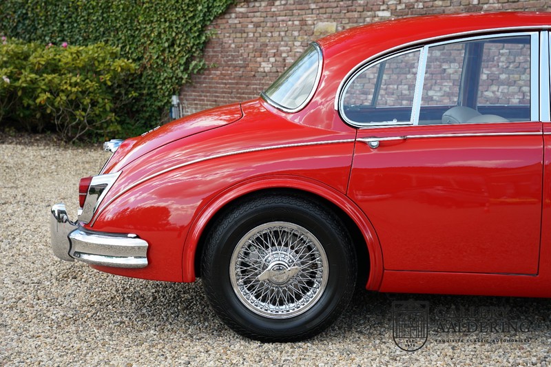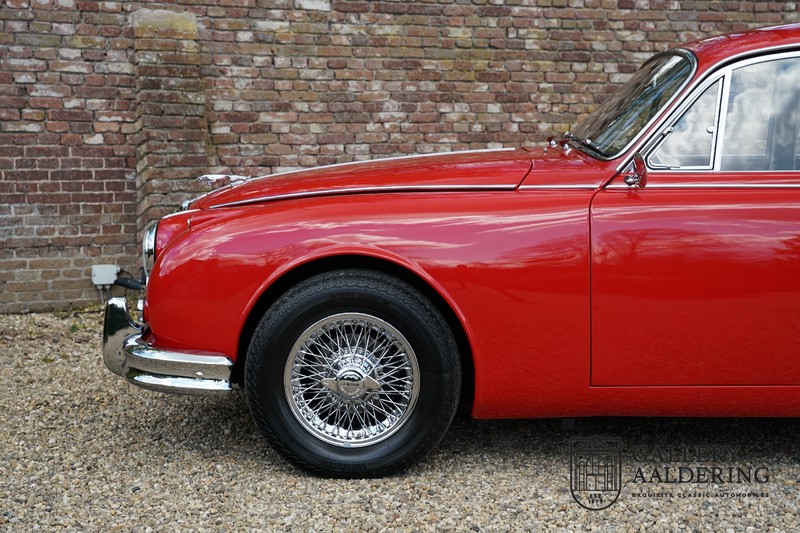 De Mk2 3.8 is zelfs zo krachtig dat bankovervallers in de jaren ’60 steevast een Jaguar Mk2 “leenden” als zij een overval gingen plegen. Dit exemplaar werd in 1966 voor het eerst toegelaten tot het verkeer en kwam in 2002 naar Nederland. De laatste Nederlandse eigenaar had de auto sinds 2012 in bezit en heeft de auto volledig gerestaureerd. De Jaguar verkeert dan ook in prachtige staat. De carrosserie ziet er fantastisch uit. Het plaatwerk is mooi dun en de passingen zijn correct. De auto is opnieuw gespoten in het prachtige Carmine Red en ziet er fantastisch uit. De werkzaamheden zijn overduidelijk zeer goed uitgevoerd. Ook de onderzijde van de Jaguar is een lust voor het oog en illustreert de grondige wijze waarop de auto is gerestaureerd eens te meer. De chromen sierlijsten op de carrosserie, de schijnwerpers op de voorbumper en de verchroomde spaakwielen verkeren eveneens allen in zeer goede conditie.
