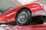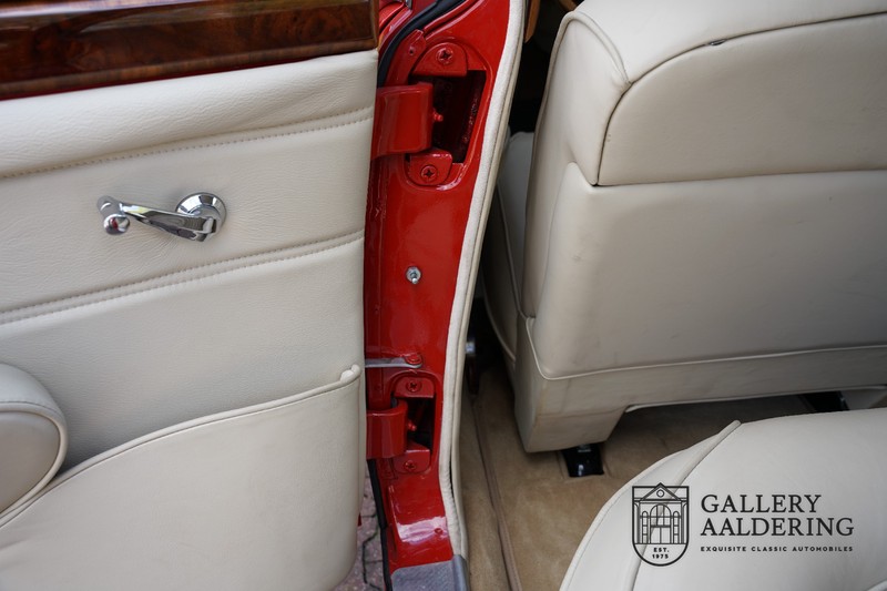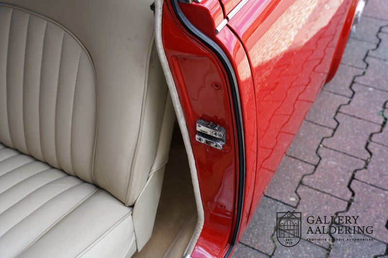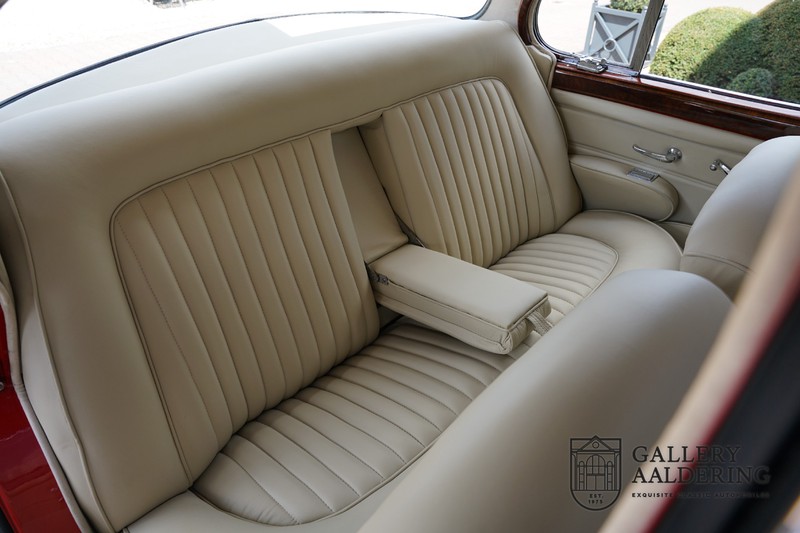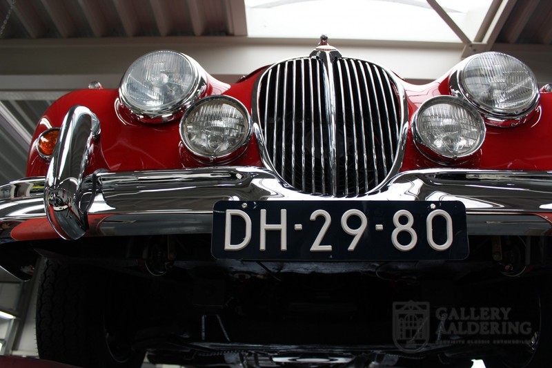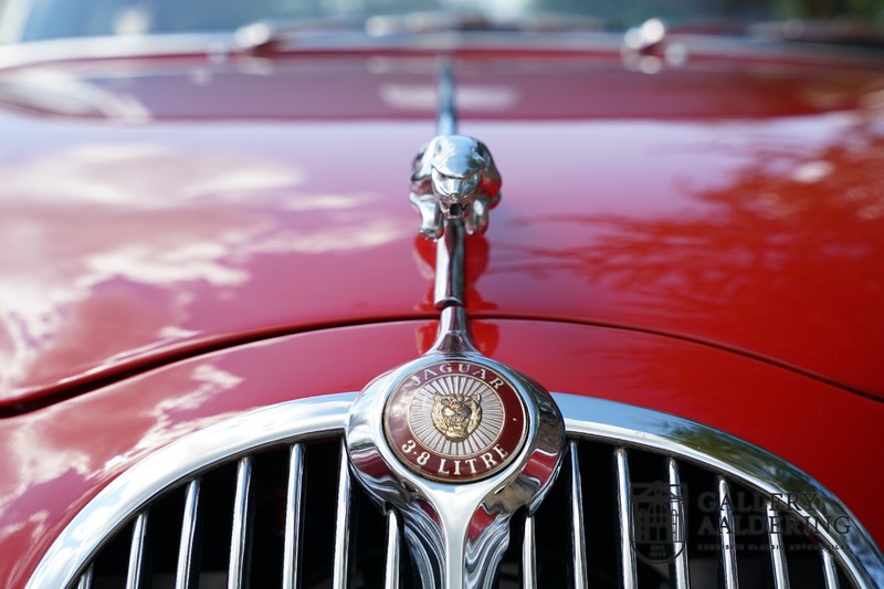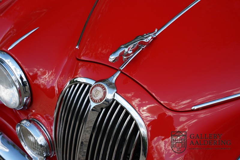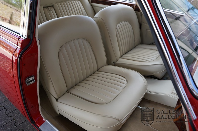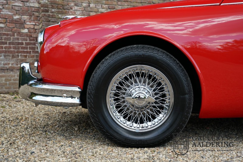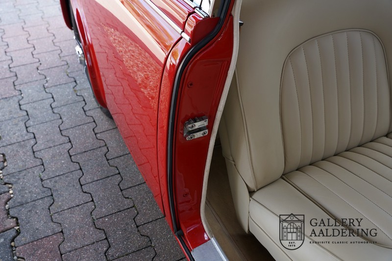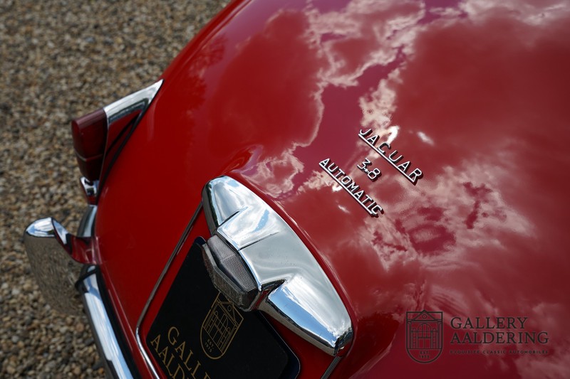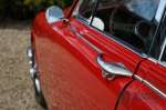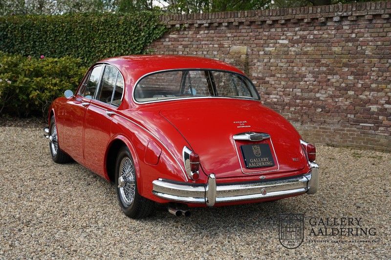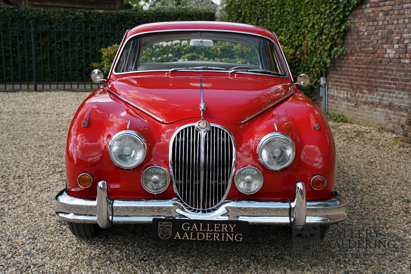 De Mk2 3.8 is zelfs zo krachtig dat bankovervallers in de jaren ’60 steevast een Jaguar Mk2 “leenden” als zij een overval gingen plegen. Dit exemplaar werd in 1966 voor het eerst toegelaten tot het verkeer en kwam in 2002 naar Nederland. De laatste Nederlandse eigenaar had de auto sinds 2012 in bezit en heeft de auto volledig gerestaureerd. De Jaguar verkeert dan ook in prachtige staat. De carrosserie ziet er fantastisch uit. Het plaatwerk is mooi dun en de passingen zijn correct. De auto is opnieuw gespoten in het prachtige Carmine Red en ziet er fantastisch uit. De werkzaamheden zijn overduidelijk zeer goed uitgevoerd. Ook de onderzijde van de Jaguar is een lust voor het oog en illustreert de grondige wijze waarop de auto is gerestaureerd eens te meer. De chromen sierlijsten op de carrosserie, de schijnwerpers op de voorbumper en de verchroomde spaakwielen verkeren eveneens allen in zeer goede conditie.
