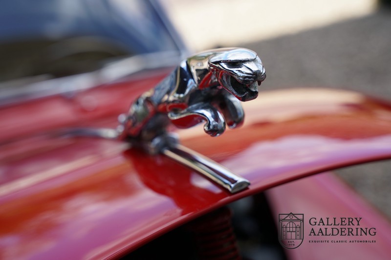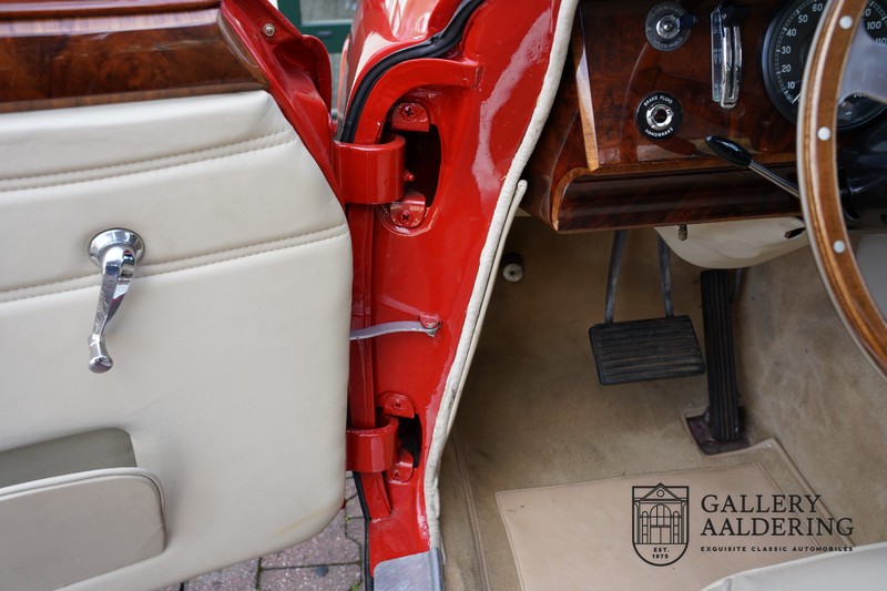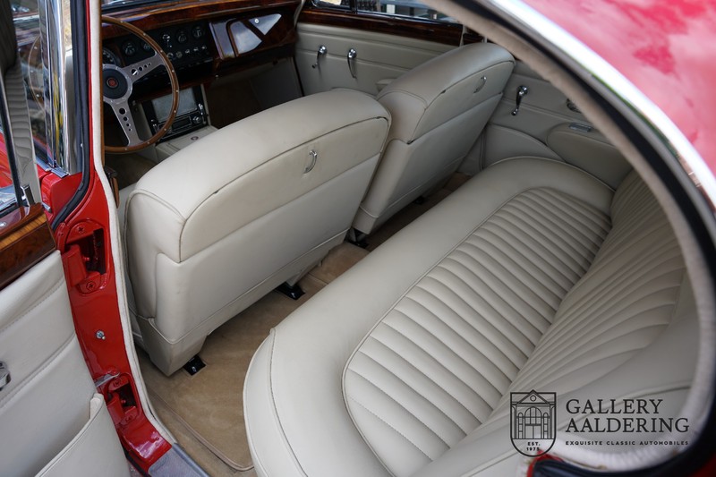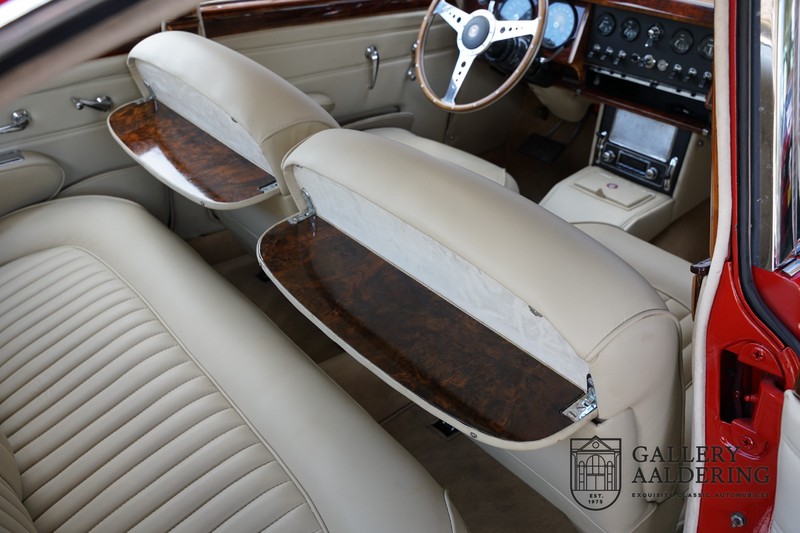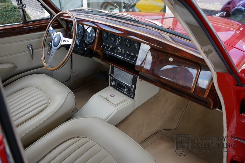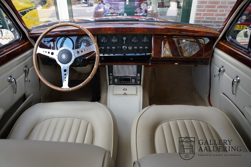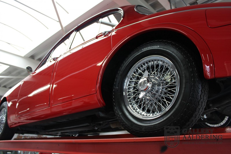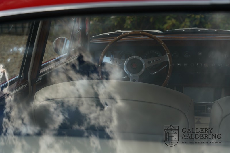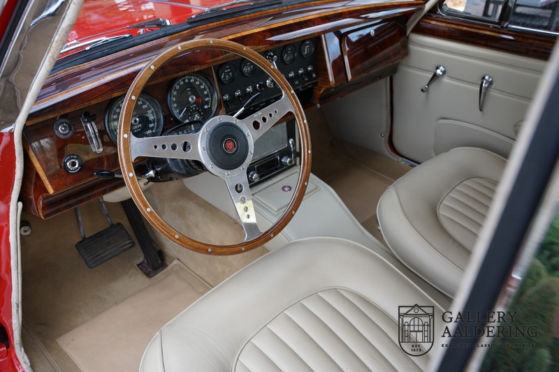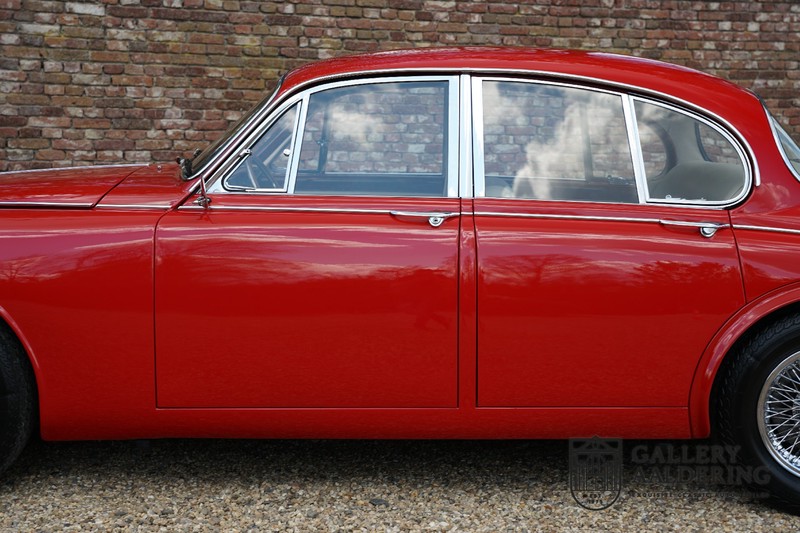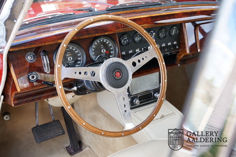 Das Auto ist so schnell, dass in den 60er Jahren die Bankräuber sich meistens einen Jaguar Mk2 liehen um den Fluchtweg abzusichern. Dieses Exemplar hatte seine Erstzulassung in dem Jahr 1966 und wurde in 2002 nach Holland exportiert. Der Letztbesitzer hatte das Auto seit 2012 in seinem Besitz, er hat das Auto komplett restauriert und das Endergebnis ist wunderschön. Die schöne Karosserie hat dünnes Blech und korrekte Passungen. Das Fahrzeug wurde neu lackiert in der wunderschönen Farbe “Carmine Red“, die Arbeiten