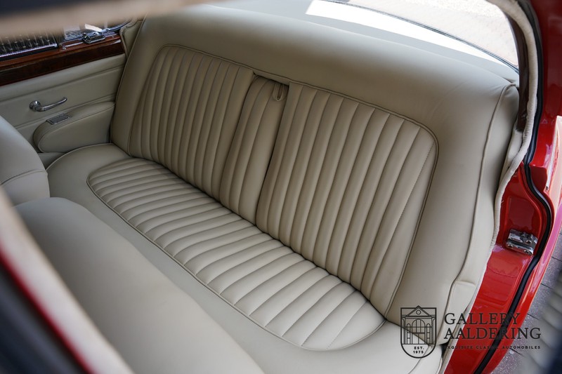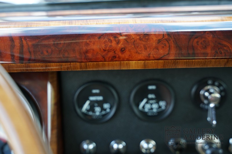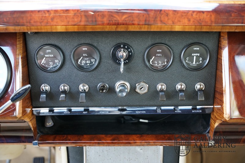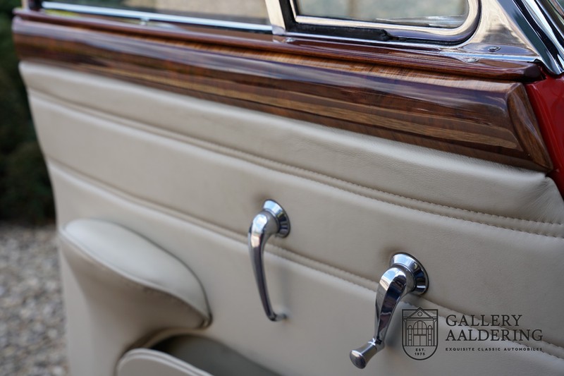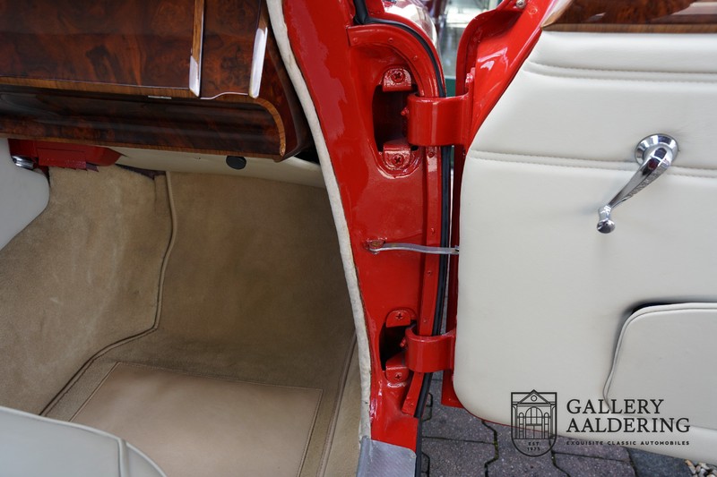 Das Interieur wurde komplett überholt mit einem beigen Teppich und einem schönen geschmeidigen beigen Leder auf den Vordersitzen und im Fond. Die Teppiche haben eine perfekte Passform und das Leder sieht noch aus wie neu. Die Holzeinlagen im Armaturenbrett und die Instrumente befinden sich in einem sehr guten Zustand. Auch der Dachhimmel und der Kofferraum sehen fantastisch aus und lassen keine Wünsche offen. Es wurde bei der Restaurierung mit viele Auge fürs Detail gearbeitet.