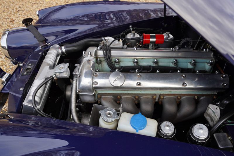 The 3.8-liter straight-six has not only been completely overhauled and tuned but has also been extremely well maintained, exclusively by brand specialists with a passion for these types of cars. Due to that maintenance, which naturally went far beyond just the engine, this XK150 drives truly perfectly. Every classic car feels different, and even every same model drives differently. The engine sounds and runs beautifully. The power is noticeably higher than standard; the XK pulls through the revs wonderfully. A fantastically performing six-cylinder! Enjoyable driving, however, goes beyond just the engine, and fortunately, we can add that the chassis is also very good and adapted for rallies, tours, and intensive use without losing sight of comfort. The XK150 still gives the driver the feeling of being in a real sports car. Good brakes also bring the speed down in a timely manner.