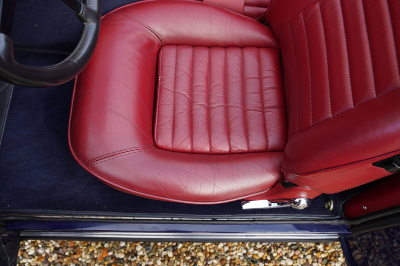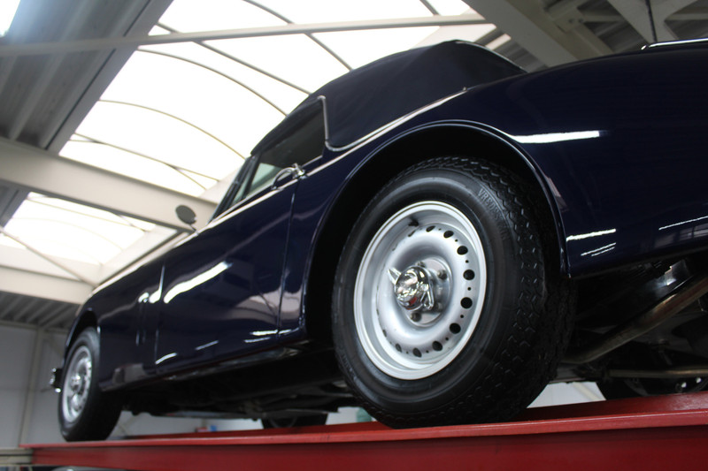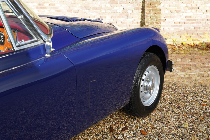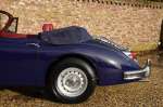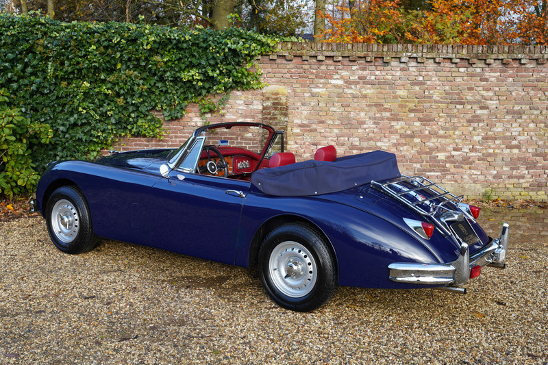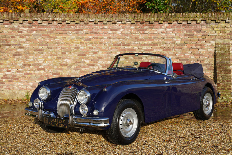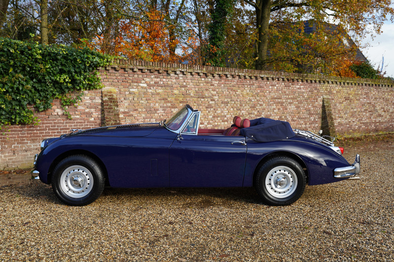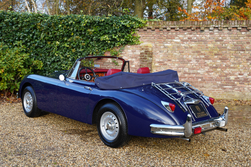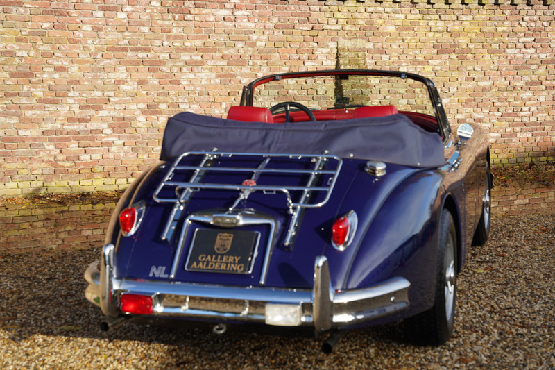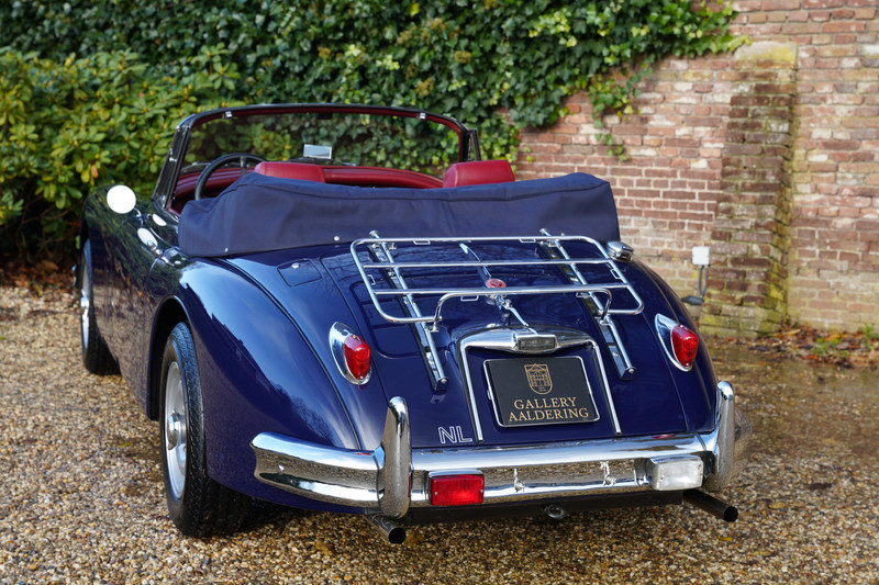 Dark blue, beautiful red leather, and of course, all the fantastic technology of an XK150 in a fully restored and overhauled ‘coat’: this Jaguar undoubtedly manages to convince! As if that’s not enough, the XK also has been given several upgrades, most of which are invisible, but some catch the eye, such as the D-type wheels.