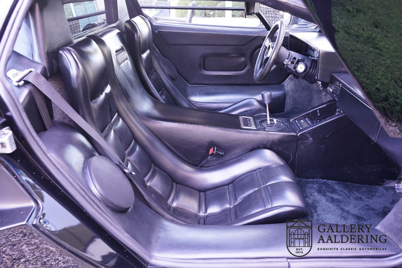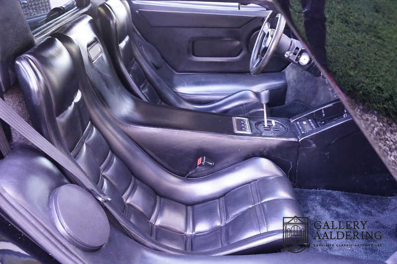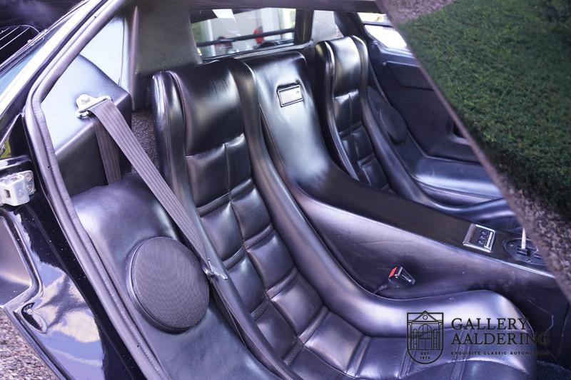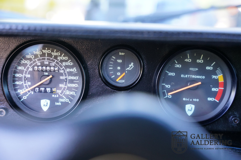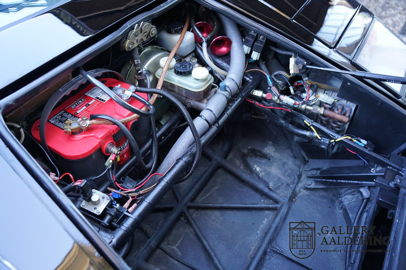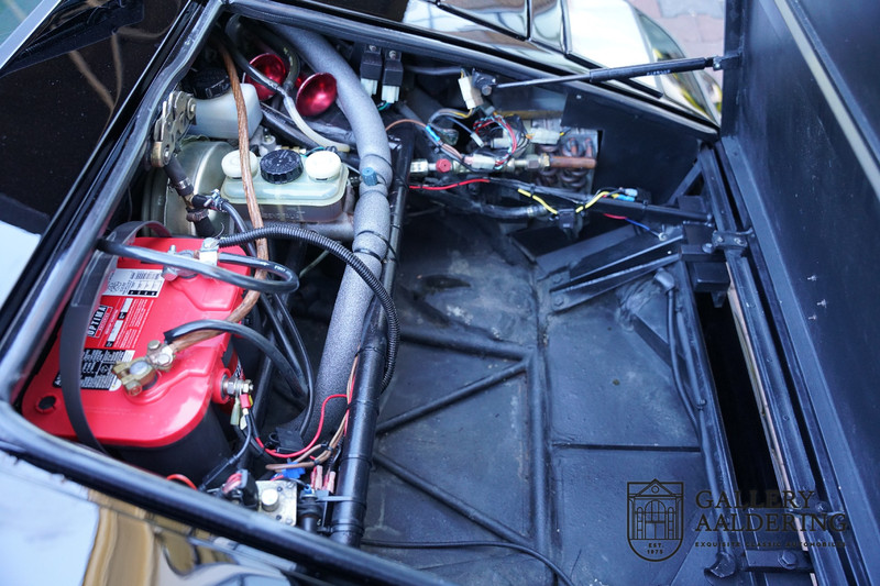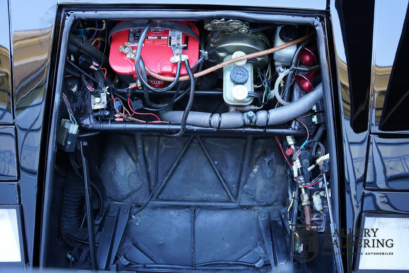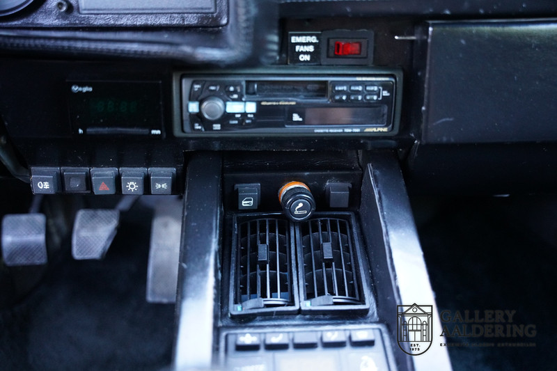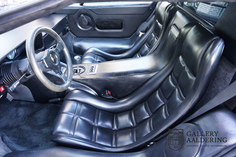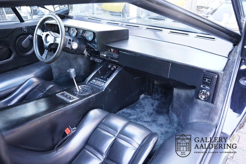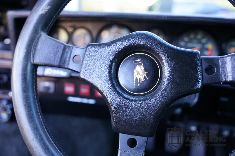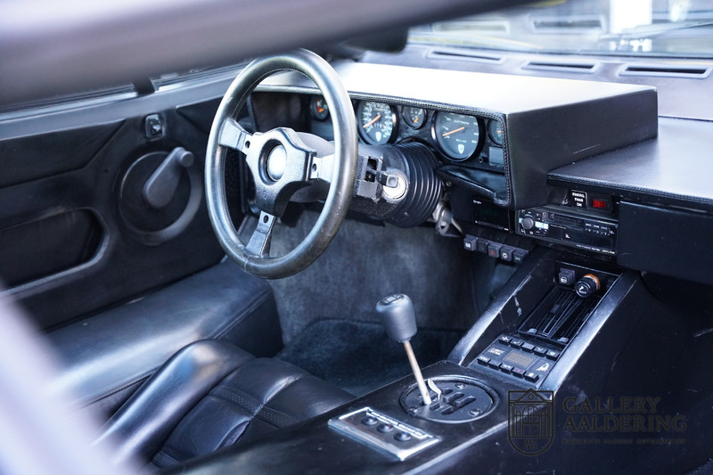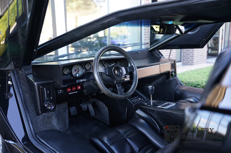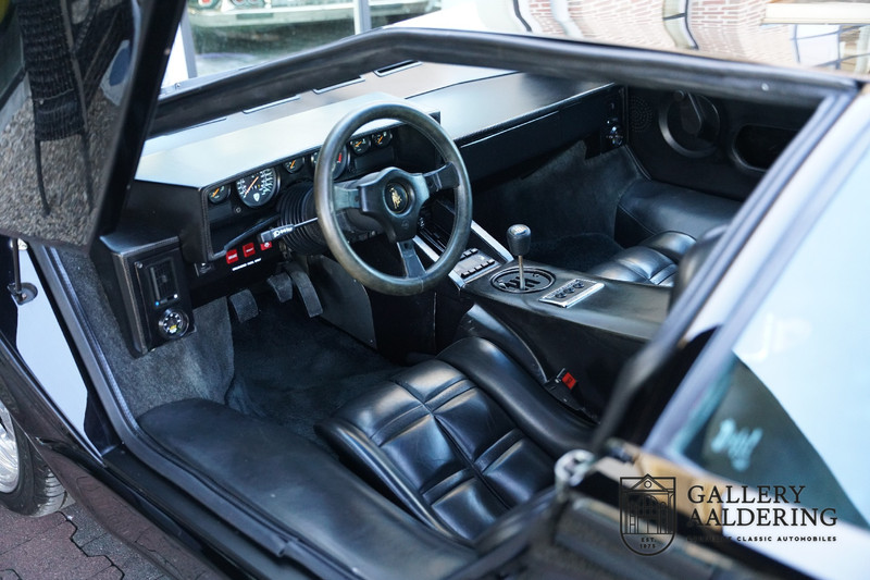 The bodywork is in very good condition, with correct fittings and all doors and hatches close properly. The paintwork has recently been renewed and is therefore in new condition. The black paintwork combines beautifully with the 17-inch five-spoke Lamborghini wheels. The appearance of the Countach is perfectly suited as a poster car. The look is incomparable, the wide air inlets, the four tailpipes of the exhaust system, the large rims: Here is a raging bull, and rightly so.