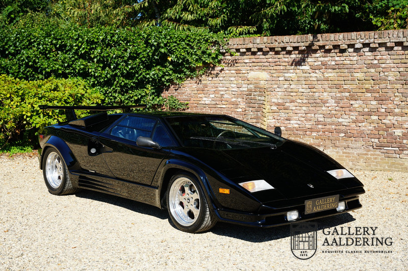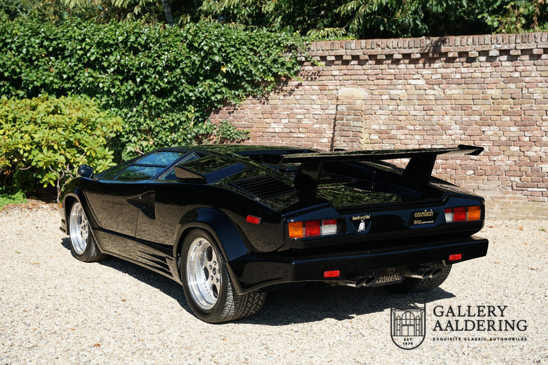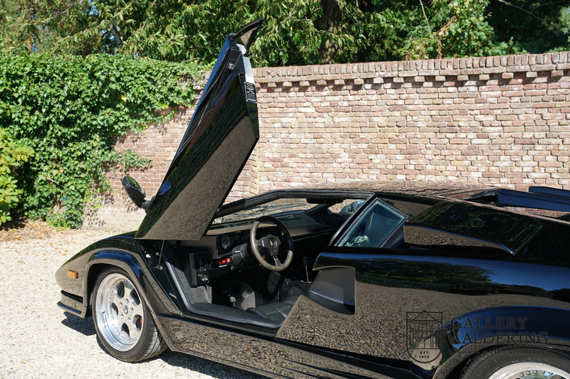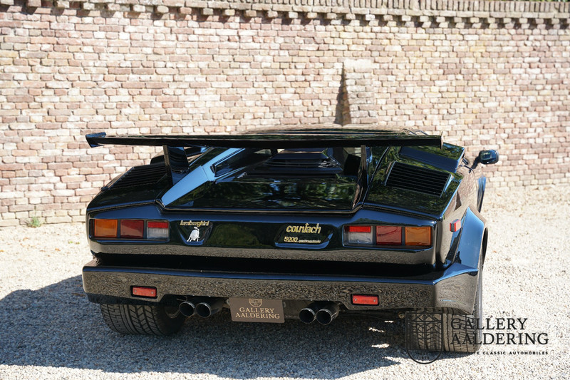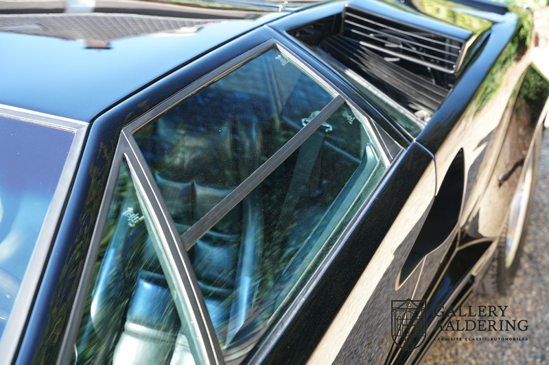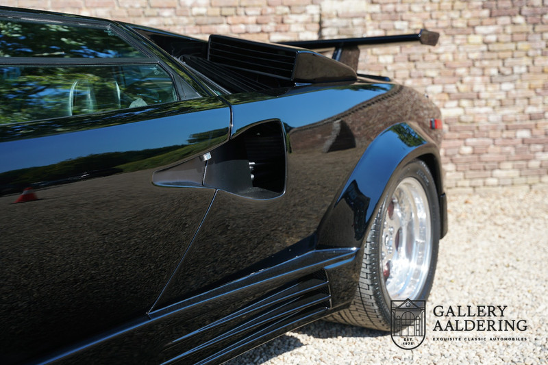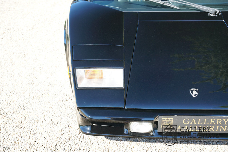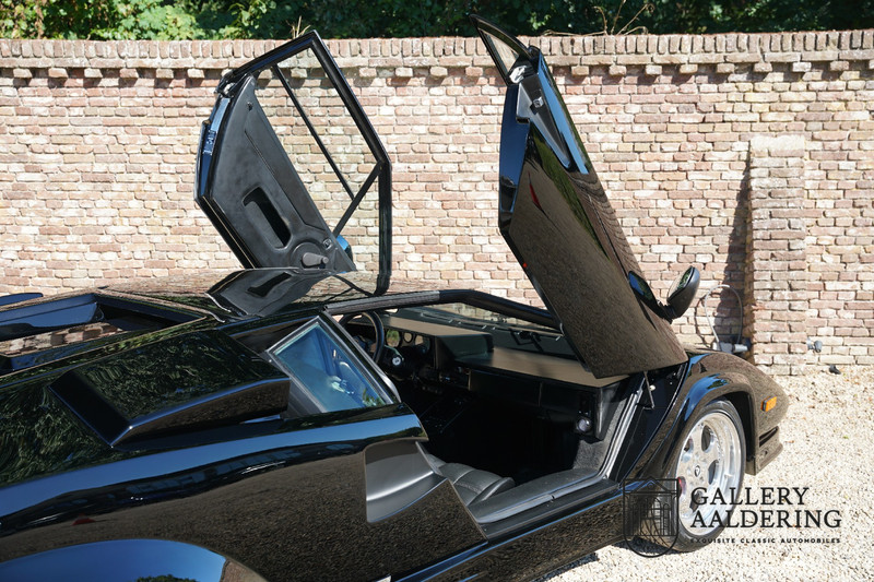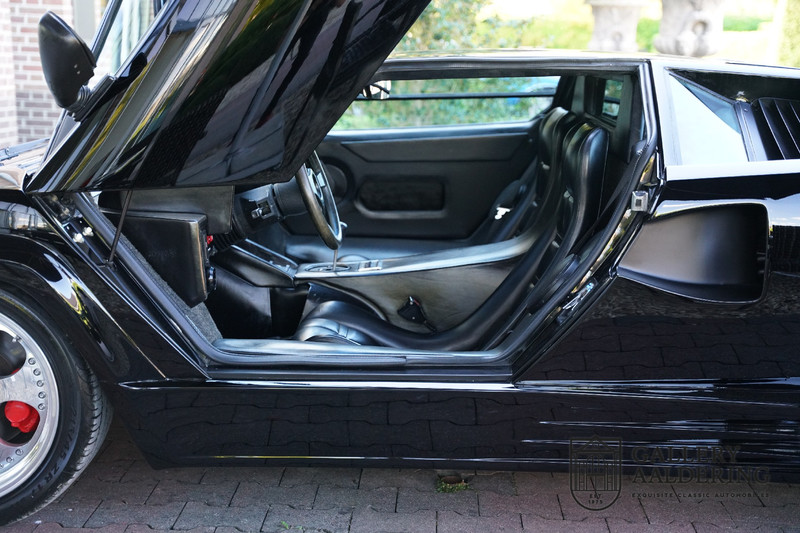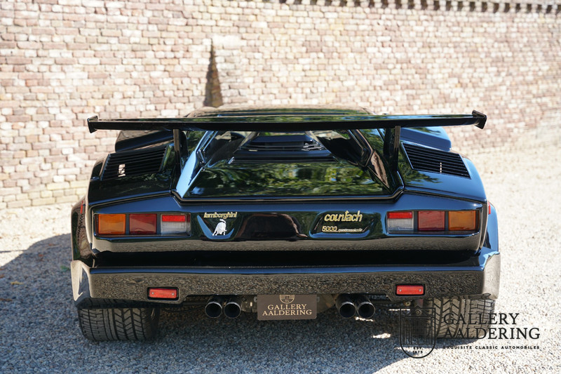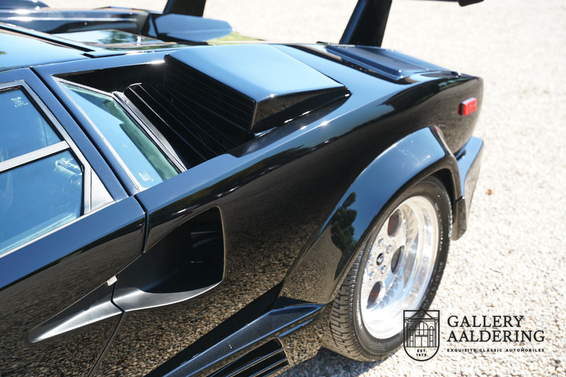 Countach is Piemontees dialect voor: verbazingwekkend of prachtig. Een Piemontese medewerker van Lamborghini bleef het maar herhalen tijdens de ontwikkeling van de auto dat uiteindelijk werd besloten de auto Countach te dopen. Het is een treffende naam voor zo’n bijzondere auto, dat had Ferruccio Lamborghini al snel door. Dit exemplaar werd in mei 1988 gebouwd in Sant Agatha Bolognese in Italië en is kort daarna naar de Verenigde Staten gegaan. De auto is daar immer door liefhebbers gekoesterd en ziet er nog steeds prachtig uit. De auto heeft nog maar 33.000 kilometer gereden en als we kijken naar de algehele staat van de auto dan kunnen we niet anders concluderen dan dat dit de originele kilometerstand is. Gelukkig betreft hier een Europese uitvoering die vele malen mooier is dan de auto’s die van meet af aan voor de Amerikaanse markt zijn bedoeld. Als kers op de taart is deze auto ook nog eens voorzien van een originele achterspoiler, om de looks compleet te maken.