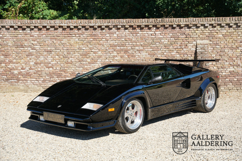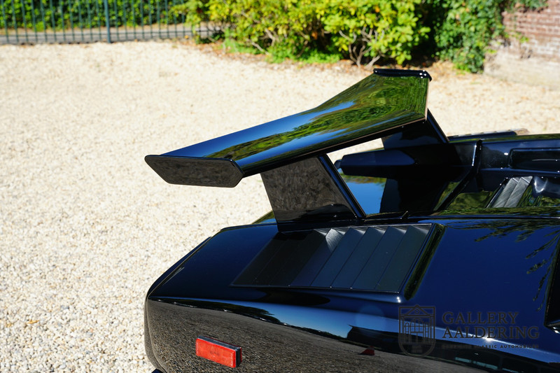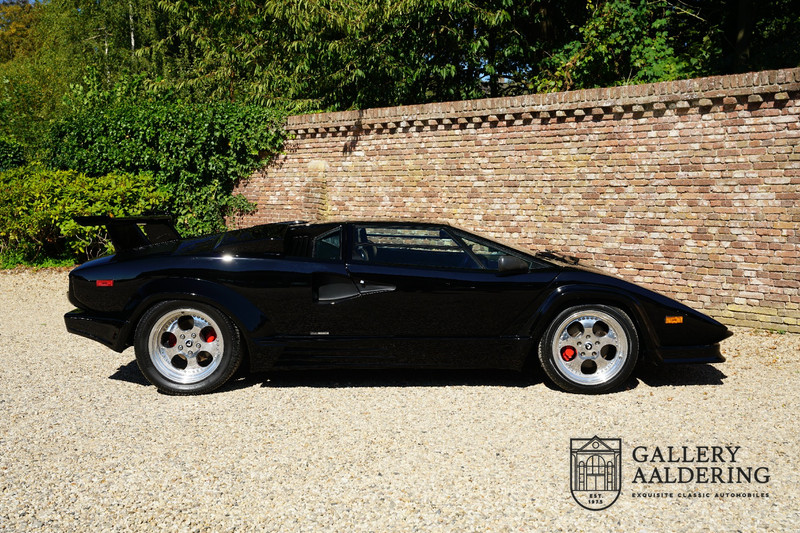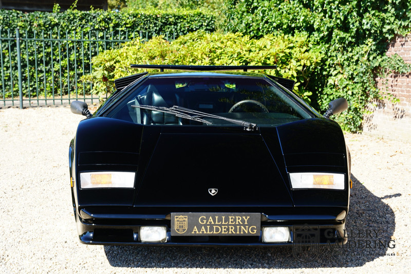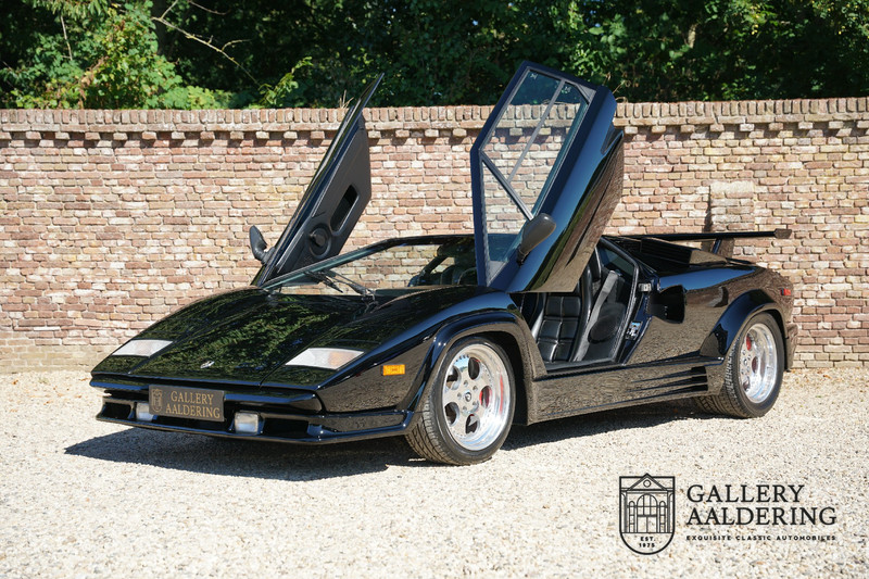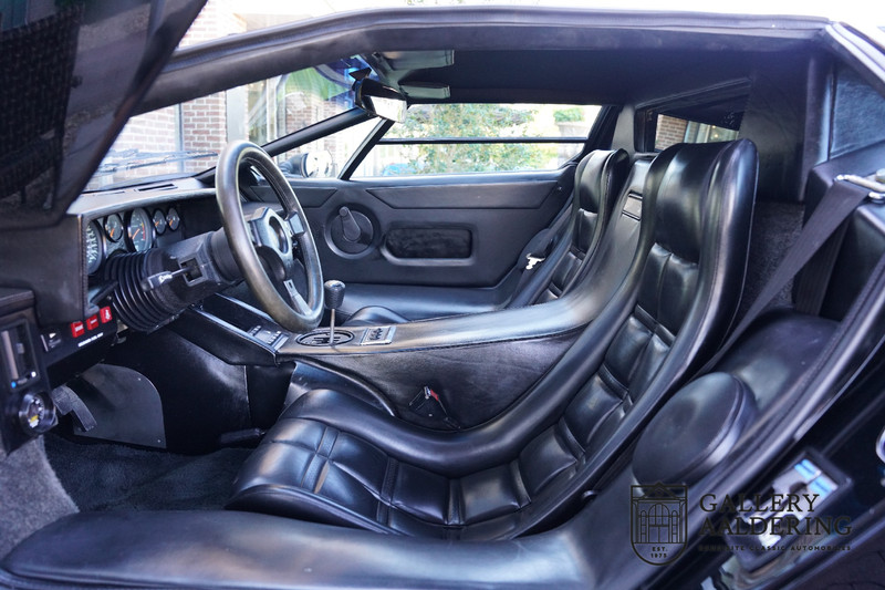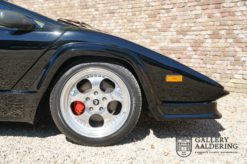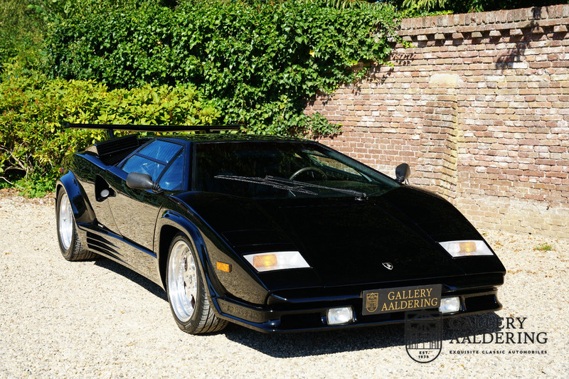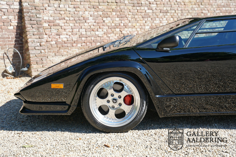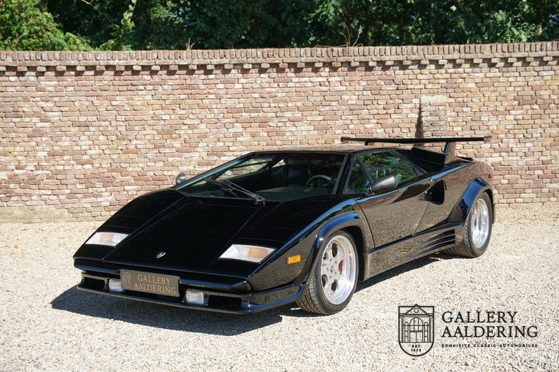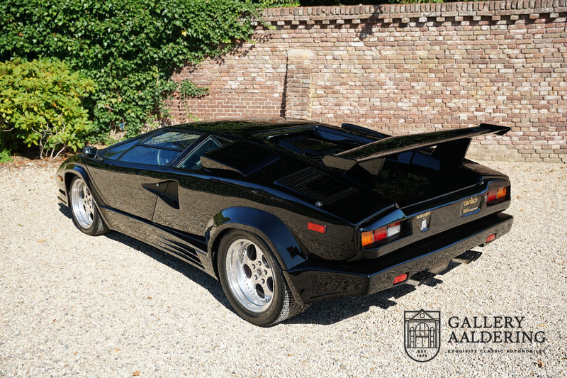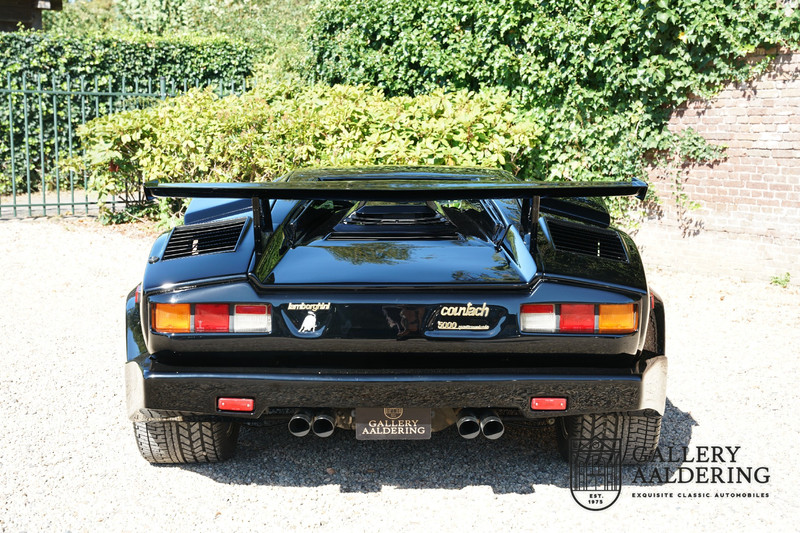 Countach is Piemontees dialect voor: verbazingwekkend of prachtig. Een Piemontese medewerker van Lamborghini bleef het maar herhalen tijdens de ontwikkeling van de auto dat uiteindelijk werd besloten de auto Countach te dopen. Het is een treffende naam voor zo’n bijzondere auto, dat had Ferruccio Lamborghini al snel door. Dit exemplaar werd in mei 1988 gebouwd in Sant Agatha Bolognese in Italië en is kort daarna naar de Verenigde Staten gegaan. De auto is daar immer door liefhebbers gekoesterd en ziet er nog steeds prachtig uit. De auto heeft nog maar 33.000 kilometer gereden en als we kijken naar de algehele staat van de auto dan kunnen we niet anders concluderen dan dat dit de originele kilometerstand is. Gelukkig betreft hier een Europese uitvoering die vele malen mooier is dan de auto’s die van meet af aan voor de Amerikaanse markt zijn bedoeld. Als kers op de taart is deze auto ook nog eens voorzien van een originele achterspoiler, om de looks compleet te maken.