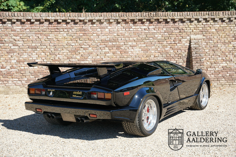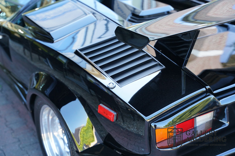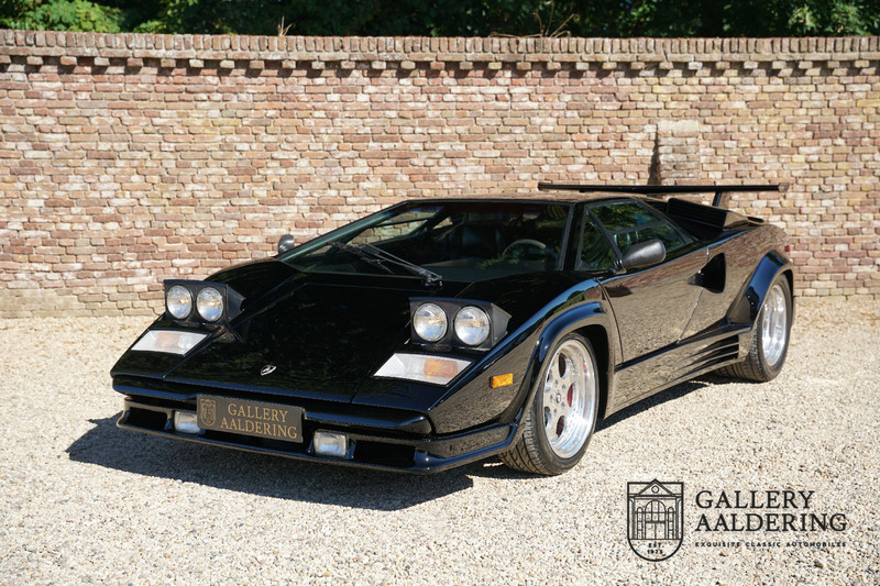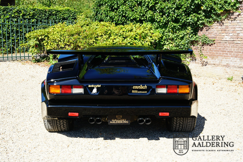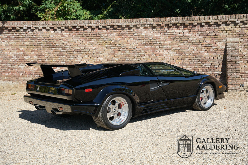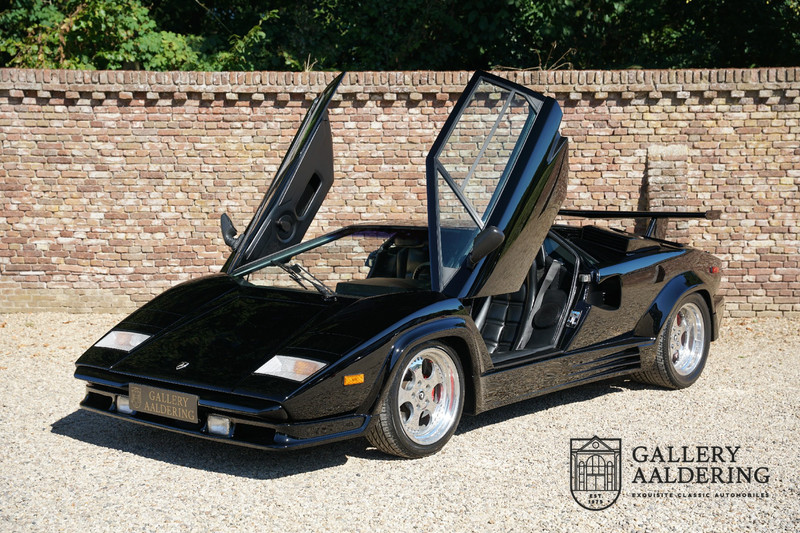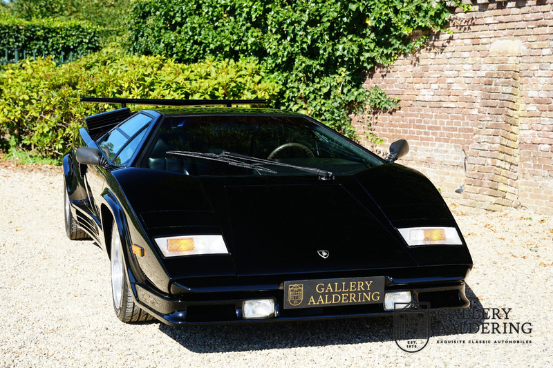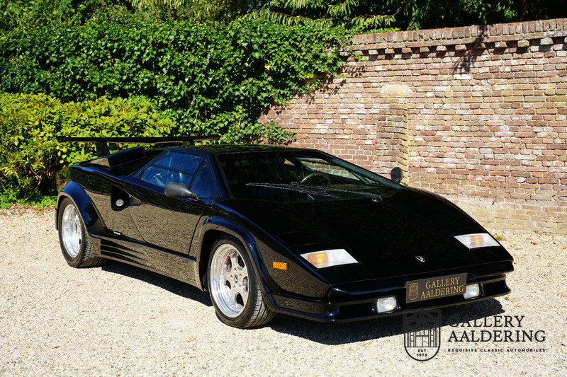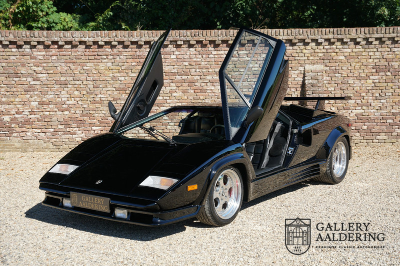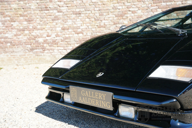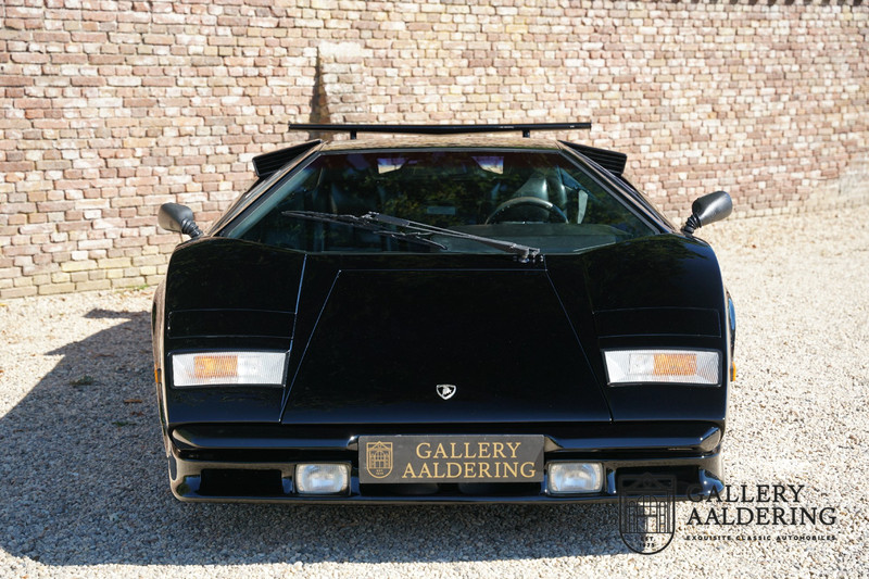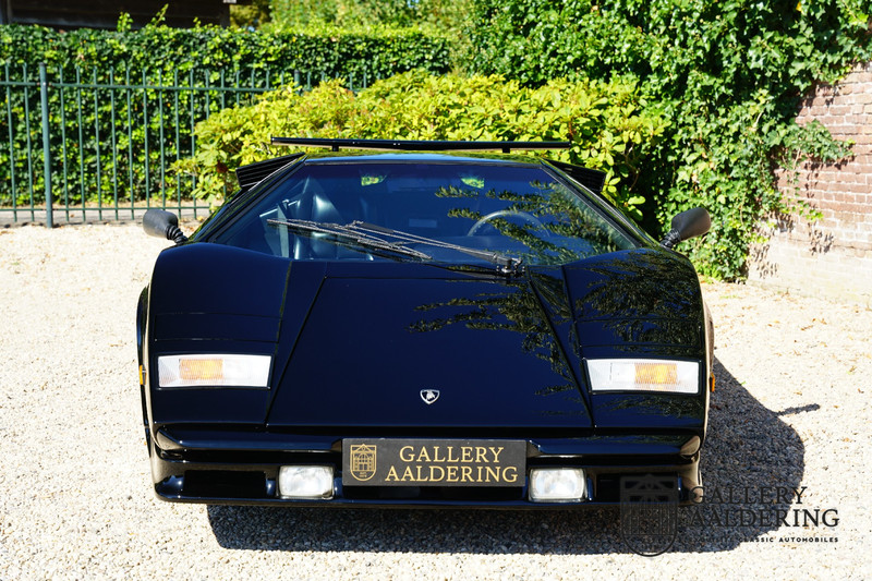 Countach is Piemontees dialect voor: verbazingwekkend of prachtig. Een Piemontese medewerker van Lamborghini bleef het maar herhalen tijdens de ontwikkeling van de auto dat uiteindelijk werd besloten de auto Countach te dopen. Het is een treffende naam voor zo’n bijzondere auto, dat had Ferruccio Lamborghini al snel door. Dit exemplaar werd in mei 1988 gebouwd in Sant Agatha Bolognese in Italië en is kort daarna naar de Verenigde Staten gegaan. De auto is daar immer door liefhebbers gekoesterd en ziet er nog steeds prachtig uit. De auto heeft nog maar 33.000 kilometer gereden en als we kijken naar de algehele staat van de auto dan kunnen we niet anders concluderen dan dat dit de originele kilometerstand is. Gelukkig betreft hier een Europese uitvoering die vele malen mooier is dan de auto’s die van meet af aan voor de Amerikaanse markt zijn bedoeld. Als kers op de taart is deze auto ook nog eens voorzien van een originele achterspoiler, om de looks compleet te maken.