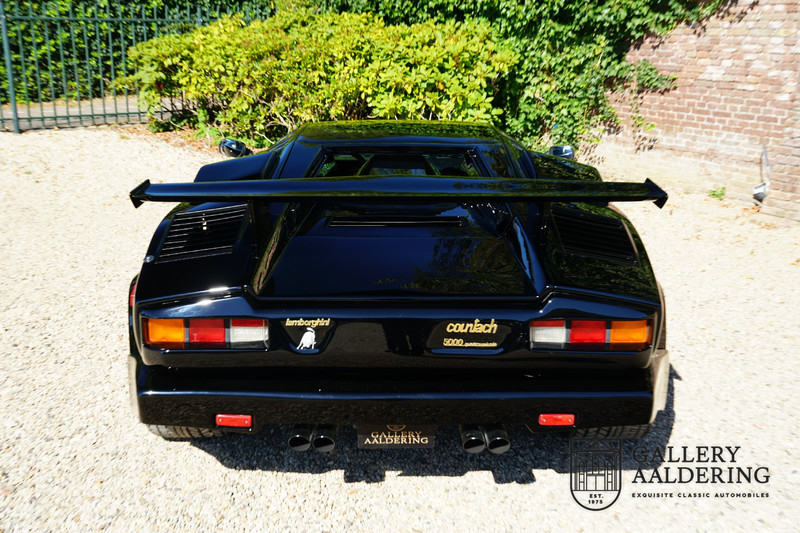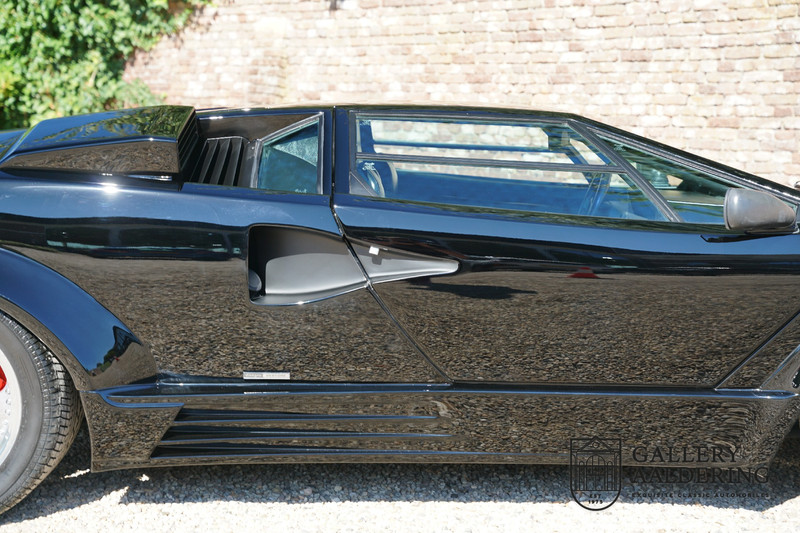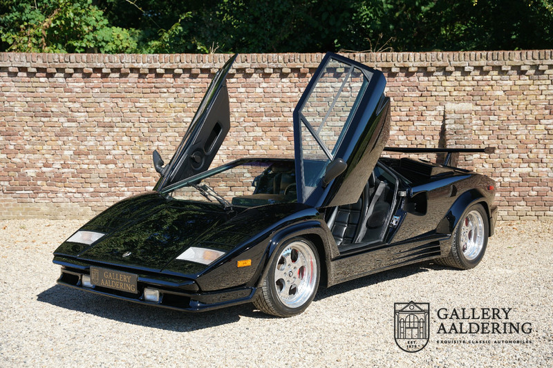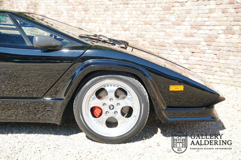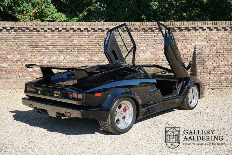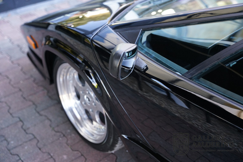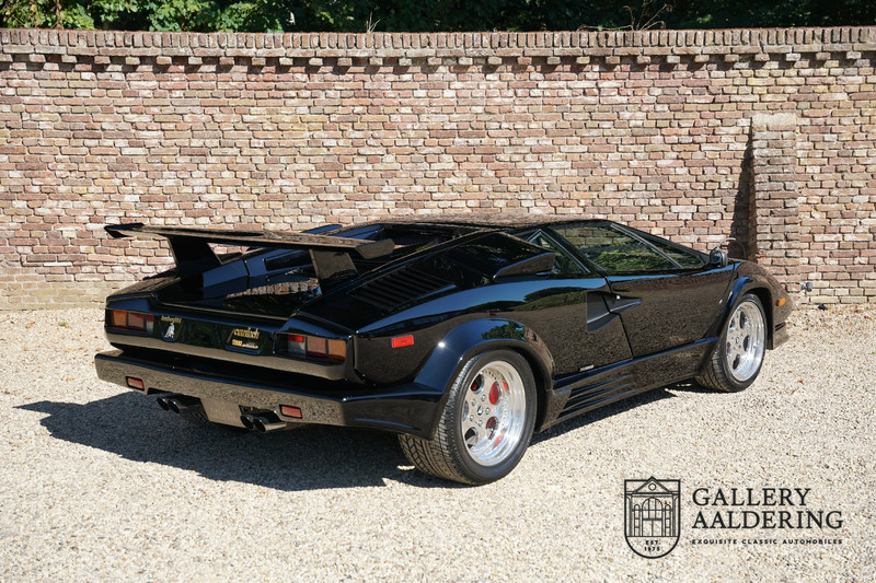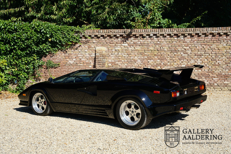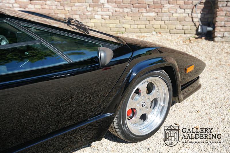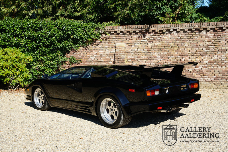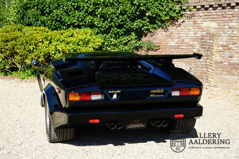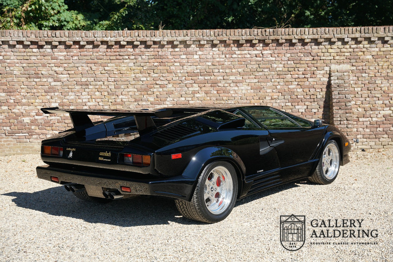 Countach is Piemontees dialect voor: verbazingwekkend of prachtig. Een Piemontese medewerker van Lamborghini bleef het maar herhalen tijdens de ontwikkeling van de auto dat uiteindelijk werd besloten de auto Countach te dopen. Het is een treffende naam voor zo’n bijzondere auto, dat had Ferruccio Lamborghini al snel door. Dit exemplaar werd in mei 1988 gebouwd in Sant Agatha Bolognese in Italië en is kort daarna naar de Verenigde Staten gegaan. De auto is daar immer door liefhebbers gekoesterd en ziet er nog steeds prachtig uit. De auto heeft nog maar 33.000 kilometer gereden en als we kijken naar de algehele staat van de auto dan kunnen we niet anders concluderen dan dat dit de originele kilometerstand is. Gelukkig betreft hier een Europese uitvoering die vele malen mooier is dan de auto’s die van meet af aan voor de Amerikaanse markt zijn bedoeld. Als kers op de taart is deze auto ook nog eens voorzien van een originele achterspoiler, om de looks compleet te maken.