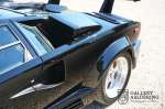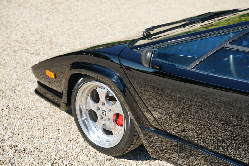 Die Karosserie befindet sich in sehr gutem Zustand, sie hat korrekte Passungen und alle Türen und Klappen schließen einwandfrei. Der Lack wurde vor kurzem erneuert und befindet sich dementsprechend in neuwertigem Zustand. Die schwarze Lackierung lässt sich wunderschön kombinieren mit den 17-Zoll-Fünfspeichen-Lamborghini-Rädern. Das Erscheinungsbild des Countach ist perfekt geeignet als Poster Car. Die Optik ist unvergleichbar, die breiten Lufteinlässe, die vier Endrohren der Auspuffanlage, die großen Felgen: Hier steht zu Recht ein wütender Stier.