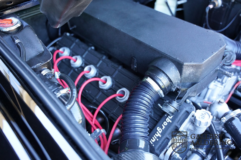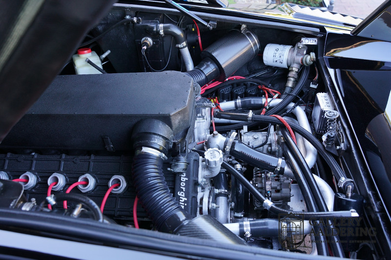 wurde fachmännisch durchgeführt, so wurde das Auto zum Beispiel mit separaten Zündspulen versehen, welche eine separate Steuerung haben und dazu wurde die Zündung sehr gut und fachmännisch eingestellt. Wenn wir den Countach 5000 Quattrovalvole fahren, dann ist es natürlich keine Überraschung, dass ein Auto mit 450 PS an Leistung sehr schnell ist, aber die Überraschung ist umso größer, denn der Motor hat auch eine fantastische Laufruhe. Der 5.2 Liter V12-Motor ist mit sechs Doppelvergasern der Marke Weber ausgestattet, die einen unvergleichlichen Sound erzeugen. Wenn der Countach höher in die Drehzahlen kommt, steigt die Leistung mit jeder 100 U / min und der Motor produziert dabei einen fantastischen Sound. Das Getriebe stammt aus einer Zeit, als man sich keine Sorgen gemacht hat um die Endübersetzung um vielleicht die CO2-Emissionen zu begrenzen, daher grenzen die Getriebeübersetzungen an Perfektion. Wenn Sie den Motor voll beschleunigen lassen und in den nächsten Gang schalten, fällt der Motor sofort zurück in einem vollen Leistungspotenzial und das Fest kann wieder von vorne anfangen, unabhängig davon, welchen Gang oder welche Geschwindigkeit Sie gerade fahren. Bremsen und Fahrwerk befinden sich ebenfalls in sehr gutem Zustand und tragen zur schönen Symbiose zwischen Motorsound und Fahrverhalten bei.