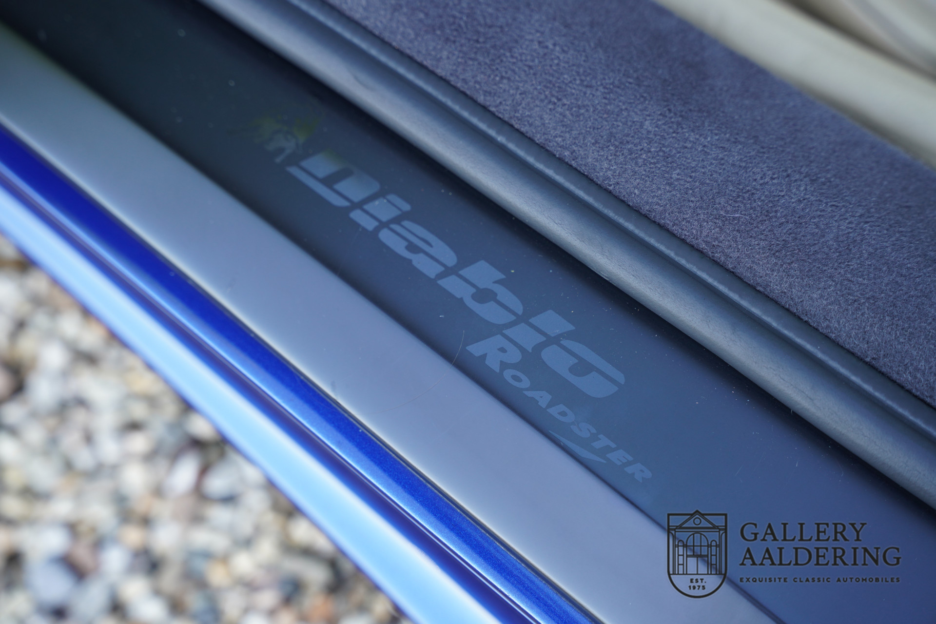 Das Ergebnis ist erstaunlich, ein Diablo Roadster VT, der sich tatsächlich in neuwertigem Zustand befindet und in einer wunderschönen Farbgebung. Eine beliebte offene Version vom Diablo, die bereit ist für ein neues Kapitel in seinem aufregenden Jungenbuch. Dieses Jungenbuch wird komplett mit Rechnungen und Originalbroschüren in der Original-Wildledermappe geliefert. Sie werden wahrscheinlich kein besseres Exemplar finden können.