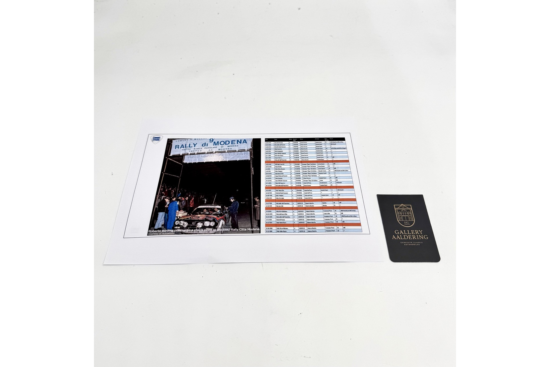During the nineteen seventies this Lancia was entered in numerous rally events and was driven by several drivers, including Bruno Ferraris and Giuseppe Pippo De Stefano. In 1977 the car was sold to Roberto Beretta, who continued to campaign the Beta Coupe in rallies until 1980. Since that period the car has remained in the recognizable Beretta Lecco livery in which it competed during those years.