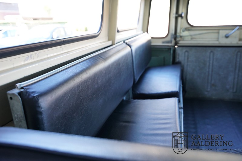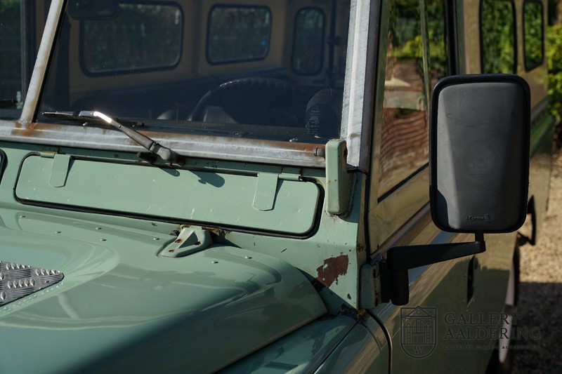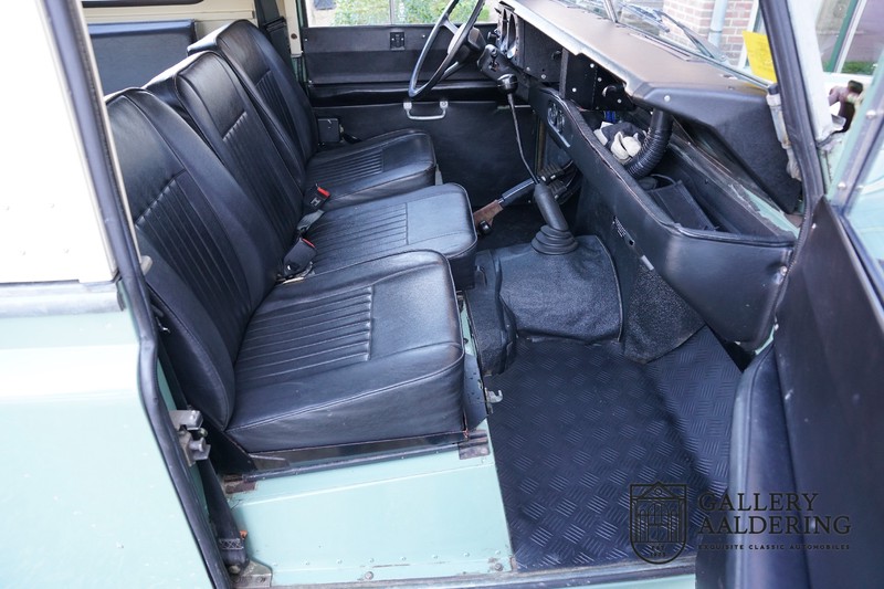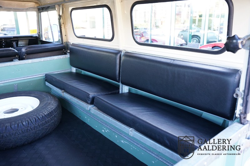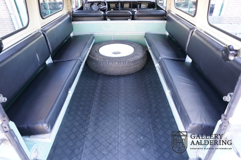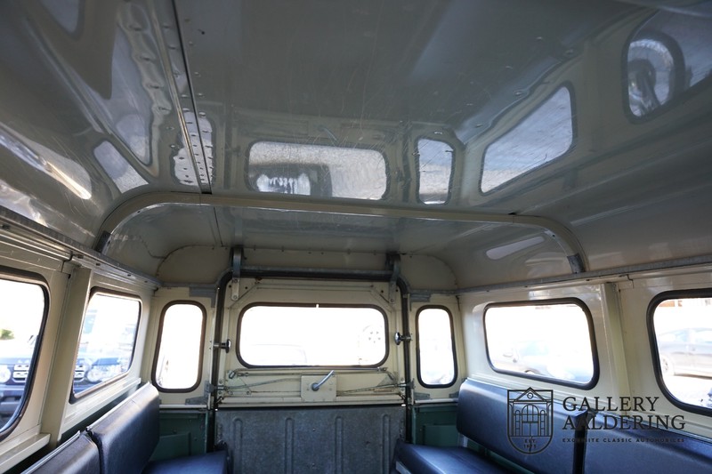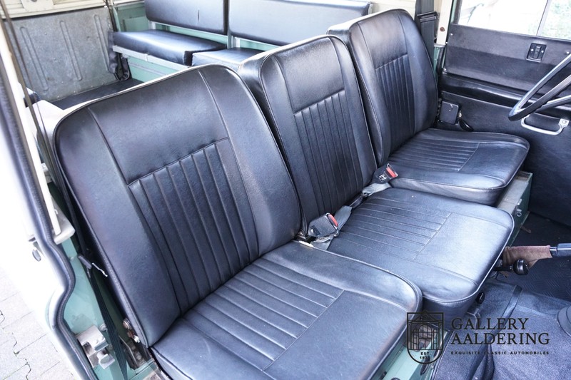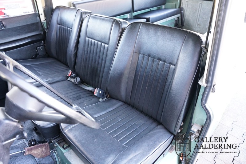 Im Interieur des Autos ist selbstverständlich alles funktionsfähig. Der Land Rover ist zum Arbeiten gemacht und so ist auch die Innenausstattung dekoriert. Das heißt aber nicht, dass das Auto wirklich hart arbeiten musste, das Interieur wurde gut gepflegt und befindet sich noch in einem sehr guten Zustand. Das Armaturenbrett wurde ebenso gut gepflegt, wie auch die Bedienelemente und Instrumente. Gut zu wissen ist auch, dass es sich um ein Auto mit Sitzbänken im Fond handelt. Das Auto bietet unglaublich viel Platz, vorne ist Platz für 3 Personen und hinten für weitere 8 Personen! Können Sie ein modernes Auto dieser Größe nennen, das Platz für 11 Personen bietet?