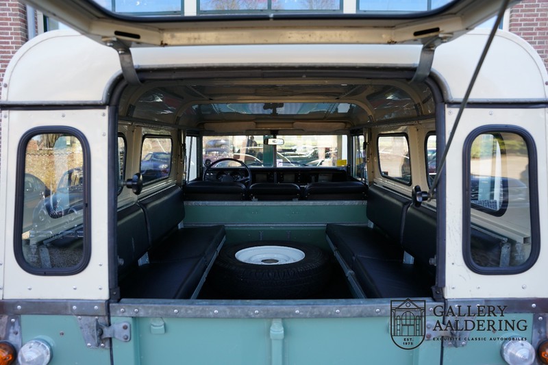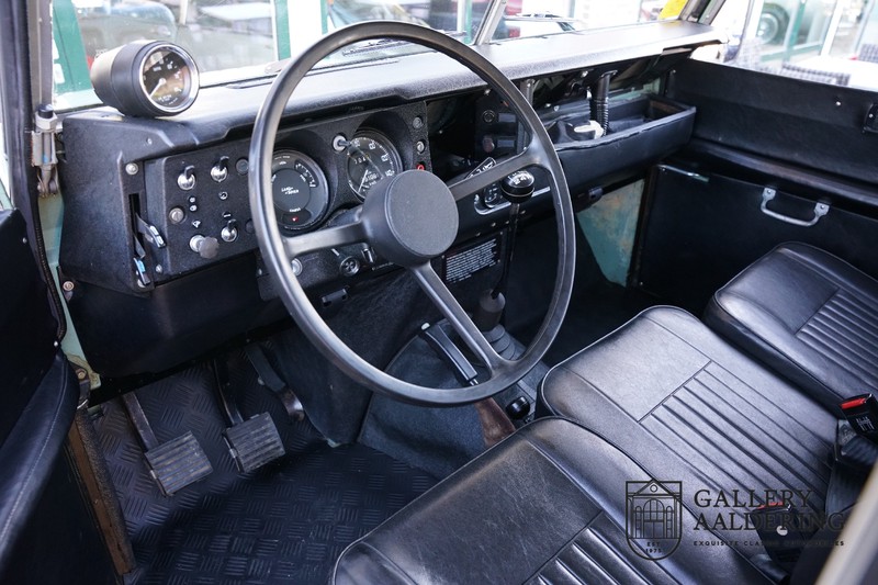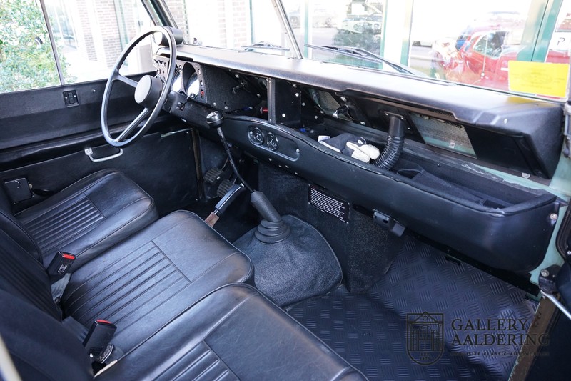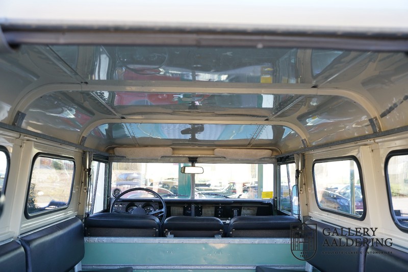 De binnenzijde van de Land Rover is vanzelfsprekend volledig functioneel. De auto is gemaakt om te werken en op die manier is de binnenzijde ook ingericht. Dat wil overigens niet zeggen dat de auto ook daadwerkelijk hard heeft moeten werken, het interieur ziet er namelijk keurig verzorgd uit en is nog altijd in zeer goede staat verkerend. Het dashboard is keurig verzorgd evenals de bedieningselementen en instrumenten. Wat tevens goed is om te weten is dat het hier een auto betreft met banken achterin. De auto biedt dan ook ongelooflijk veel plaats aan personen. Voorin is er plaats voor drie personen en achterin kunnen ook nog eens 8 personen plaatsnemen! Noemt u eens een hedendaagse auto van dit formaat waar u 11 personen in mee kunt nemen?