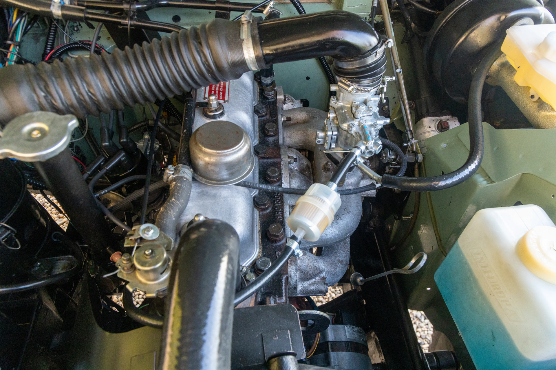What sets this vehicle apart immediately is its bodywork: it is exceptionally straight and clean—something we rarely encounter on a Series III. The crisp, well-defined panels accentuate the classic lines beautifully. Paired with a high-quality dark-green ¾ canvas top with side windows, this Land Rover manages to feel both utilitarian and surprisingly stylish.