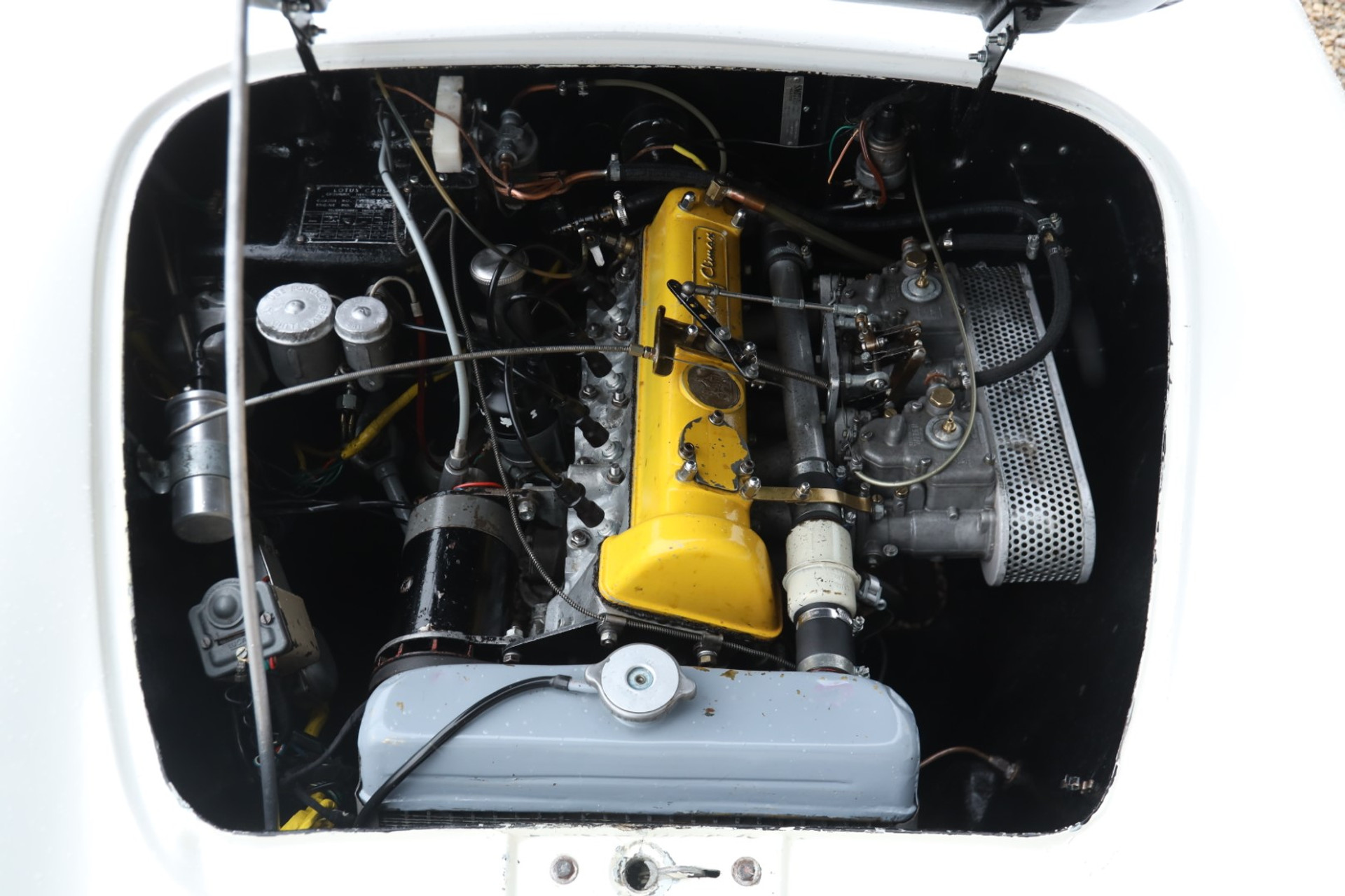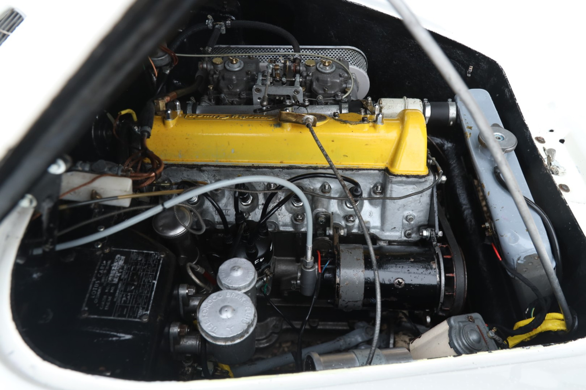 Technisch war der Super 100 ein kleines Meisterwerk. Der bekannte Coventry Climax FWE-Vierzylinder erhielt ein Performance-Update: doppelte Weber-Vergaser, ein speziell angefertigter Auspuffkrümmer, dazu ein ZF-Getriebe – präzise, robust und meilenweit überlegen gegenüber den anfälligen Schaltboxen der Serien-Elites. Hinzu kamen filigrane Borrani-Räder, eine Langstrecken-Tanklösung sowie ein Monza-Tankverschluss, wie man ihn sonst nur an reinrassigen Rennwagen fand.