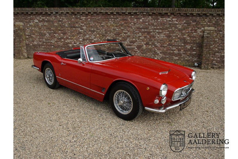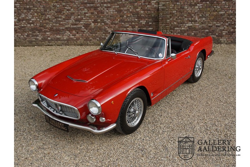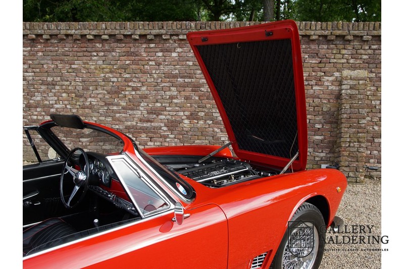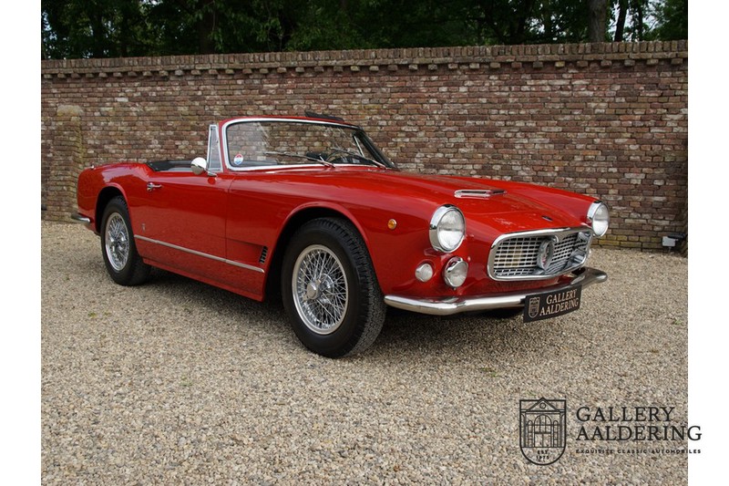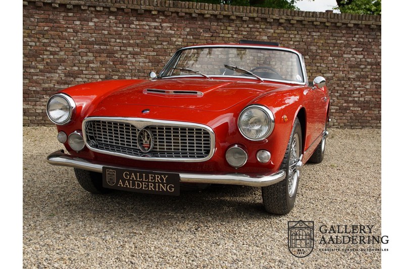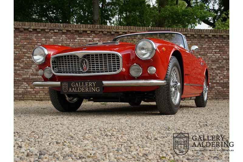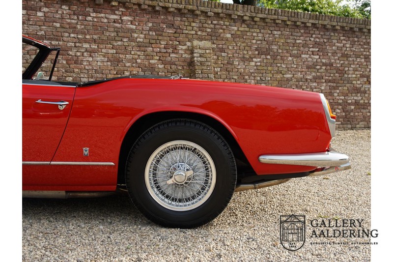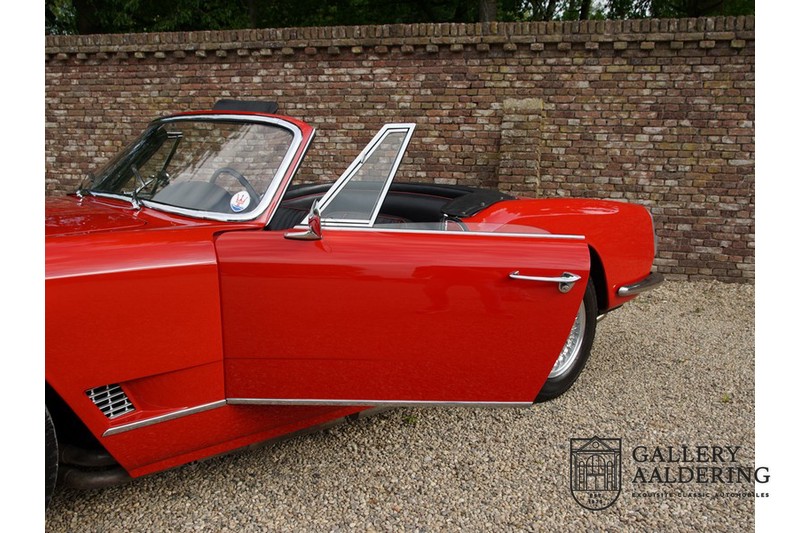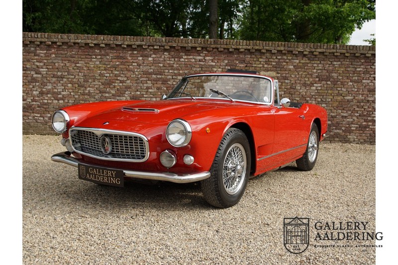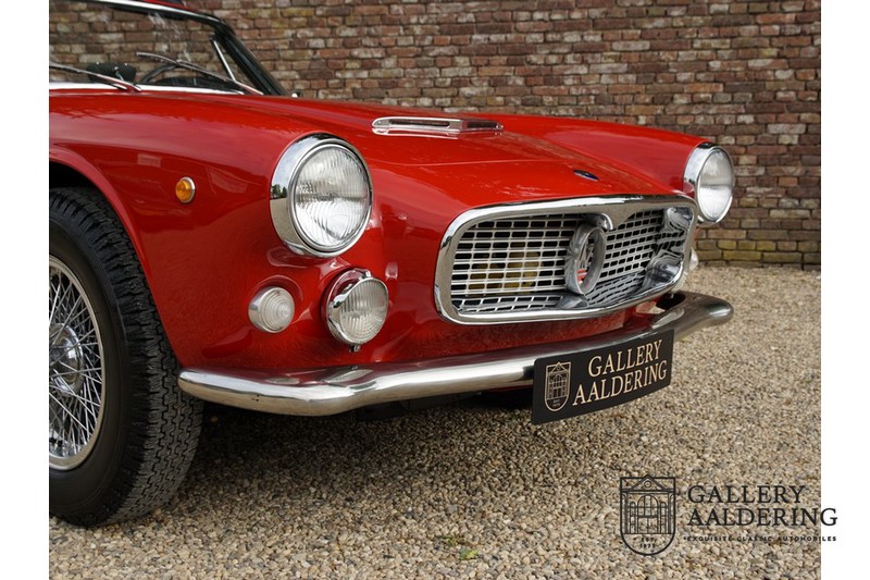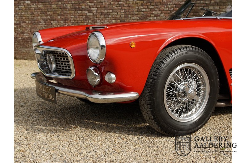 This wonderful Maserati 3500GT Vignale Spyder left the factory for the States on the 15th September 1960. This is one of just 242 Vignales ever made. It was only registered for the 1st time in 1976! In 1984 it was sold to a collector in Fort Lauderdale, Florida. Two years later the car made its way to a Dutch Maserati collector, who completely had the car completely restored. A superb result was achieved after 2years, much effort and expense. The beautiful bodywork is straight and has perfect fitting body panels. It has a delightful 5-speed ZF gearbox. After 20 years the car landed in the hands of its last owner. Early in 2018, a Dutch specialist optimized the cars’ performance with a full mechanical overhaul. Besides a full engine build, the whole suspension, brakes, water pump clutch were replaced. Since then the car has travelled some 30,000 km. The whole process has been documented with photos and invoices. It has factory fitted front disc brakes and 16” Borrani wire wheels. The Vignale Spyder has retained its original, matching numbers, engine. It also has a copy of the build-sheet confirming all relevant numbers. This rare Maserati is in top condition!