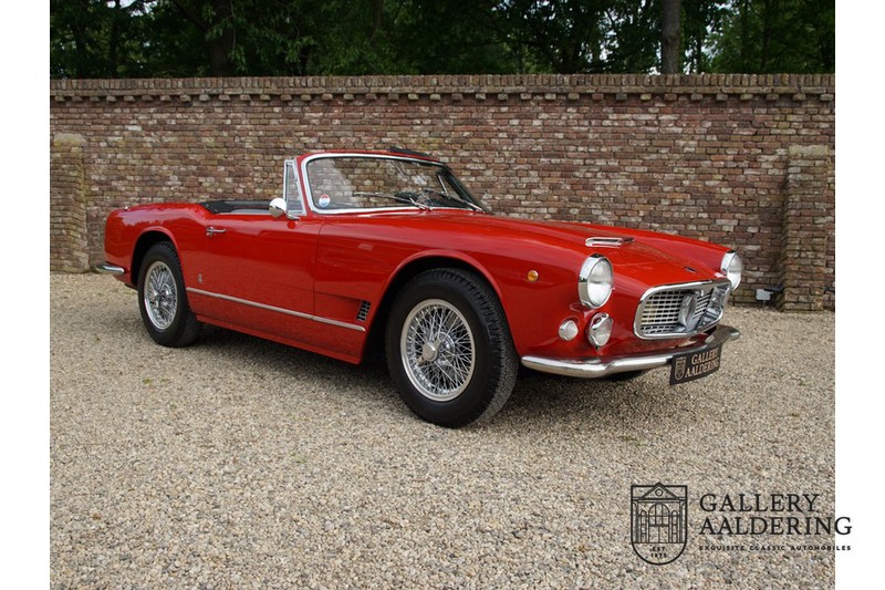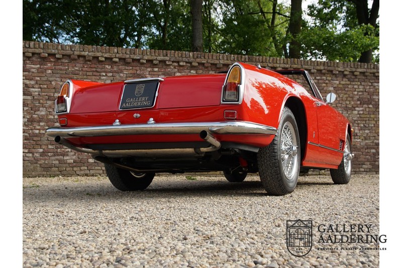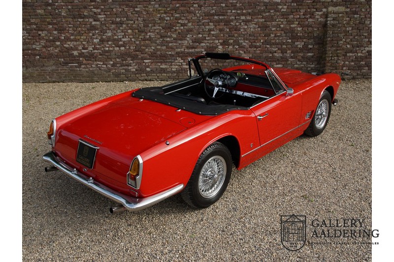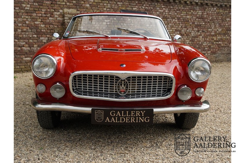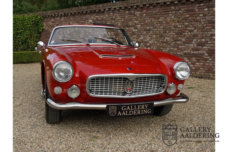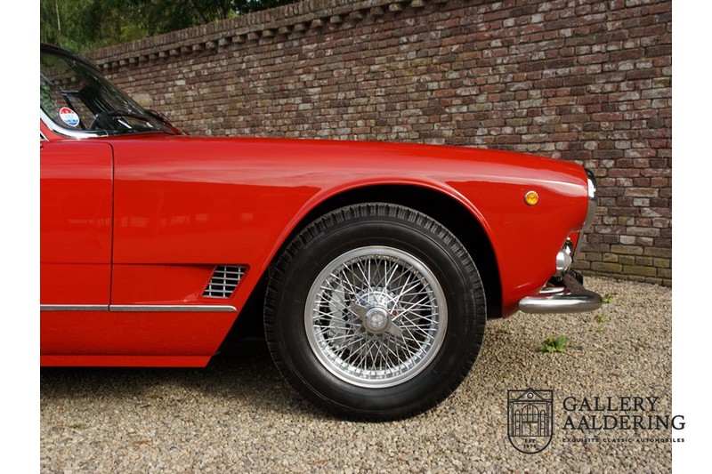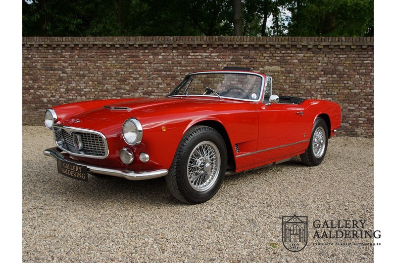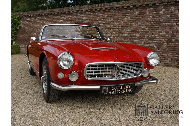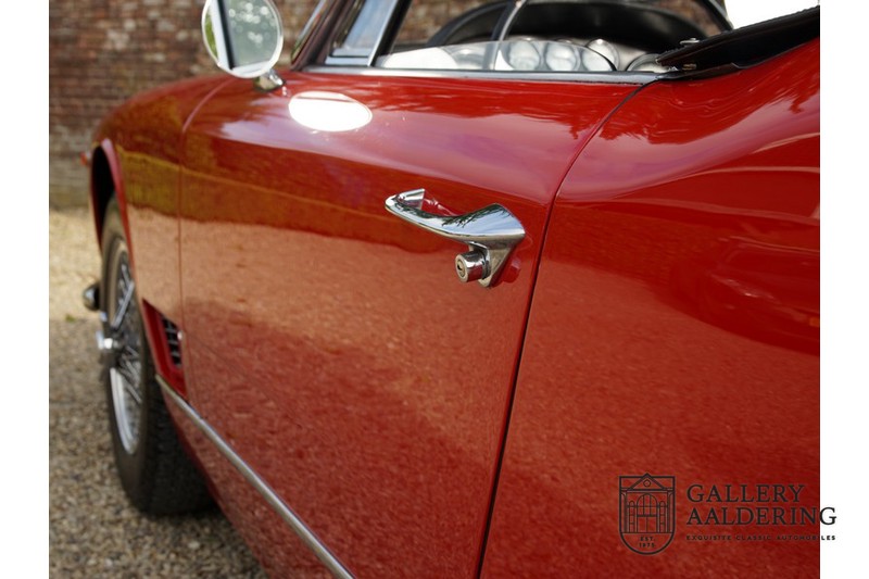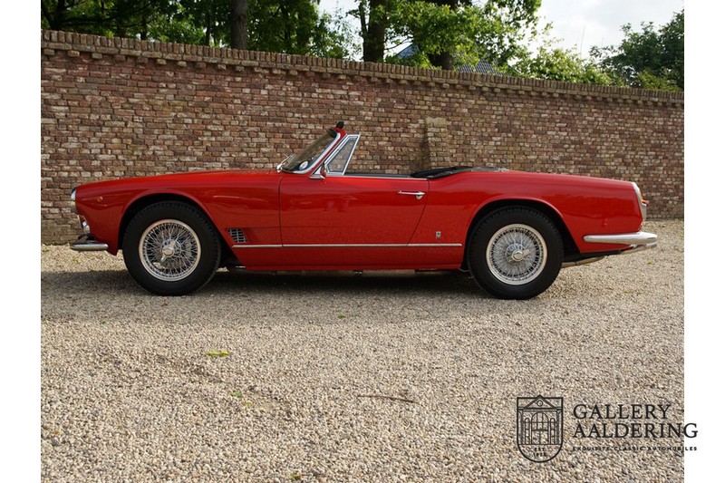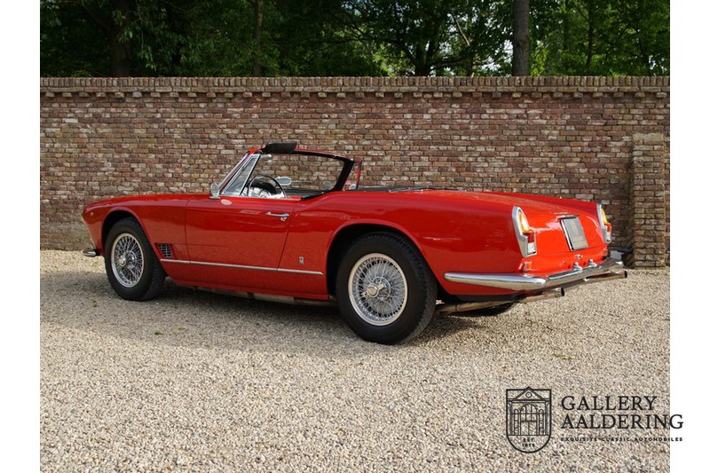 This wonderful Maserati 3500GT Vignale Spyder left the factory for the States on the 15th September 1960. This is one of just 242 Vignales ever made. It was only registered for the 1st time in 1976! In 1984 it was sold to a collector in Fort Lauderdale, Florida. Two years later the car made its way to a Dutch Maserati collector, who completely had the car completely restored. A superb result was achieved after 2years, much effort and expense. The beautiful bodywork is straight and has perfect fitting body panels. It has a delightful 5-speed ZF gearbox. After 20 years the car landed in the hands of its last owner. Early in 2018, a Dutch specialist optimized the cars’ performance with a full mechanical overhaul. Besides a full engine build, the whole suspension, brakes, water pump clutch were replaced. Since then the car has travelled some 30,000 km. The whole process has been documented with photos and invoices. It has factory fitted front disc brakes and 16” Borrani wire wheels. The Vignale Spyder has retained its original, matching numbers, engine. It also has a copy of the build-sheet confirming all relevant numbers. This rare Maserati is in top condition!
