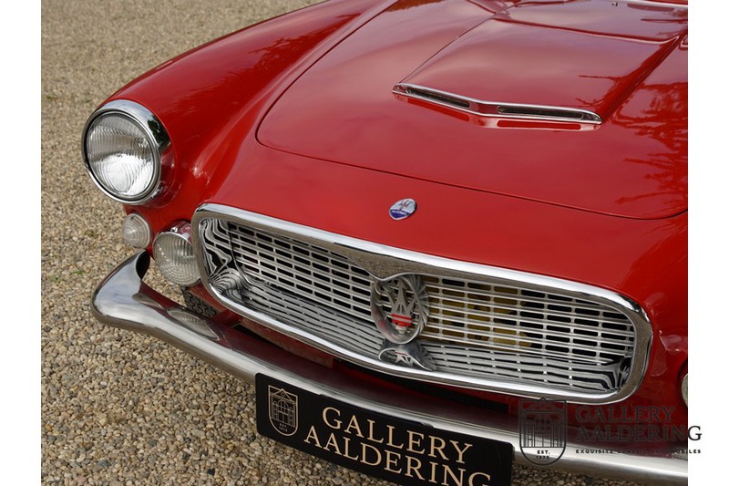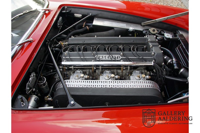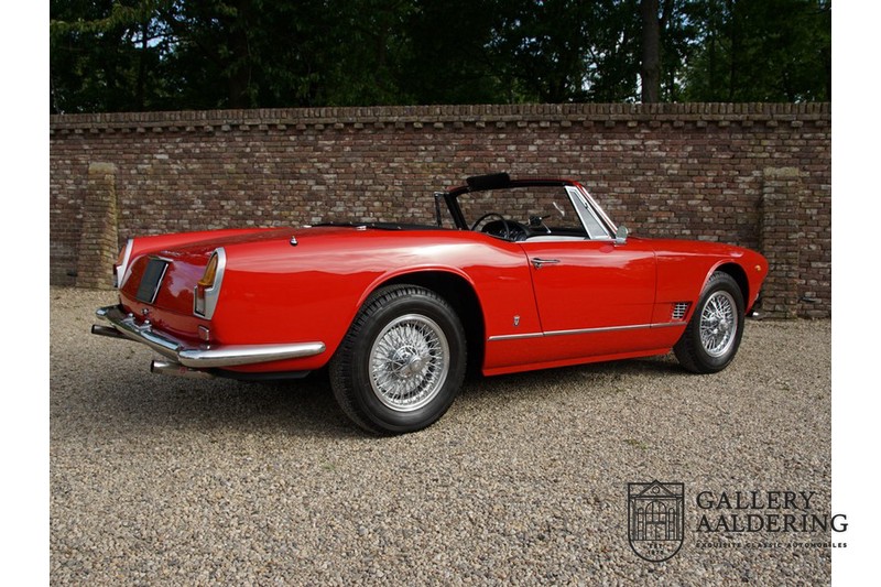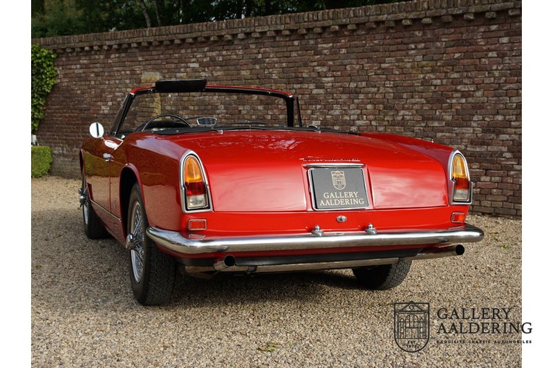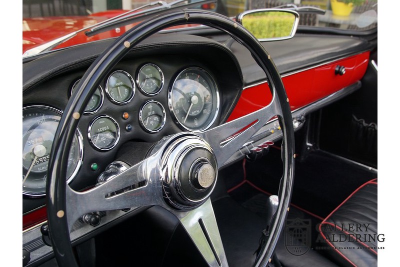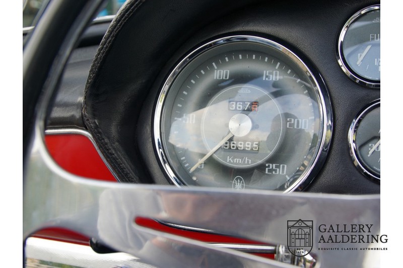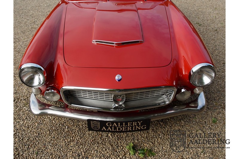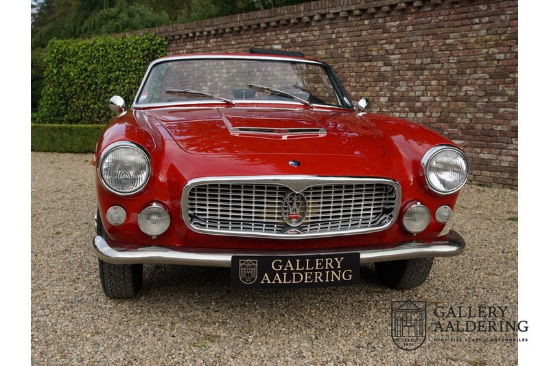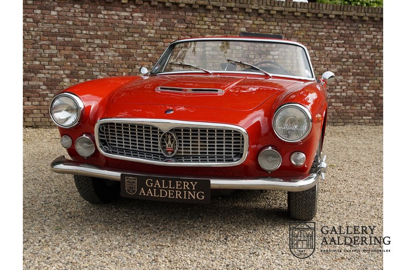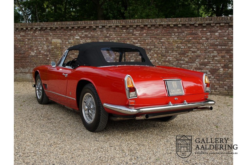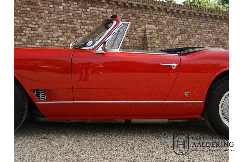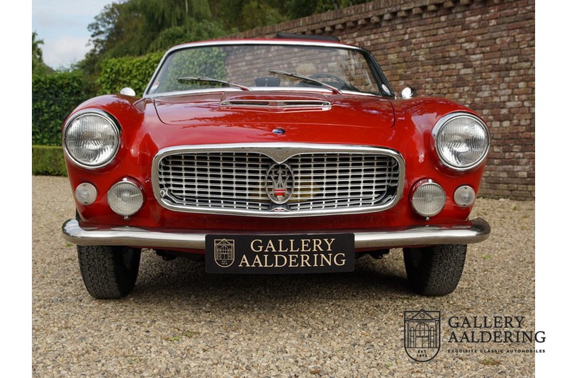 This wonderful Maserati 3500GT Vignale Spyder left the factory for the States on the 15th September 1960. This is one of just 242 Vignales ever made. It was only registered for the 1st time in 1976! In 1984 it was sold to a collector in Fort Lauderdale, Florida. Two years later the car made its way to a Dutch Maserati collector, who completely had the car completely restored. A superb result was achieved after 2years, much effort and expense. The beautiful bodywork is straight and has perfect fitting body panels. It has a delightful 5-speed ZF gearbox. After 20 years the car landed in the hands of its last owner. Early in 2018, a Dutch specialist optimized the cars’ performance with a full mechanical overhaul. Besides a full engine build, the whole suspension, brakes, water pump clutch were replaced. Since then the car has travelled some 30,000 km. The whole process has been documented with photos and invoices. It has factory fitted front disc brakes and 16” Borrani wire wheels. The Vignale Spyder has retained its original, matching numbers, engine. It also has a copy of the build-sheet confirming all relevant numbers. This rare Maserati is in top condition!