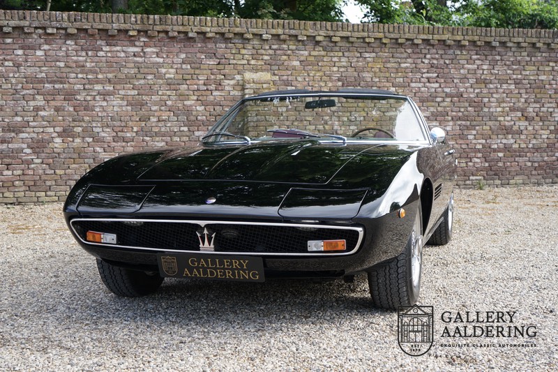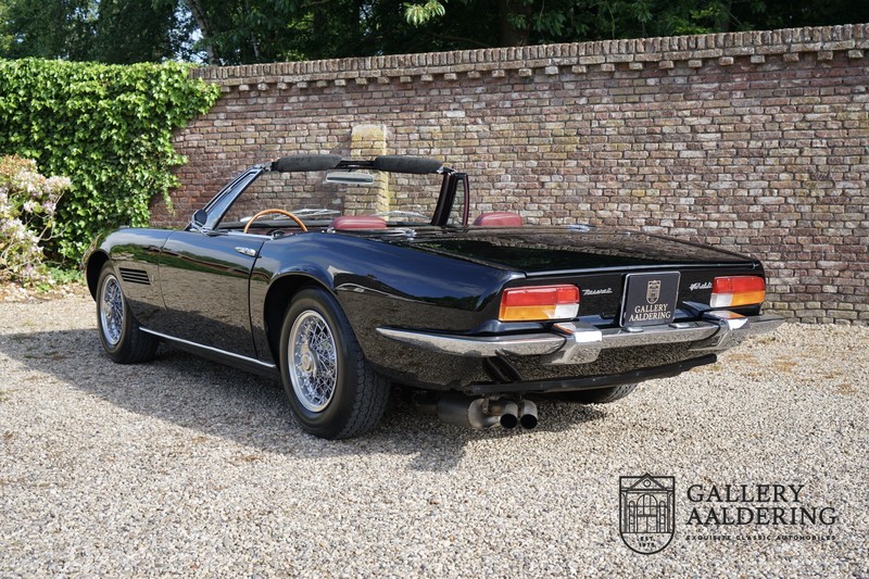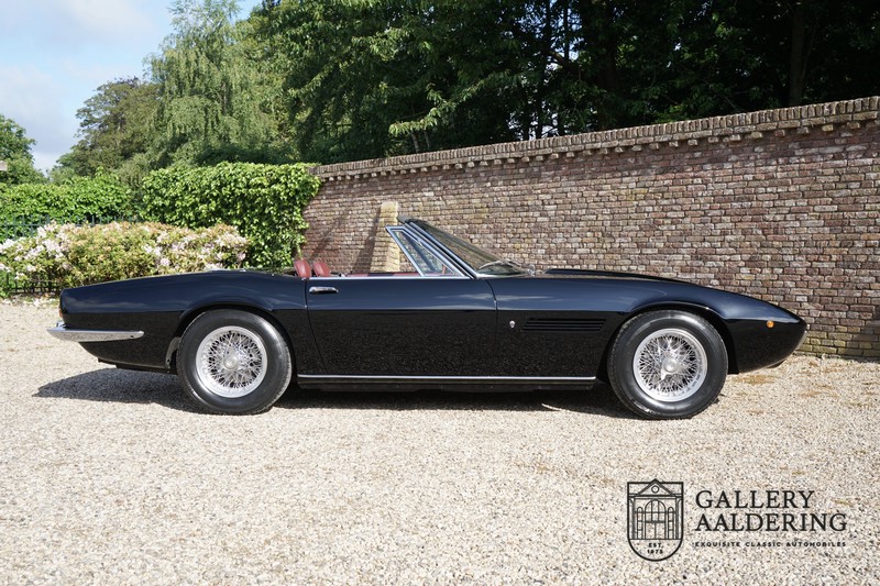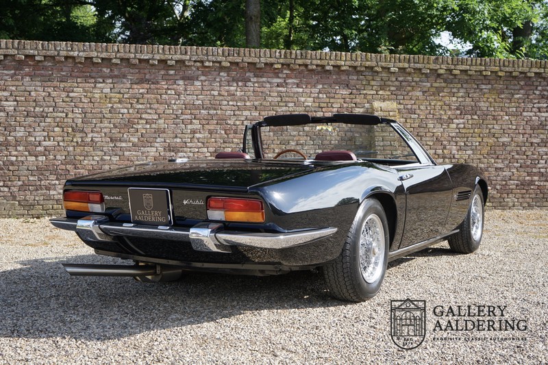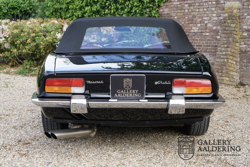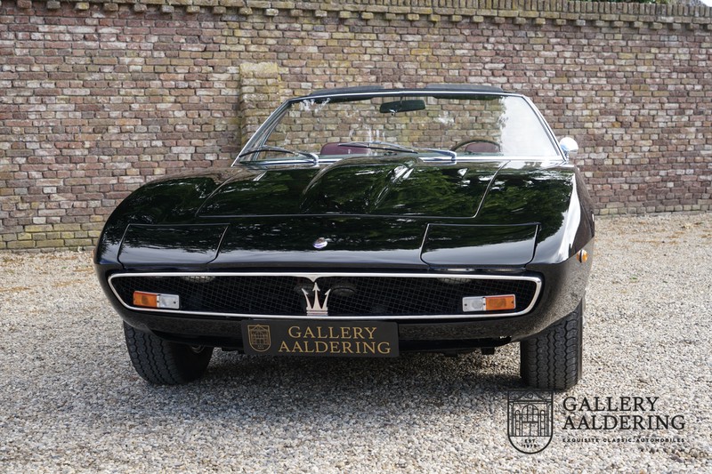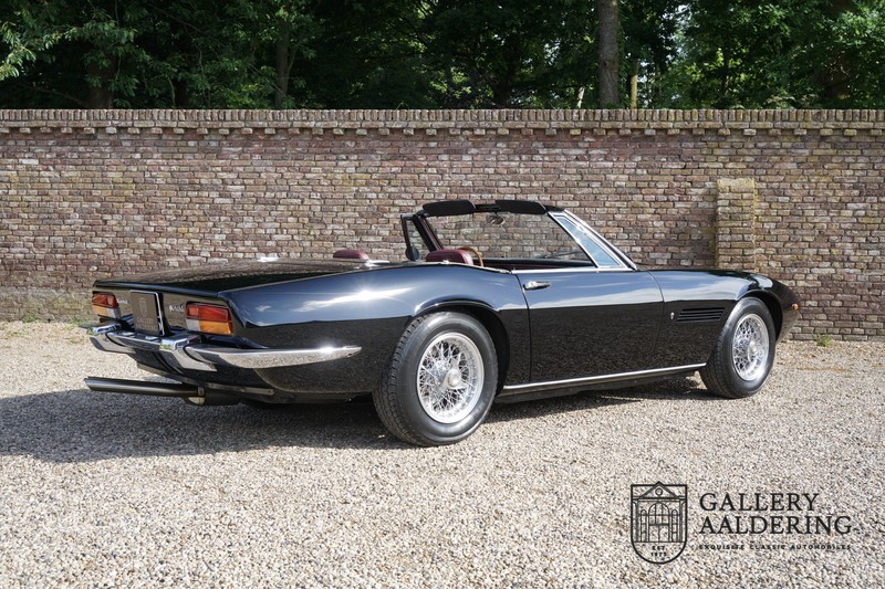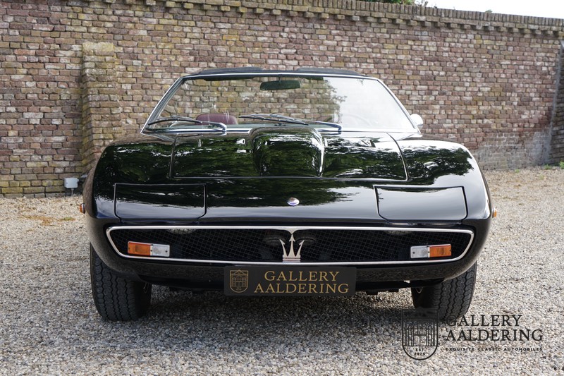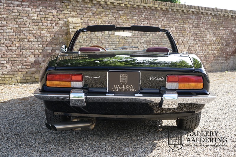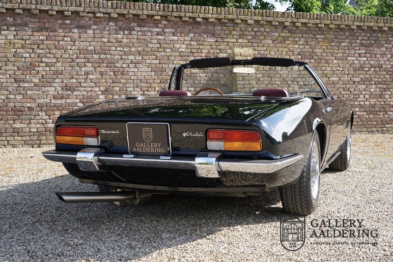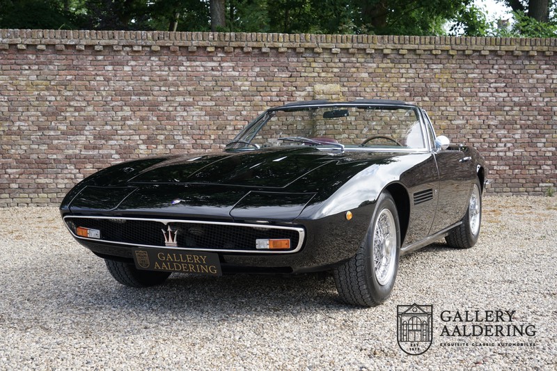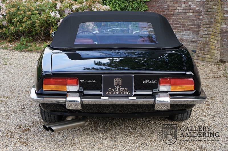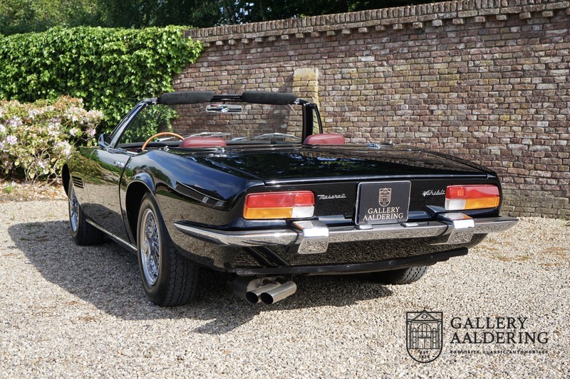 Maserati Ghibli 4.7 ´Campana´ Spider in a beautiful condition. Delivered new in Switzerland in July 1968. This is a Spider based on a coupé. Very professionally built by Carrozzeria Campana and has all correct known details! This example is in an exceptional good condition. A few years ago completely restored. The body is very straight and has correct panel fittings. Technically perfect and in a very good working and driving condition. The undercarriage is rock solid, free of rust and original. Equipped with her original so ´Matching Numbers´ engine. Performed in black with a gorgeous burgundy leather upholstery, black soft-top and central wheel lock rims. A stunning car in an even more stunning condition!