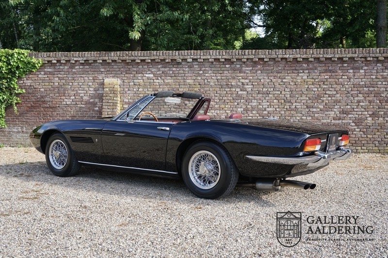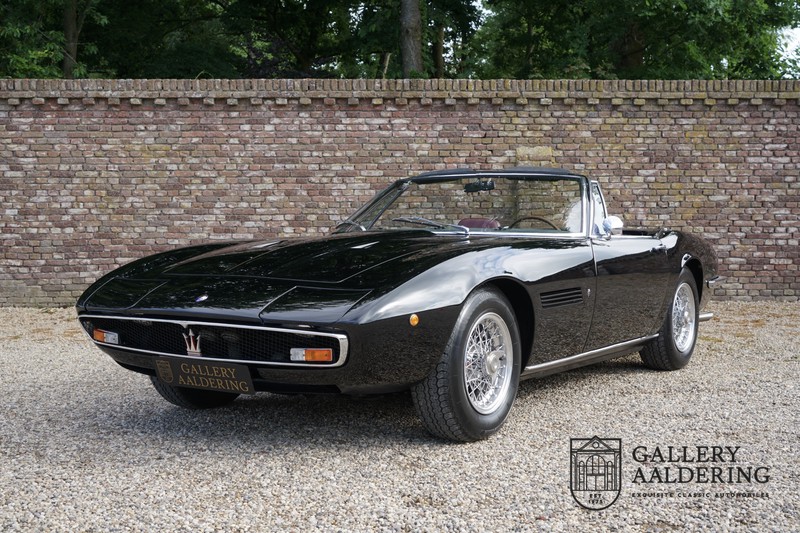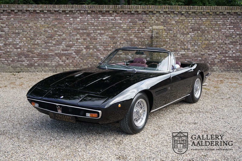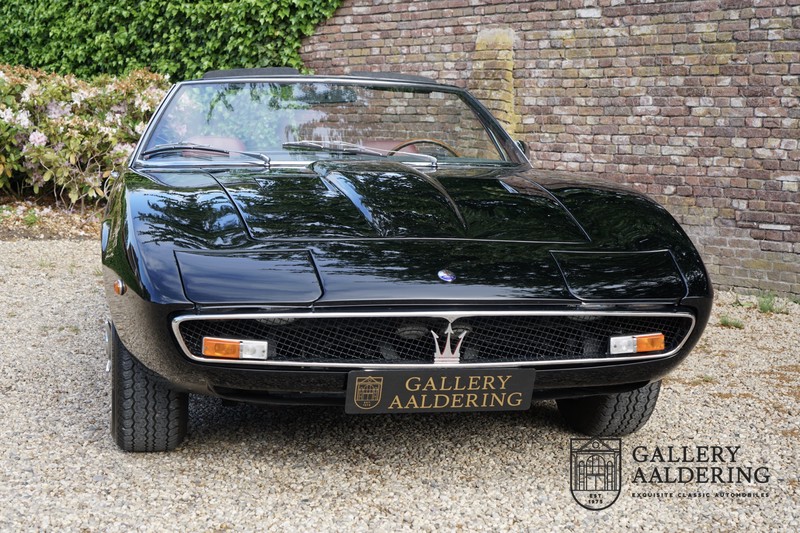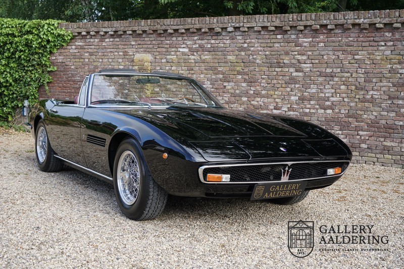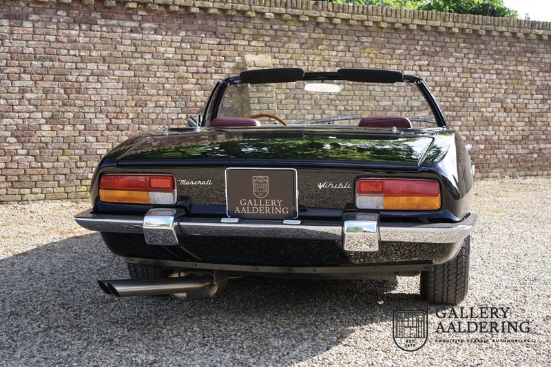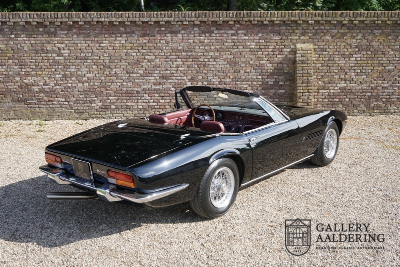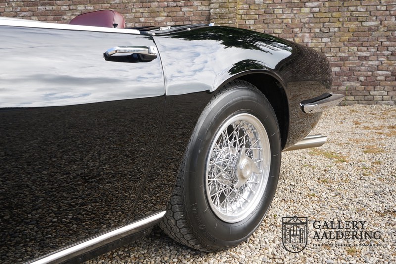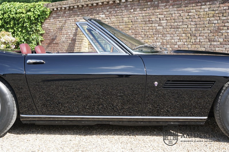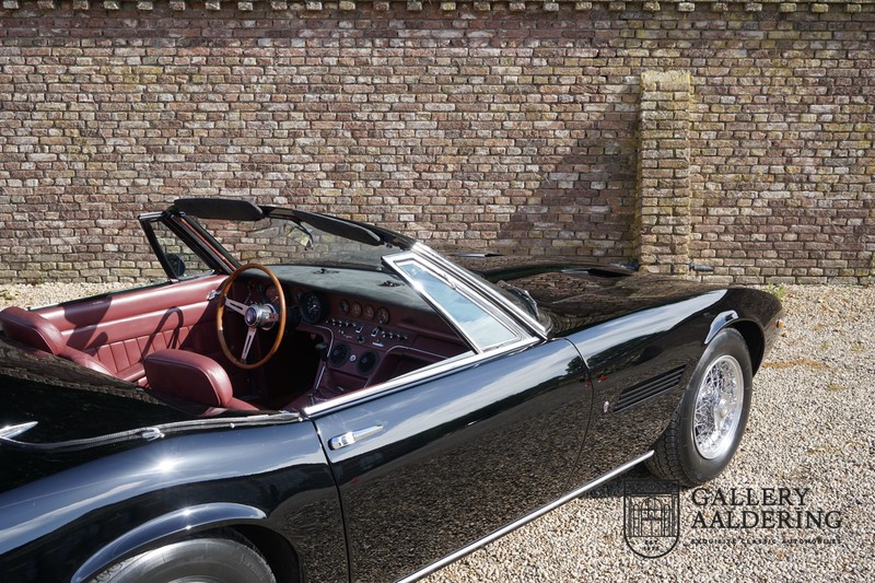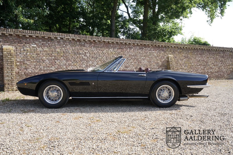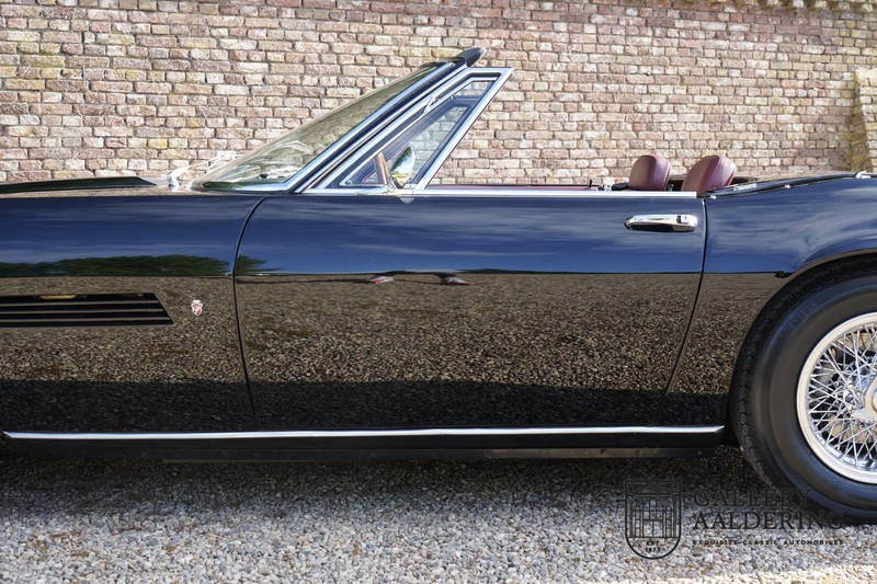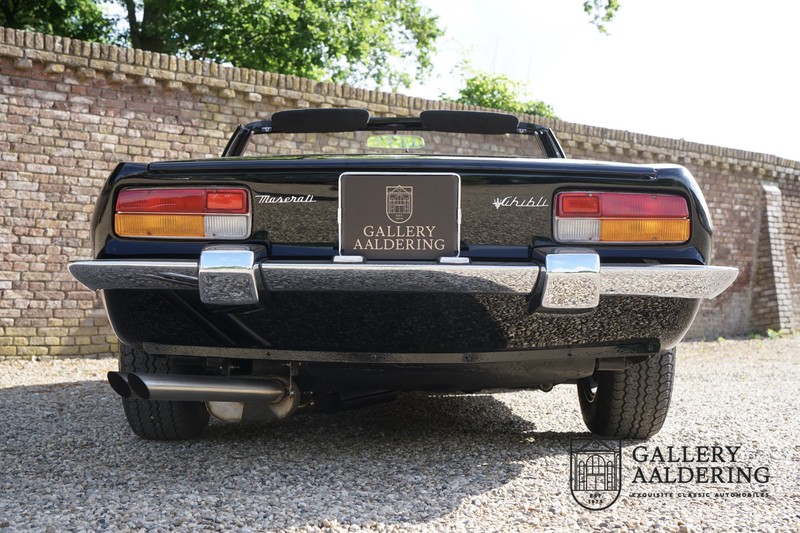 Maserati Ghibli 4.7 ´Campana´ Spider in a beautiful condition. Delivered new in Switzerland in July 1968. This is a Spider based on a coupé. Very professionally built by Carrozzeria Campana and has all correct known details! This example is in an exceptional good condition. A few years ago completely restored. The body is very straight and has correct panel fittings. Technically perfect and in a very good working and driving condition. The undercarriage is rock solid, free of rust and original. Equipped with her original so ´Matching Numbers´ engine. Performed in black with a gorgeous burgundy leather upholstery, black soft-top and central wheel lock rims. A stunning car in an even more stunning condition!