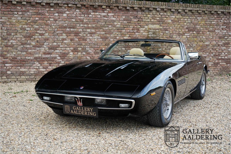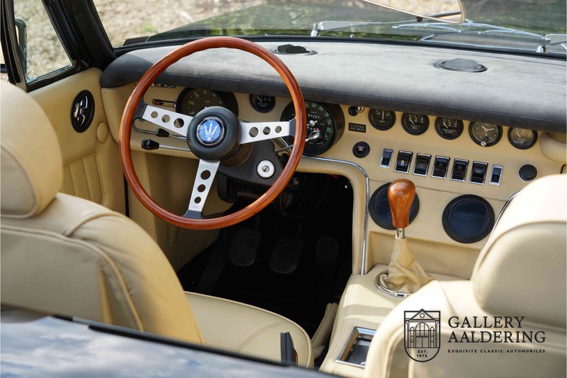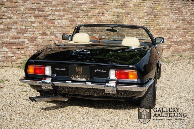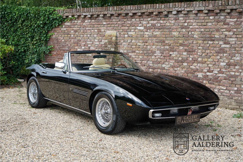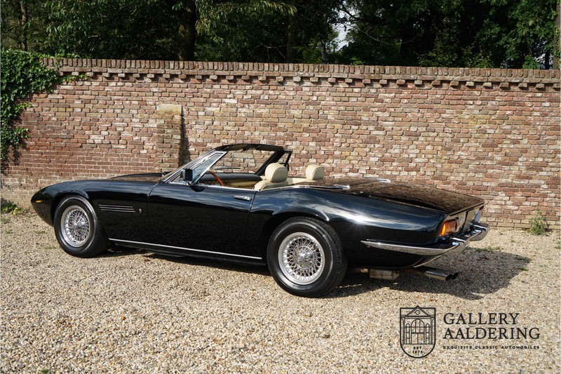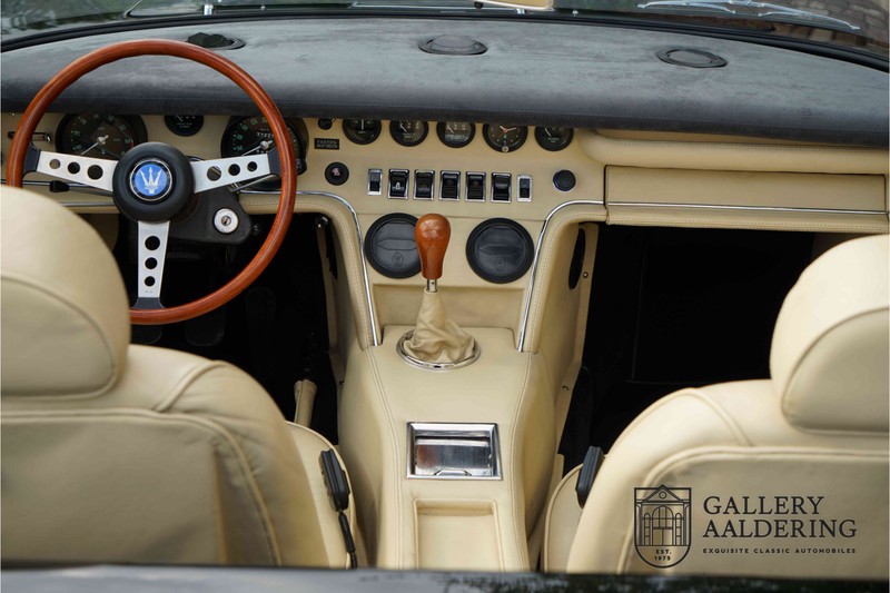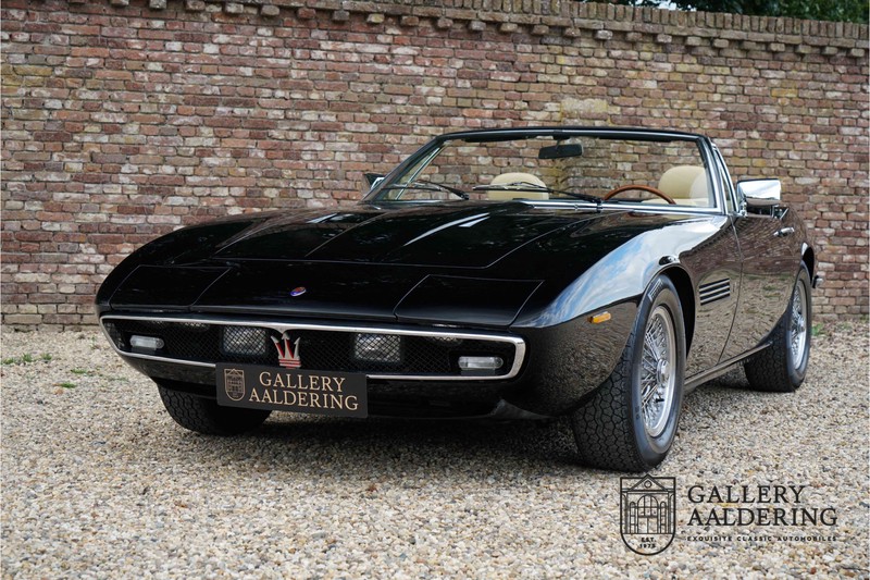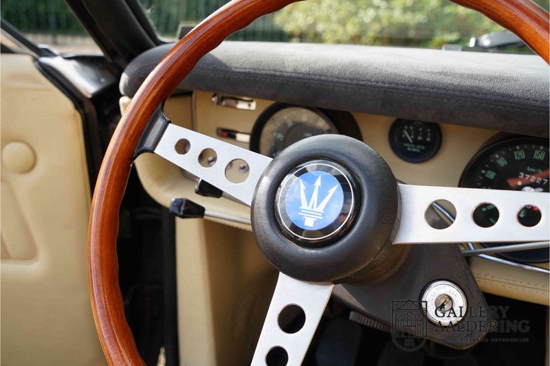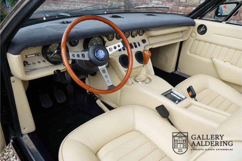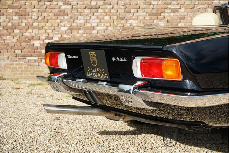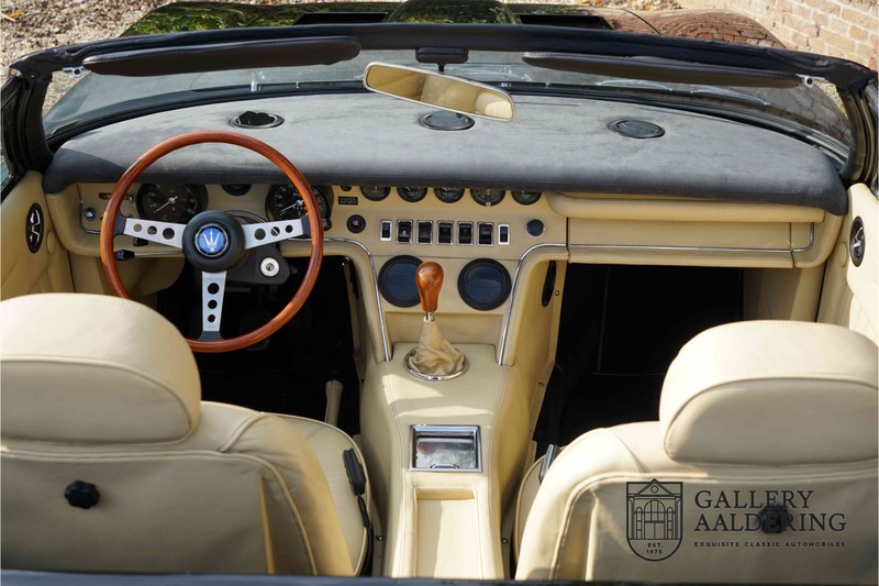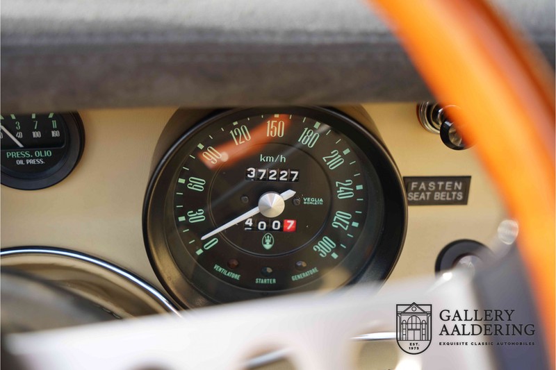 We have a wonderful 1971 Maserati Ghibli Spyder 4.7 “Campana”. The Campana is a bit of the oddity. Campana was a coach builder that was able to build a Spyder on the base of a Maserati Ghibli coupé. In first instance Maserati itself commissioned the Spyder conversion building a total of 125 spiders which 45 Ghibli SS Spyders. Costs forced Maserati to stop contracting the coupé to Spyder conversion out to Campana. As a consequence potential buyers could no longer order a Ghibli Spyder from Maserati, so they took their coupés to Campana themselves. This Ghibli Spyder is in great shape. The car has recently been completely re-sprayed. During this process some minor bodywork repairs were also carried out. The resulting effect is excellent. The fine bodywork has nice and thin, correctly aligned panelwork. It has good quality paintwork with only a few minor signs of use. The car proudly stands on its lovely Borrani wire wheels with nearly new correctly sized Pirelli P4000 tyres. The hood is in good condition with only minor signs of wear. It has lovely good quality beige leather interior trim. Naturally the switches and instruments are in as good a condition as the rest of the cabin and all in good working order. Mechanically the car is also very sound. The Ghibli has a 4.7 V8 engine coupled to a ZF 5-speed gearbox. The engine produces 310 Hp, good for zero to 100 km/hr in 6.9 sec and a top of 250 km/hr. Not to shabby in a current car, stratospherically fast for 1971! With only 37,218 km on the clock the car has never needed a rebuild, just good maintenance and servicing. That this Ghibli has been treated properly is evident from the invoices dating back 5 years. €13,500 was invested in keeping the car trim. The fantastic 4.7 litre V8 engine’s soundtrack is a joy in the coupé, remove the roof at your enjoyment will only multiply! The Maserati Ghibli is whatever guise a rare beast, one in this condition and a Spyder to boot is the pinnacle! Gallery Aaldering is Europe’s leading Classic Cars specialist since 1975! Always 400 Classic and Sportscars in stock, please visit www.gallery-aaldering.com for the current stock list (all offered cars are available in our showroom) and further information. We are located near the German border, 95 km from Düsseldorf and 90 km from Amsterdam. So easy traveling by plane, train, taxi and car. Transport and worldwide shipping can be arranged. No duties/import costs within Europe. We buy, sell and provide consignment sales (selling on behalf of the owner). We can arrange/provide registration/papers for our German (H-Kennzeichen, TÜV, Fahrzeugbrief, Wertgutachten usw.) and Benelux customers. Gallery Aaldering, Arnhemsestraat 47, 6971 AP Brummen, The Netherlands. Tel: 0031-575-564055. Quality, experience and transparency is what sets us apart. We look forward to welcoming you in our showroom