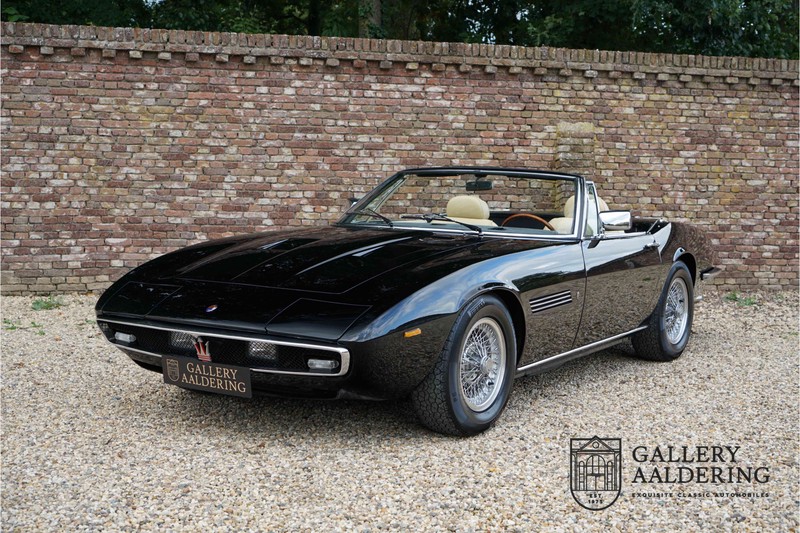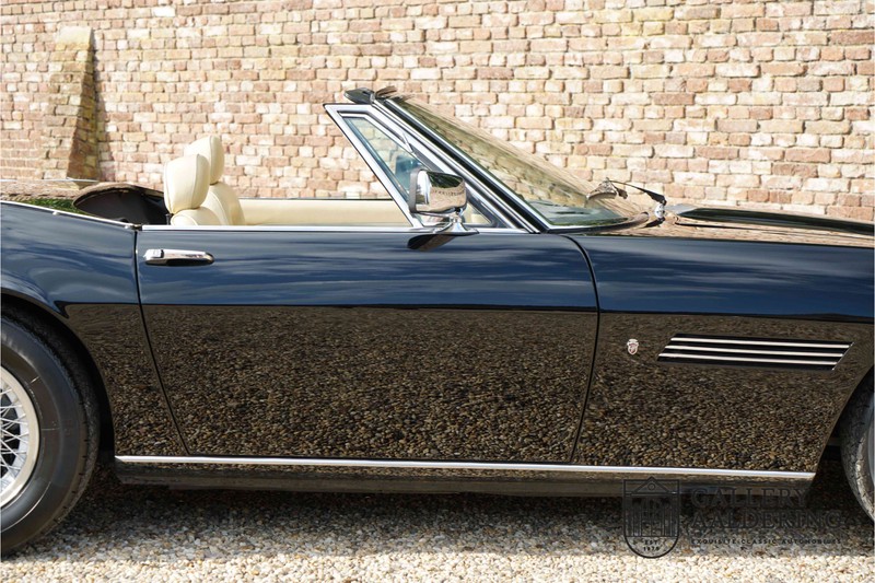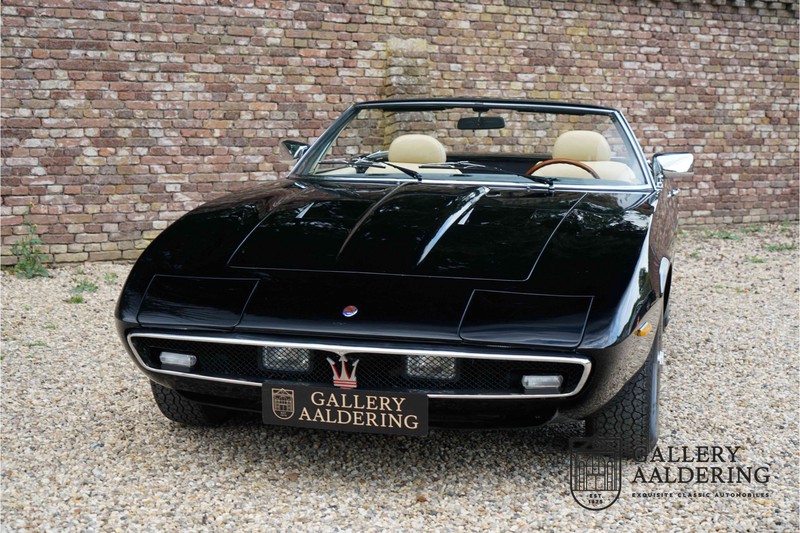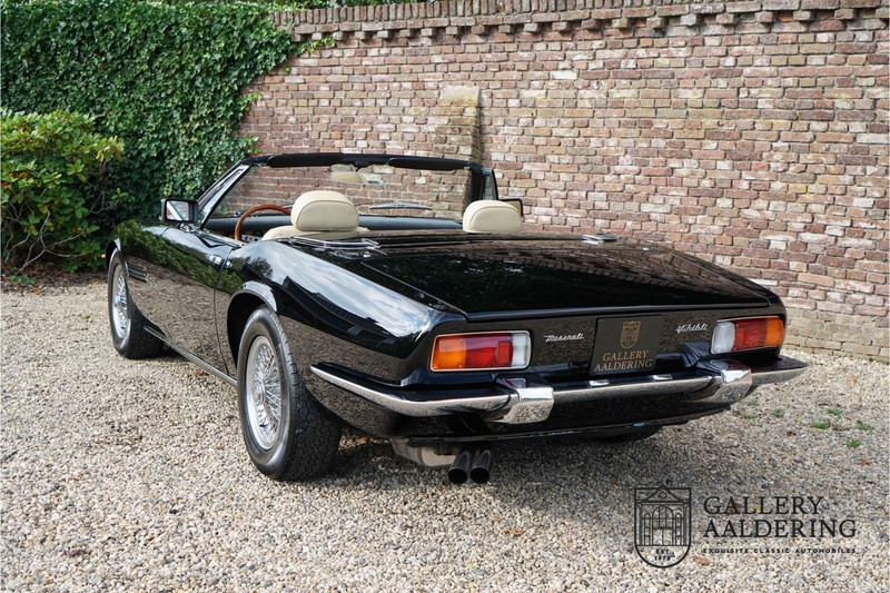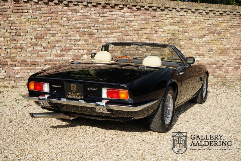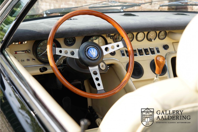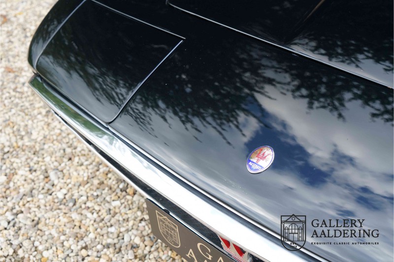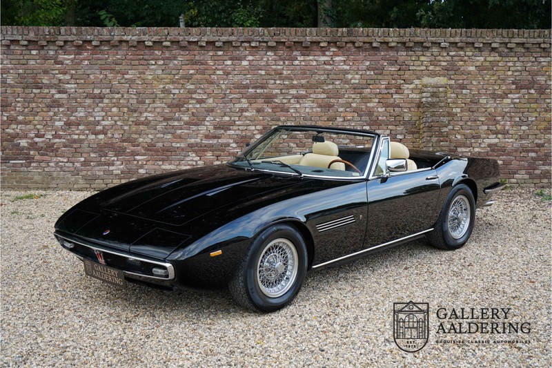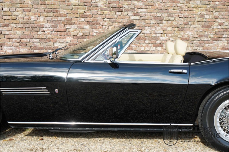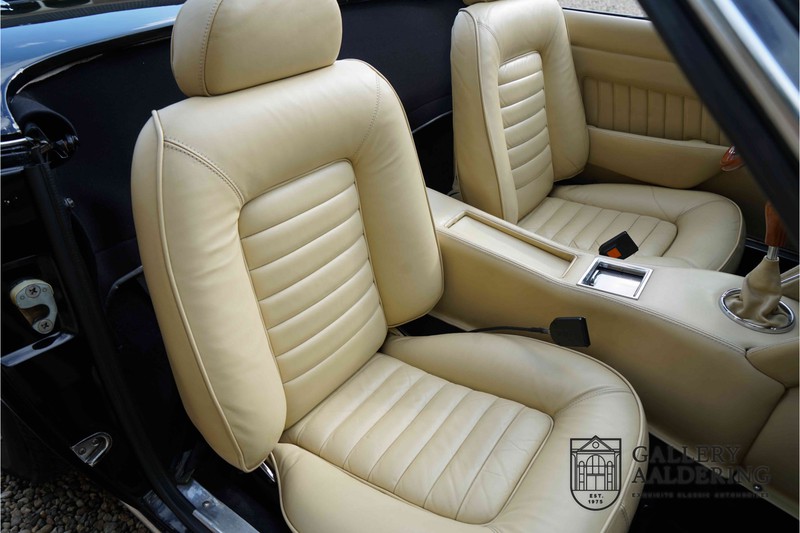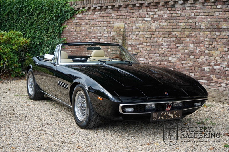 We have a wonderful 1971 Maserati Ghibli Spyder 4.7 “Campana”. The Campana is a bit of the oddity. Campana was a coach builder that was able to build a Spyder on the base of a Maserati Ghibli coupé. In first instance Maserati itself commissioned the Spyder conversion building a total of 125 spiders which 45 Ghibli SS Spyders. Costs forced Maserati to stop contracting the coupé to Spyder conversion out to Campana. As a consequence potential buyers could no longer order a Ghibli Spyder from Maserati, so they took their coupés to Campana themselves. This Ghibli Spyder is in great shape. The car has recently been completely re-sprayed. During this process some minor bodywork repairs were also carried out. The resulting effect is excellent. The fine bodywork has nice and thin, correctly aligned panelwork. It has good quality paintwork with only a few minor signs of use. The car proudly stands on its lovely Borrani wire wheels with nearly new correctly sized Pirelli P4000 tyres. The hood is in good condition with only minor signs of wear. It has lovely good quality beige leather interior trim. Naturally the switches and instruments are in as good a condition as the rest of the cabin and all in good working order. Mechanically the car is also very sound. The Ghibli has a 4.7 V8 engine coupled to a ZF 5-speed gearbox. The engine produces 310 Hp, good for zero to 100 km/hr in 6.9 sec and a top of 250 km/hr. Not to shabby in a current car, stratospherically fast for 1971! With only 37,218 km on the clock the car has never needed a rebuild, just good maintenance and servicing. That this Ghibli has been treated properly is evident from the invoices dating back 5 years. €13,500 was invested in keeping the car trim. The fantastic 4.7 litre V8 engine’s soundtrack is a joy in the coupé, remove the roof at your enjoyment will only multiply! The Maserati Ghibli is whatever guise a rare beast, one in this condition and a Spyder to boot is the pinnacle! Gallery Aaldering is Europe’s leading Classic Cars specialist since 1975! Always 400 Classic and Sportscars in stock, please visit www.gallery-aaldering.com for the current stock list (all offered cars are available in our showroom) and further information. We are located near the German border, 95 km from Düsseldorf and 90 km from Amsterdam. So easy traveling by plane, train, taxi and car. Transport and worldwide shipping can be arranged. No duties/import costs within Europe. We buy, sell and provide consignment sales (selling on behalf of the owner). We can arrange/provide registration/papers for our German (H-Kennzeichen, TÜV, Fahrzeugbrief, Wertgutachten usw.) and Benelux customers. Gallery Aaldering, Arnhemsestraat 47, 6971 AP Brummen, The Netherlands. Tel: 0031-575-564055. Quality, experience and transparency is what sets us apart. We look forward to welcoming you in our showroom