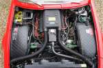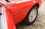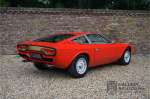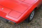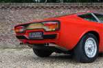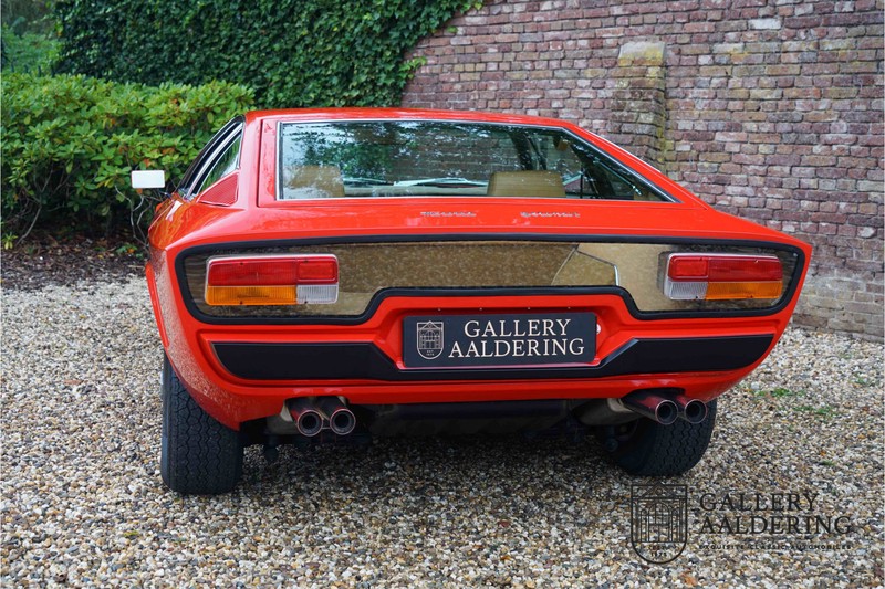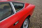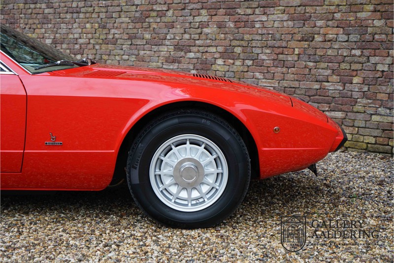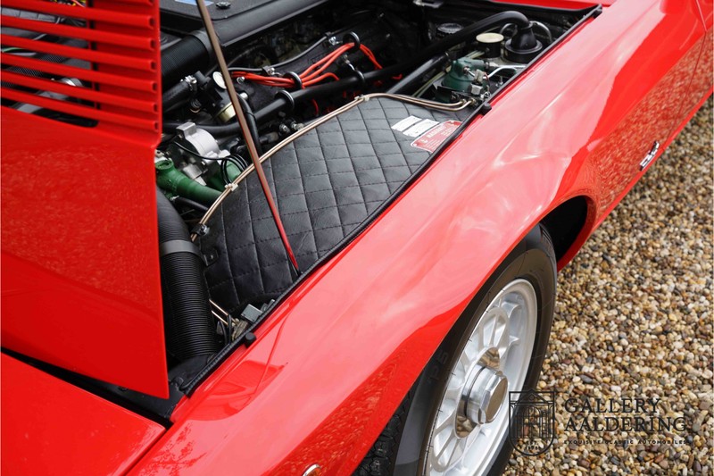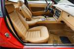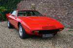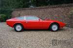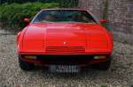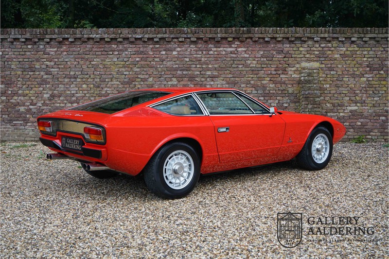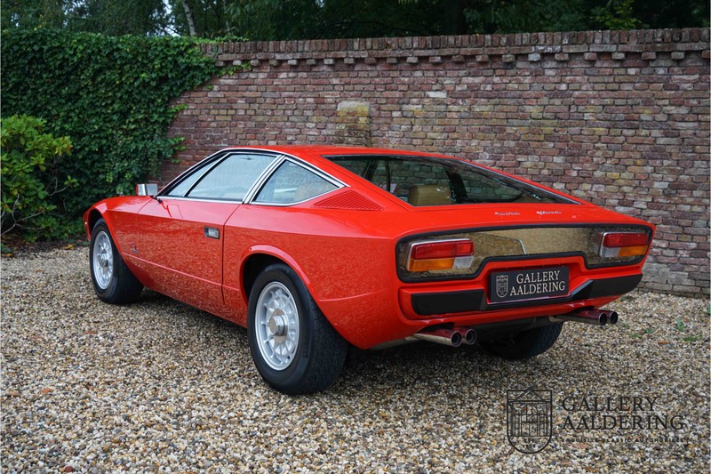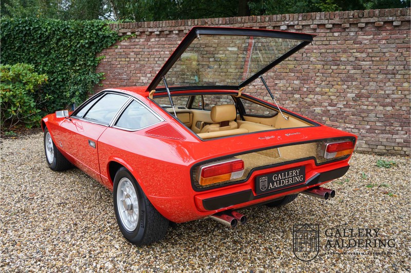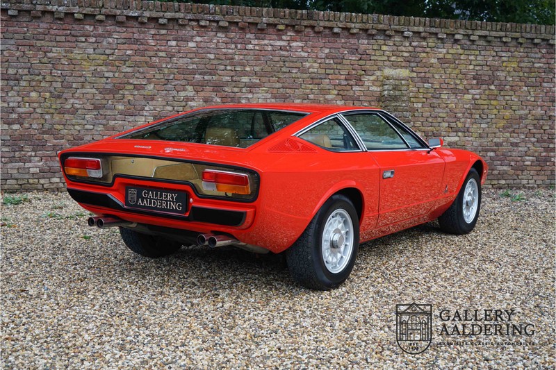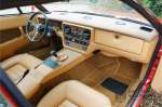 What a sight! When do you last see a Khamsin? Have you ever seen one? The Maserati Khamsin is the ultimate 70’s Grand Tourer; it was Maserati’s take on how to travel through Europe at speed. This example is probably the most perfect Khamsin specimen in the whole world. This 1977 Maserati only has 14,275 km on the clock and is pristine. Lets start with a brief history on how and why this model was developed. Bertone received its first commission to design a Maserati in 1972. A concept study of the Khamsin was shown at the 1972 Turin car show to the general public on Bertone’s stand. It had an enthusiastic reception and in March 1973 the production model was unveiled on the Maserati stand at the Paris car show. The Khamsin was presented as the successor to the Maserati Ghibli. At the same time as the Khamsin, Maserati also had the Bora in its array. The Bora was seen more as a sports car rather than a Grand tourer due to its mid-engine configuration behind the front seats. The Khamsin overcame this problem with its front-mid engine. To top it all the Khamsin was also a 2+2 and considering its size had a decent boot. Whilst the Khamsin had all the markings of success, the oil crisis put paid to its sales with eventually only 435 cars sold. In 2000 this Khamsin was perfectly restored. The car has a splendid Rosso Fuoco finish with Tan interior trim. One can readily appreciate the thoroughness of the work carried out. The bodywork is in wonderful shape. The perfect panelwork aligns superbly. The unblemished paintwork is perfect. The cabin is also in perfect condition. The “Tan” leather upholstery and matching carpets are pristine. Even though a particularly onerous job, the suede dashboard covering was also replaced rather than being substituted with leather. The suede dashboard covering typifies the Khamsin, but is often ignored in lesser restorations. All switches and instruments are in pristine condition and excellent working order. The Khamsin is a rare beast at the best of times, but you would be hard put to find a better example. Mechanically the car has also been thoroughly taken in hand. The engine, transmission, the differential, brakes and suspension and basically everything else has fully been overhauled. The effect is certainly noticeable when on the road. The 4.9litre AM 115 V8 engine produces 330 Hp at 5,500 revs and 482 Nm of torque at 4,000 revs. The engine has 4 twin Webers and is sited lovely and low in the chassis thanks to a dry-sump system. It also has a 5-speed ZF gearbox. The engine runs fabulously and always has more than ample torque available in its large bore and perfectly