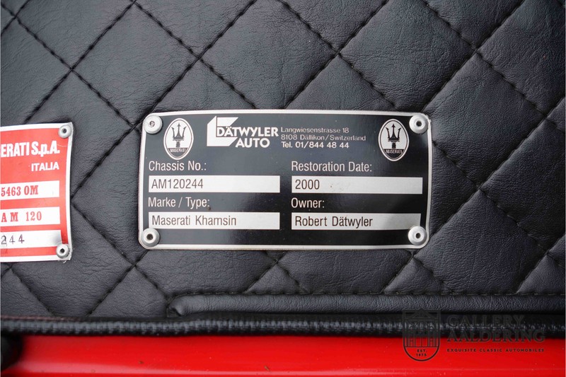 tuned Webers. The transmission is so good that you get the sensation of having just left the Maserati dealership in 1977 in your brand new Khamsin. Strangely enough the car was not used much after the restoration, which has only help preserve it exceptional condition. Although it was not driven a lot, that certainly did not mean that regular maintenance was ignored. There are recent invoices detailing this and it has recently had four new tyres fitted to the correct factory specification.